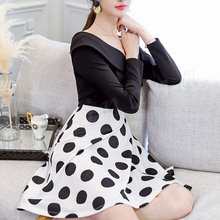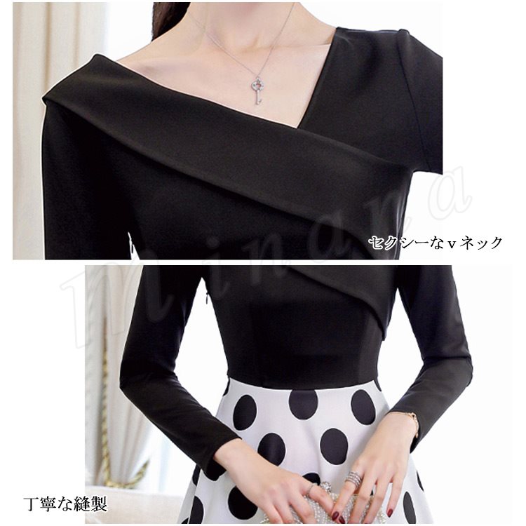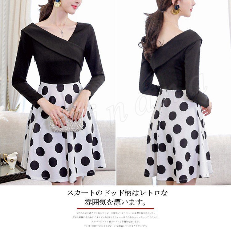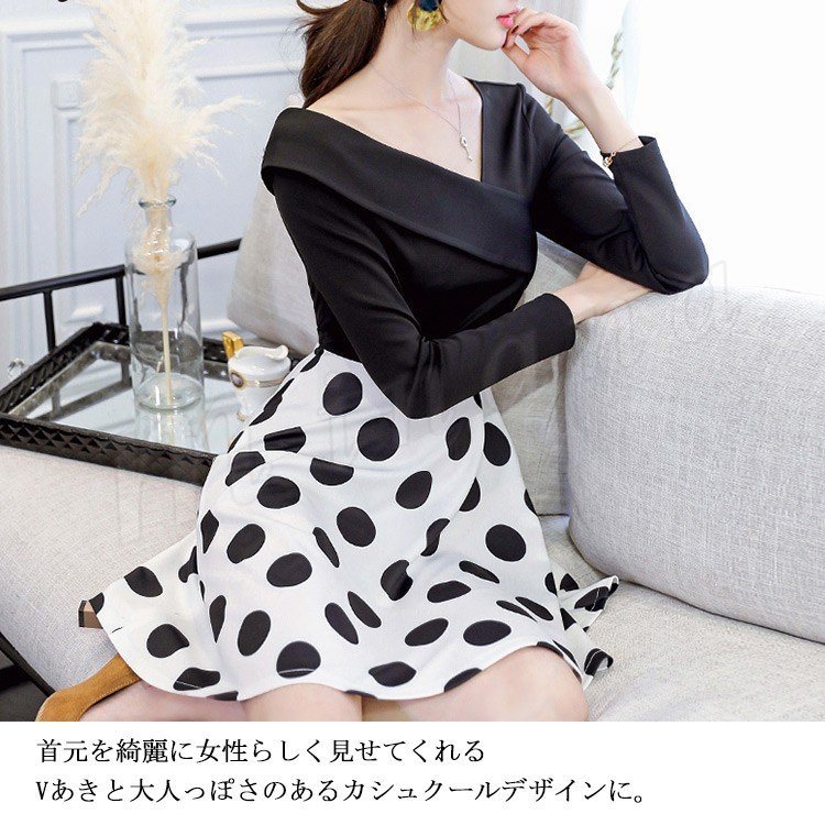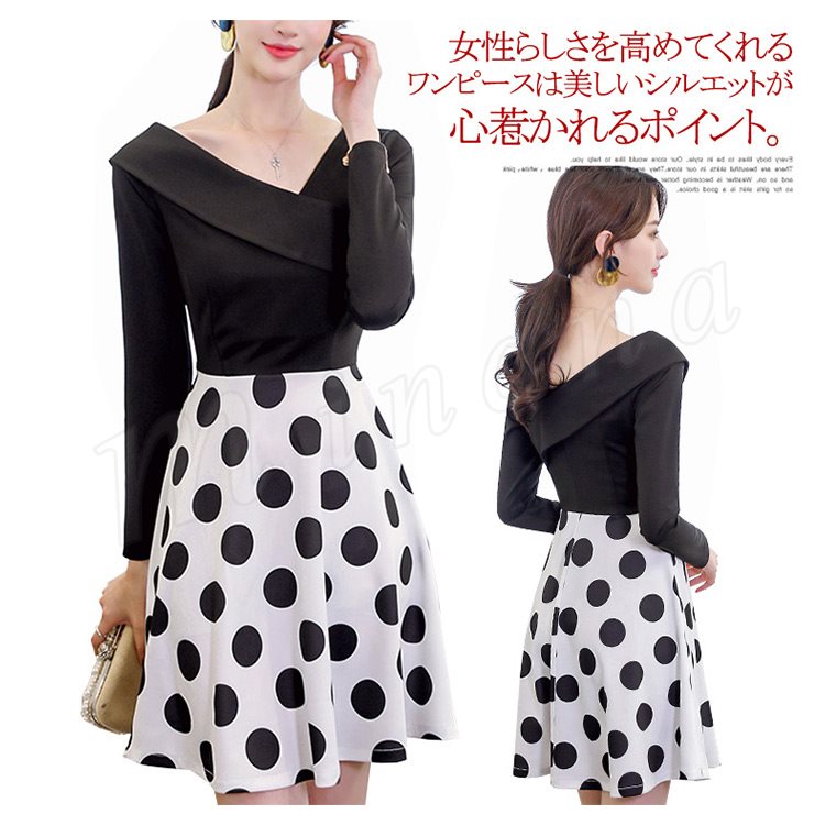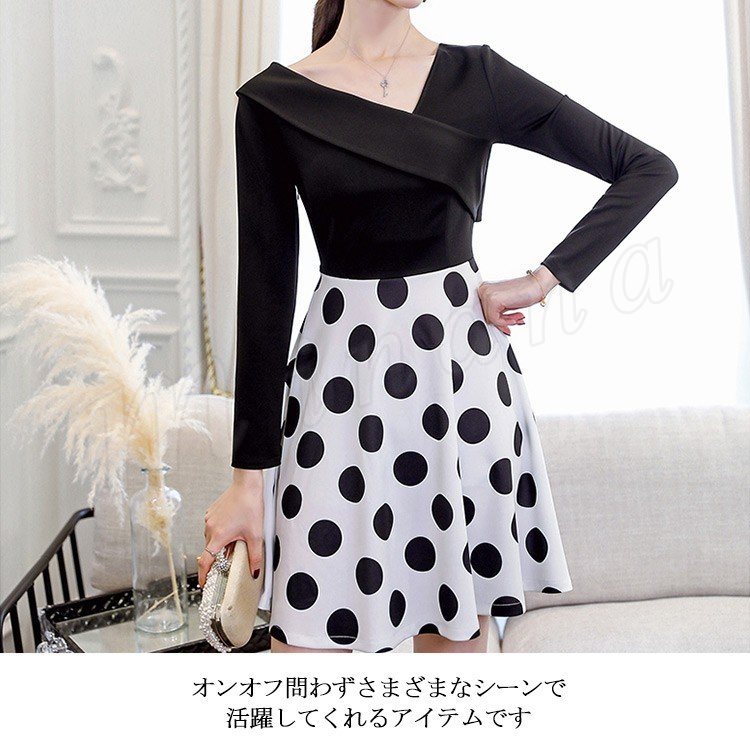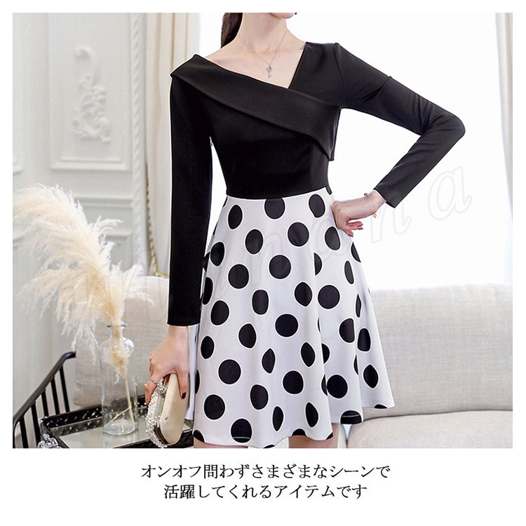 レディースドッキングワンピース フォーマルワンピース Aラインワンピース ドッド柄 長袖 フレアワンピース おしゃれ ミニ丈 デート 可愛い 大人
