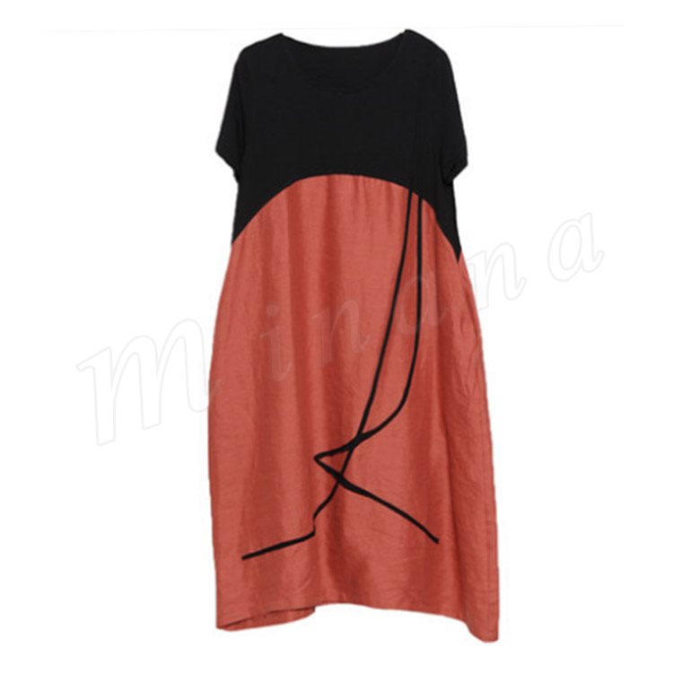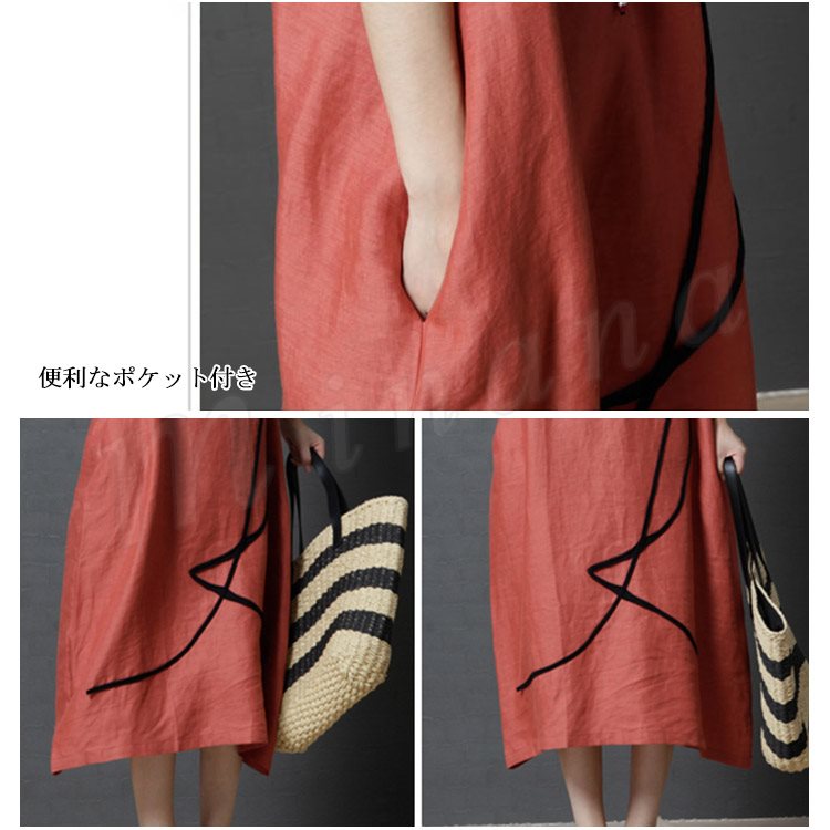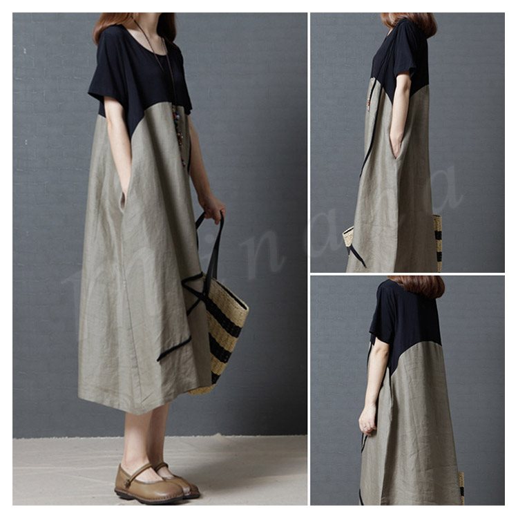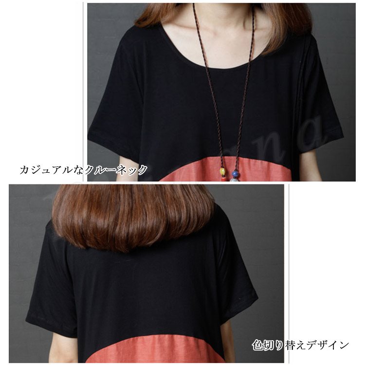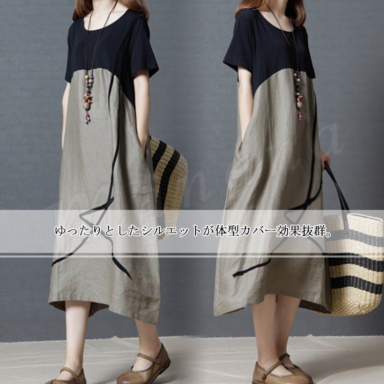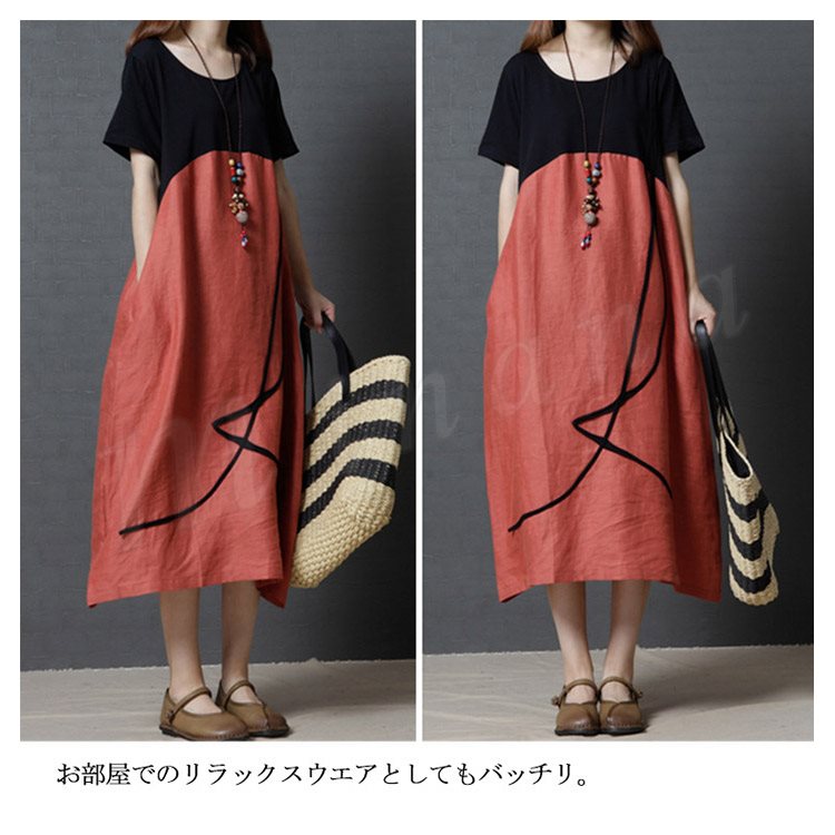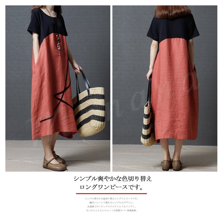 リネンワンピース レディース マキシワンピース ロングワンピース 大きいサイズ 色切り替えワンピース 半袖 薄手 ゆったり カジュアル お洒落