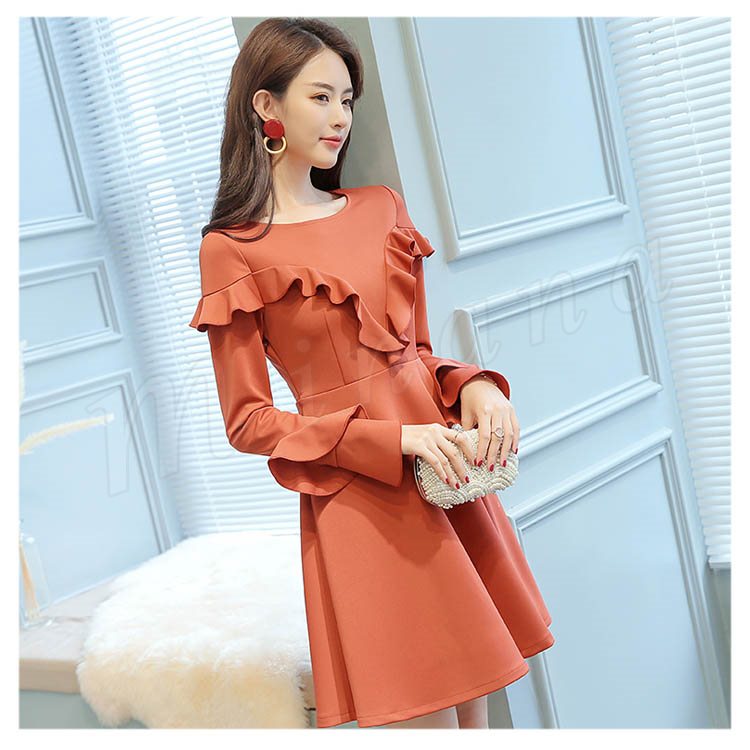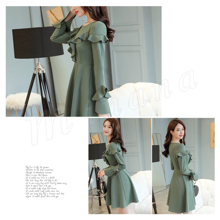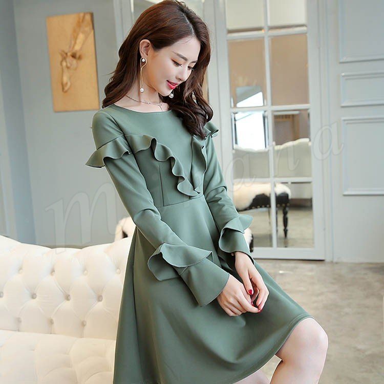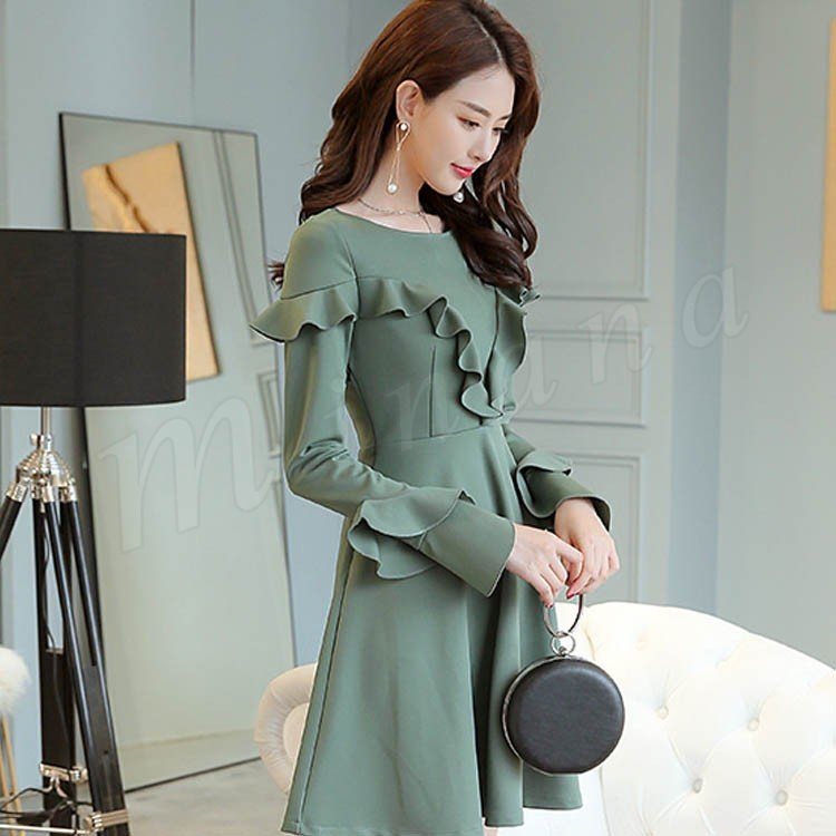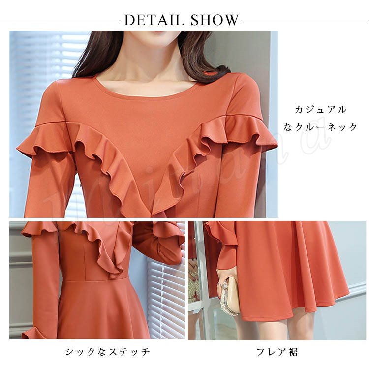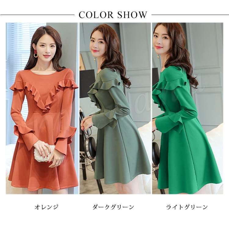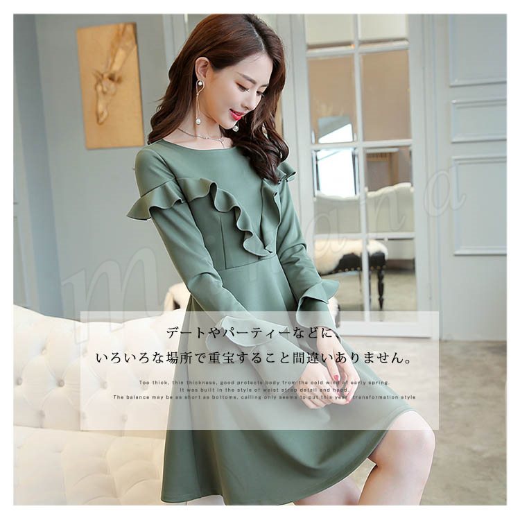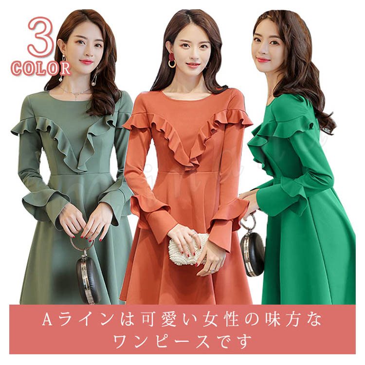 ワンピース フレアワンピース Aラインワンピース 長袖 クルーネック レディース 大きいサイズ 無地 ひざ丈 きれいめ 着痩せ 通勤 OL パ