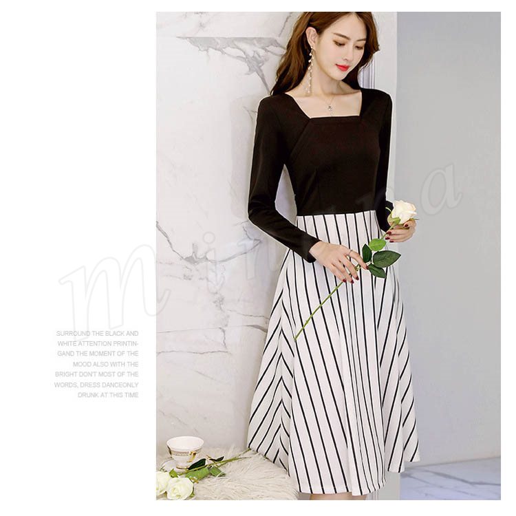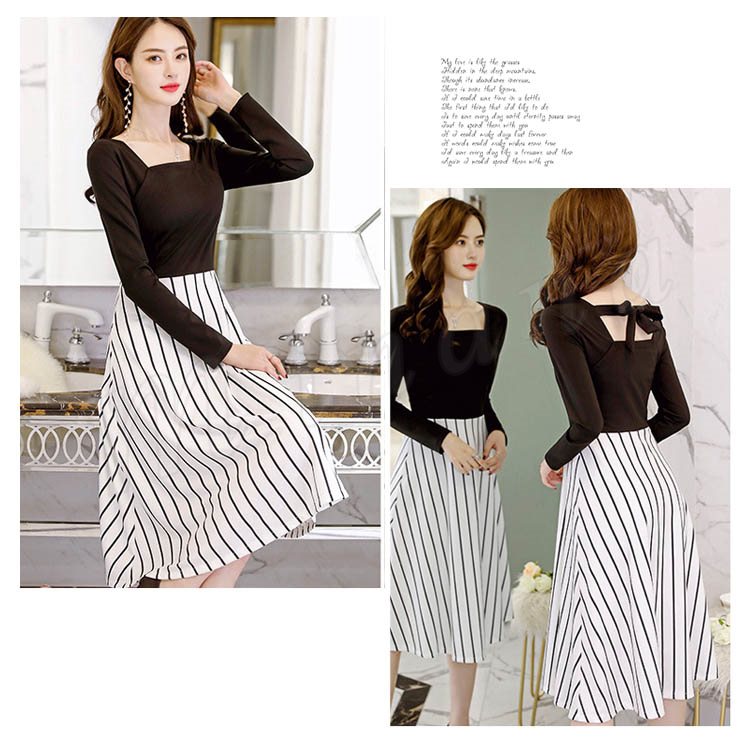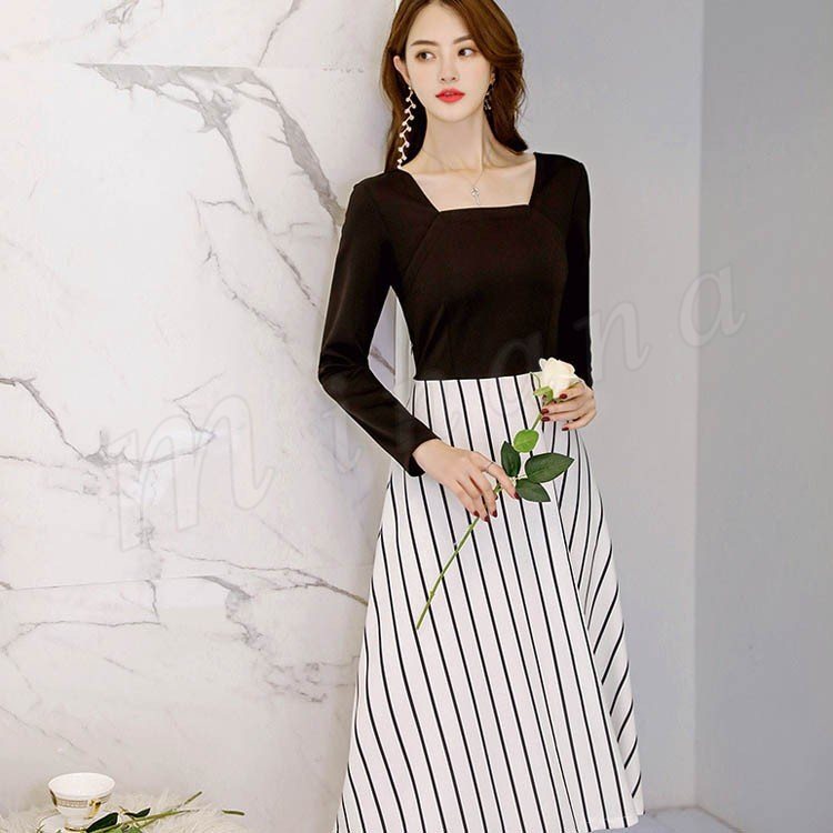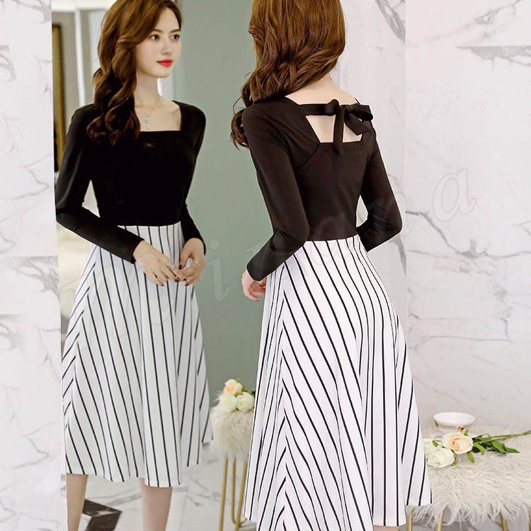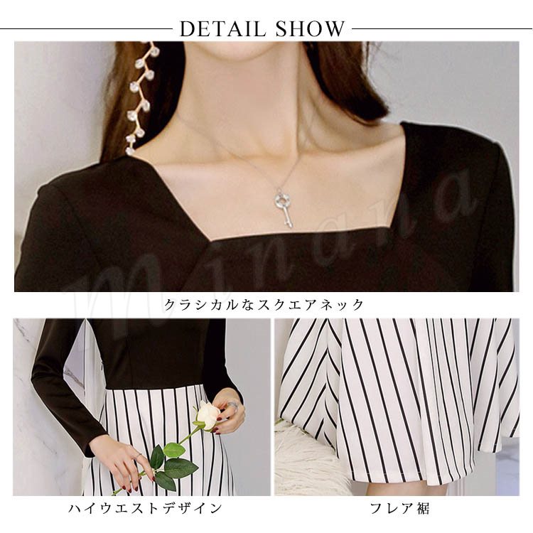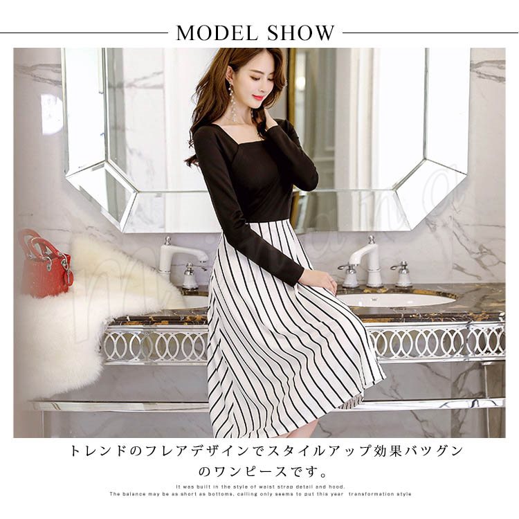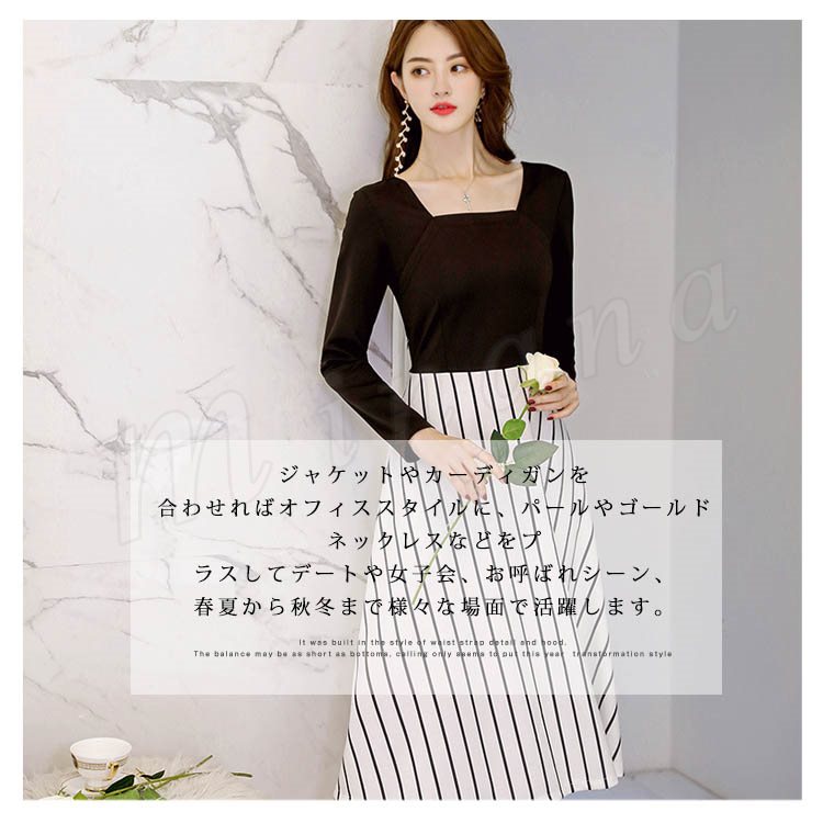 ワンピース ドッキングワンピース 重ね着風 膝丈 レディース ストライプ スクエアネック 大きいサイズ 長袖 おしゃれ 通勤 OL フェミニン
