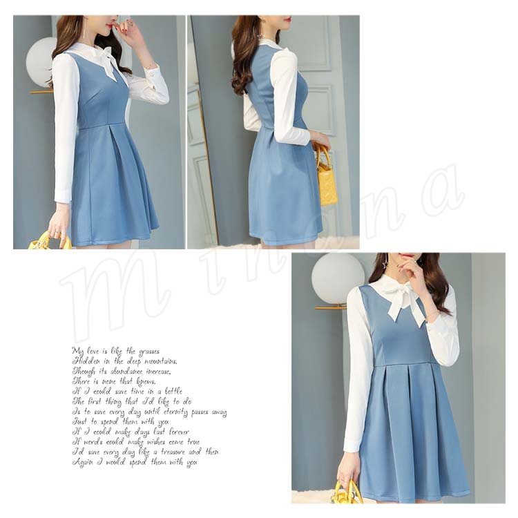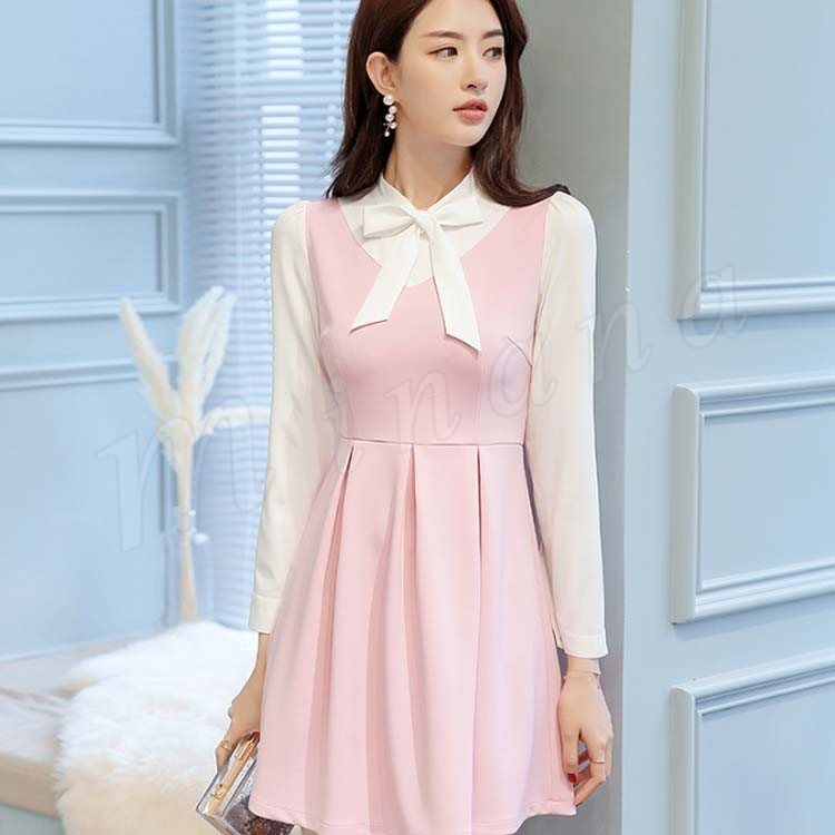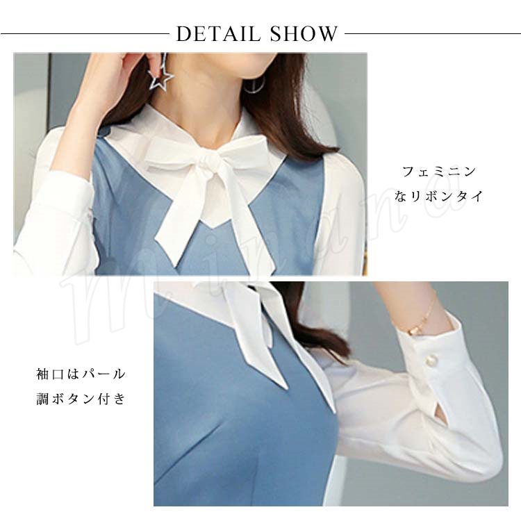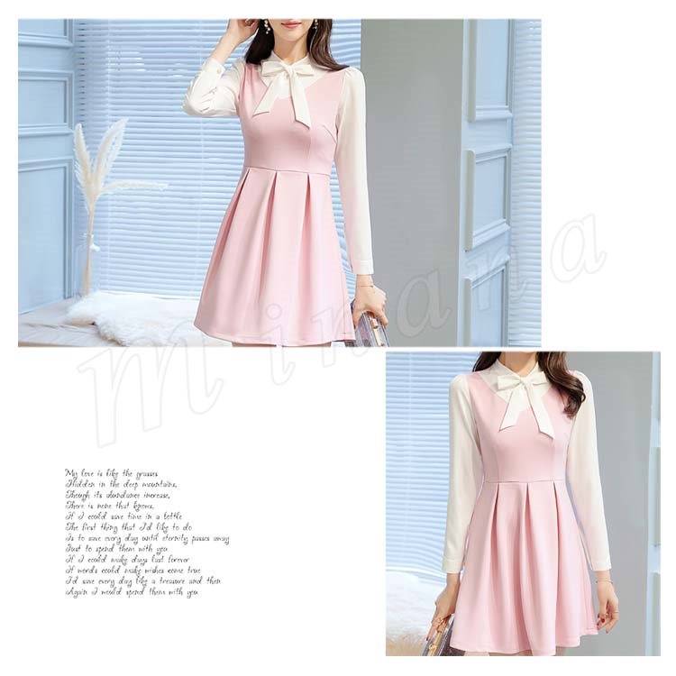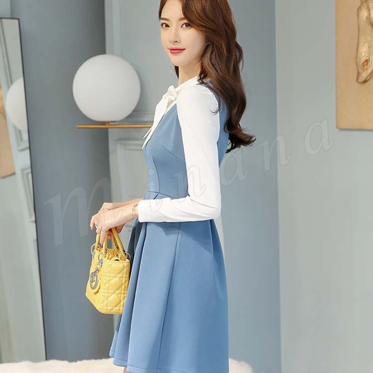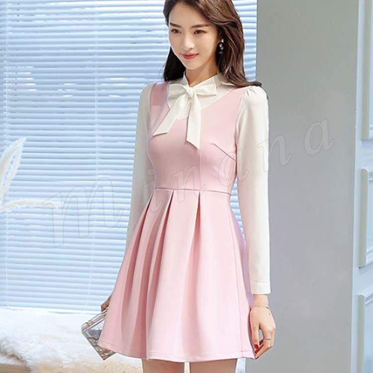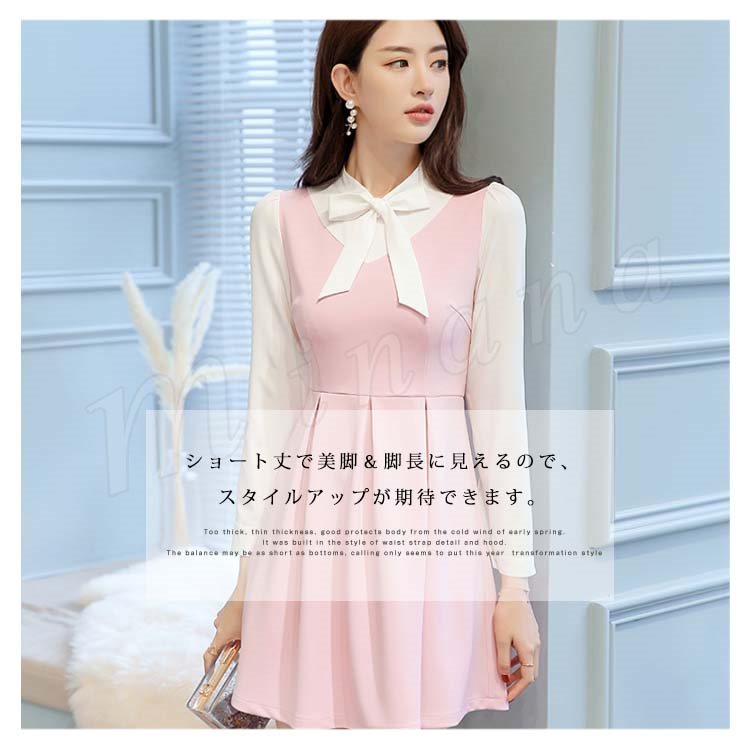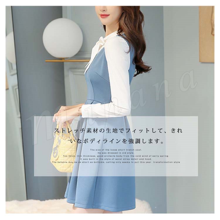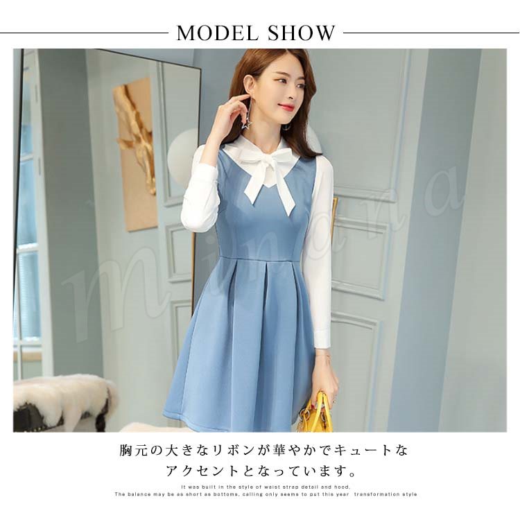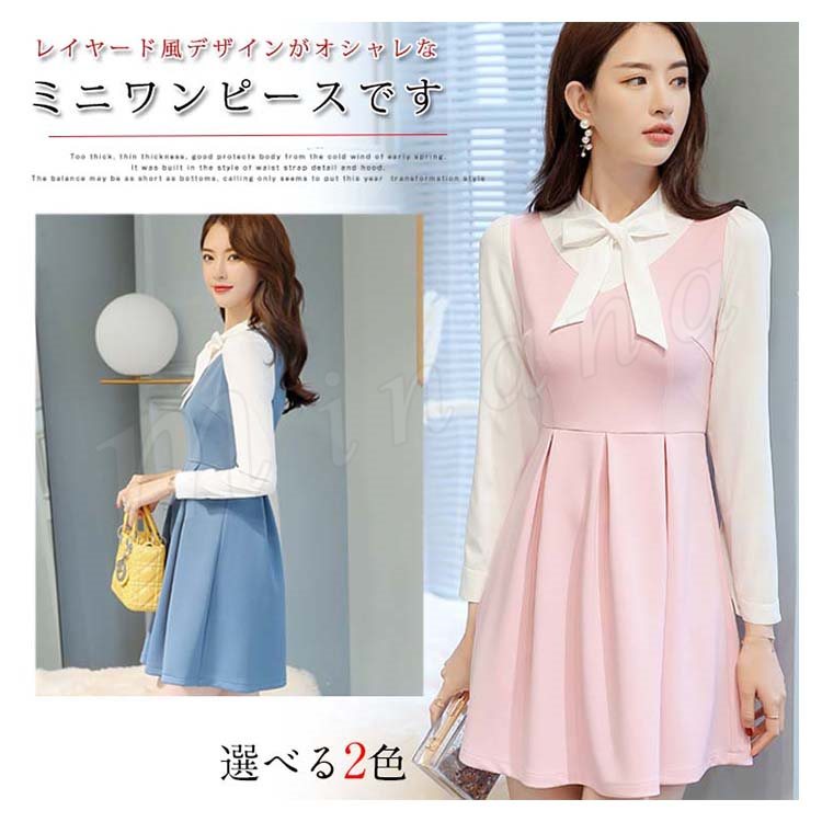 重ね着風ワンピース フレアワンピース Aラインワンピース 長袖 レディース 胸元リボン 大きいサイズ レイヤード ストレッチ デート 可愛い