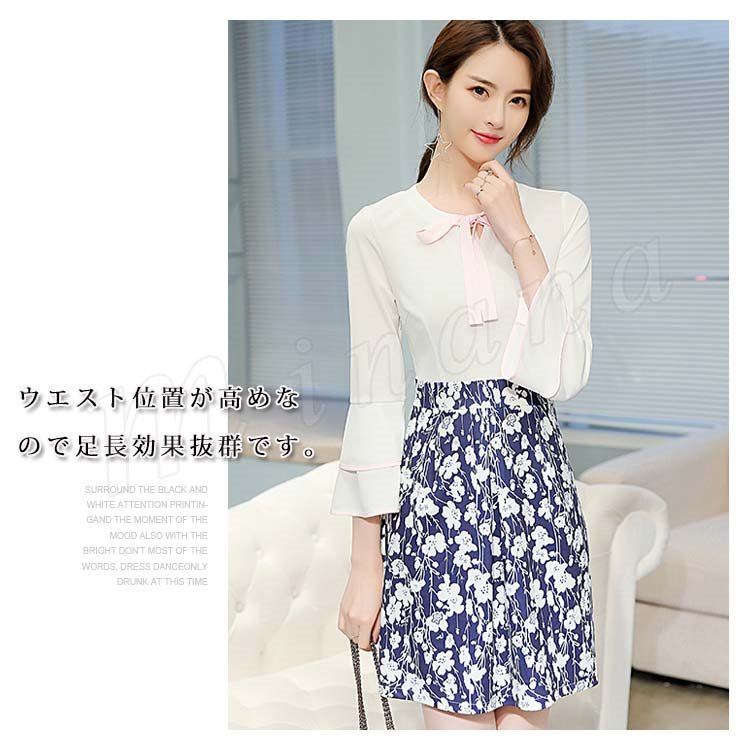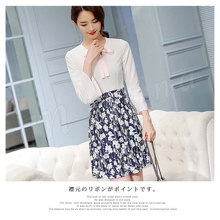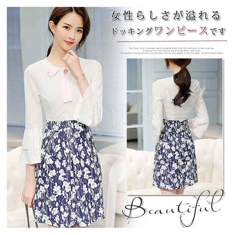 ドッキングワンピース フレアワンピース 重ね着風 長袖 フレア袖 膝丈 レディース 花柄 切替 リボン付き ドッキング 大きいサイズ 通勤 フ