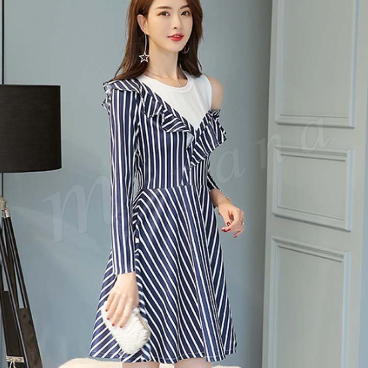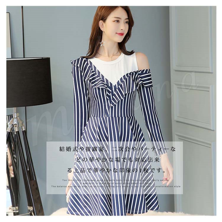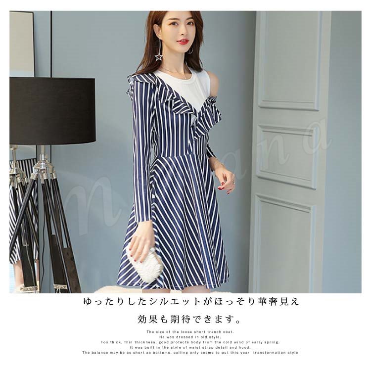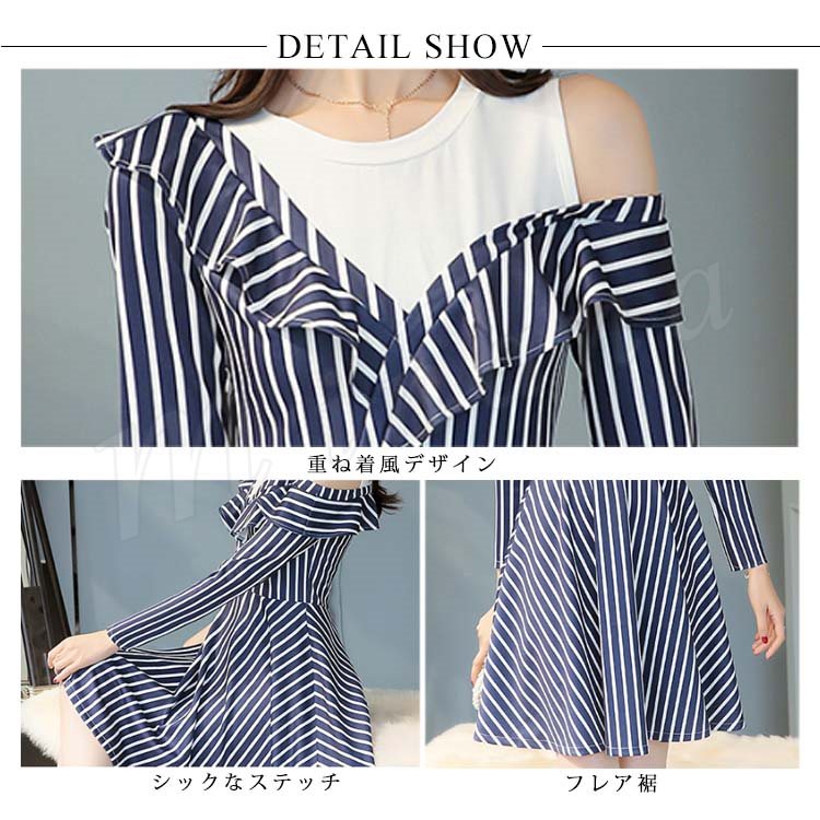 肩出しワンピース 重ね着風ワンピース フレアワンピース Aラインワンピース 長袖 ストライプ レディース 大きいサイズ 無地 ひざ丈 きれいめ
