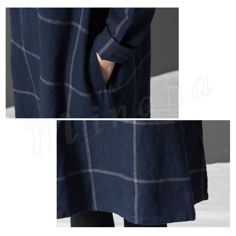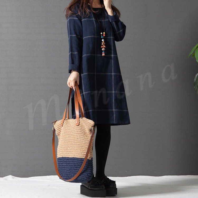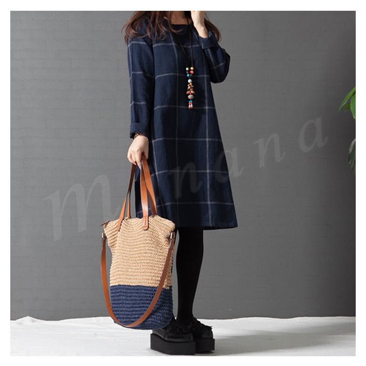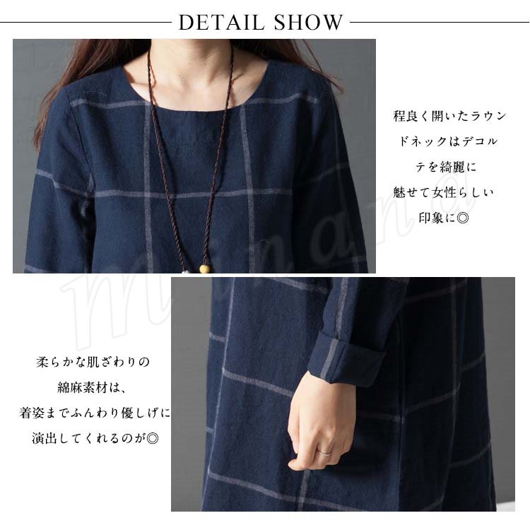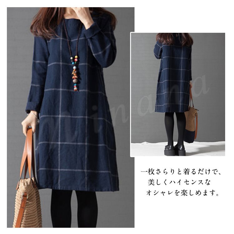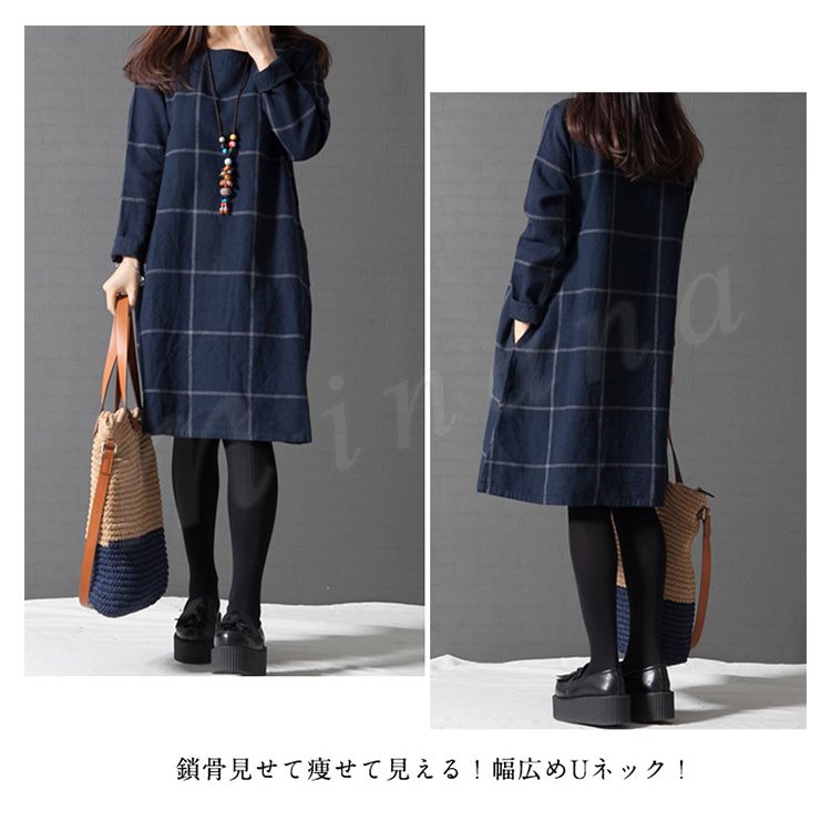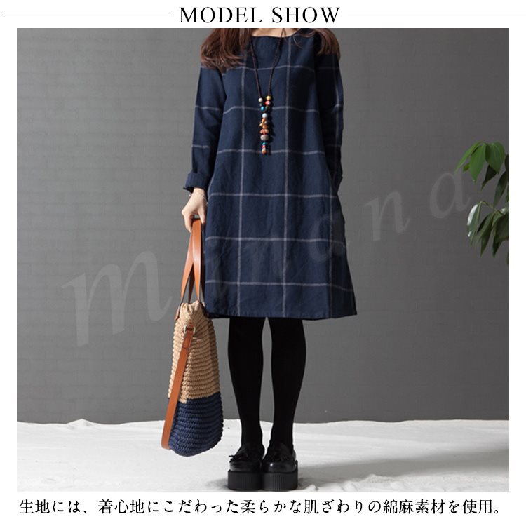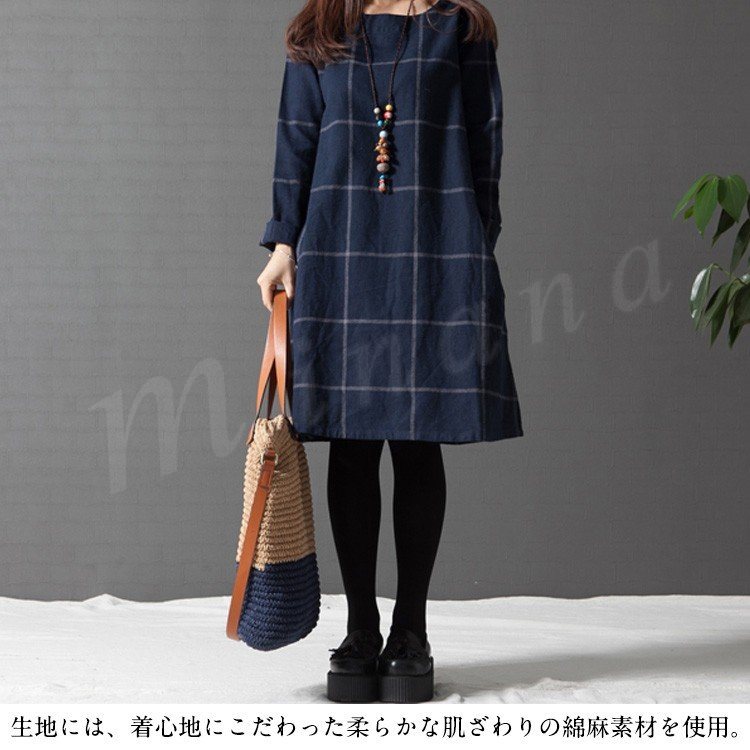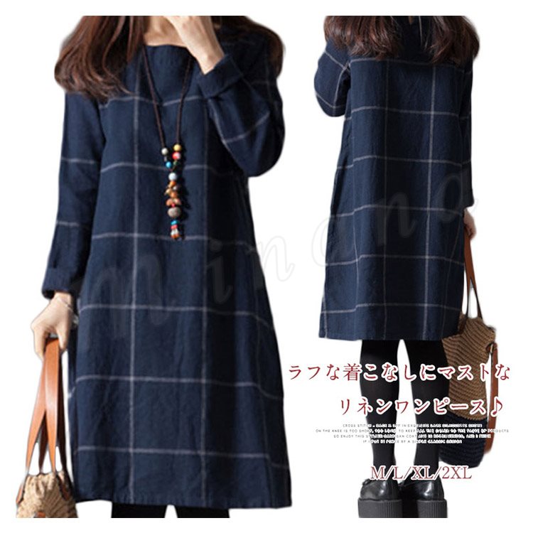 ワンピース リネンワンピース 長袖 レディース チェック柄 綿麻ワンピース 膝丈 綿麻 リネン ワンピース Aライン ワンピース リネン 森ガール