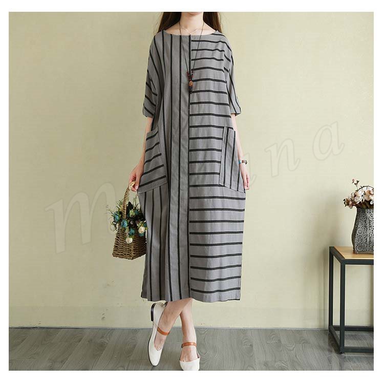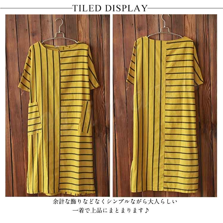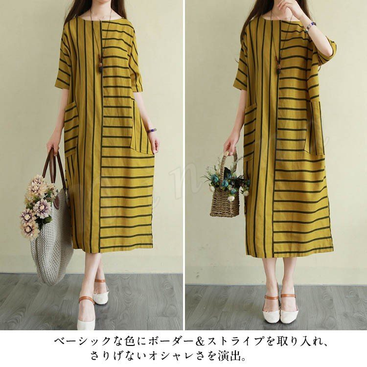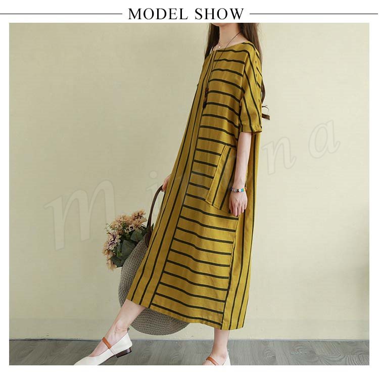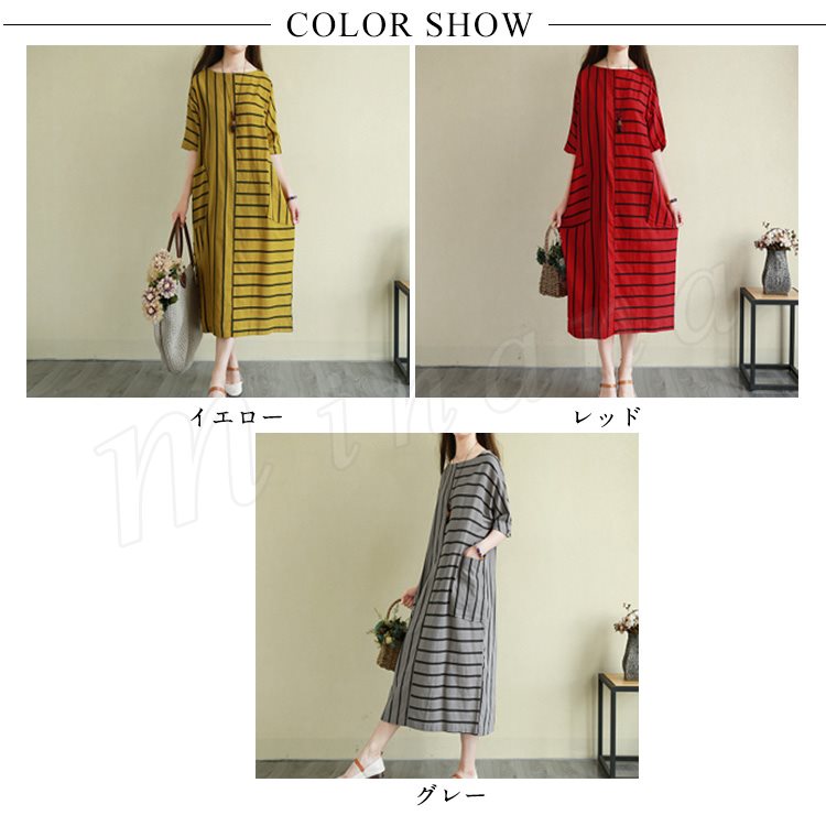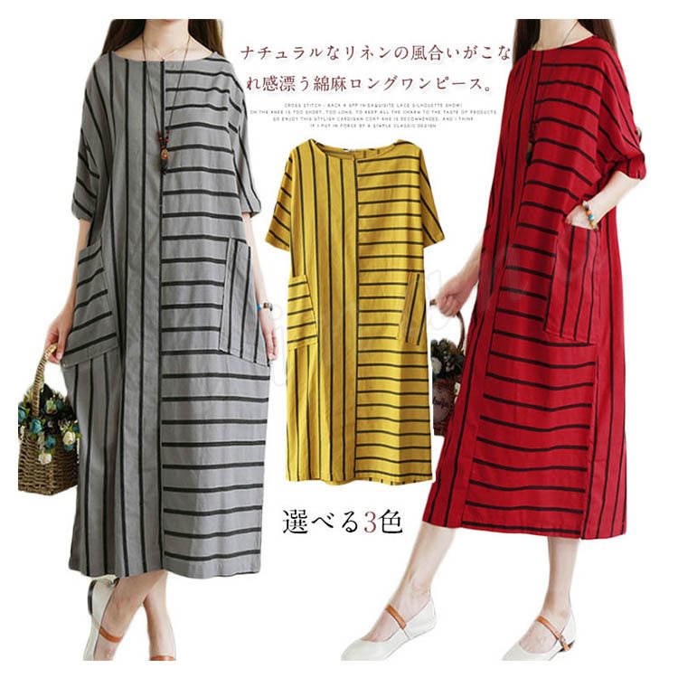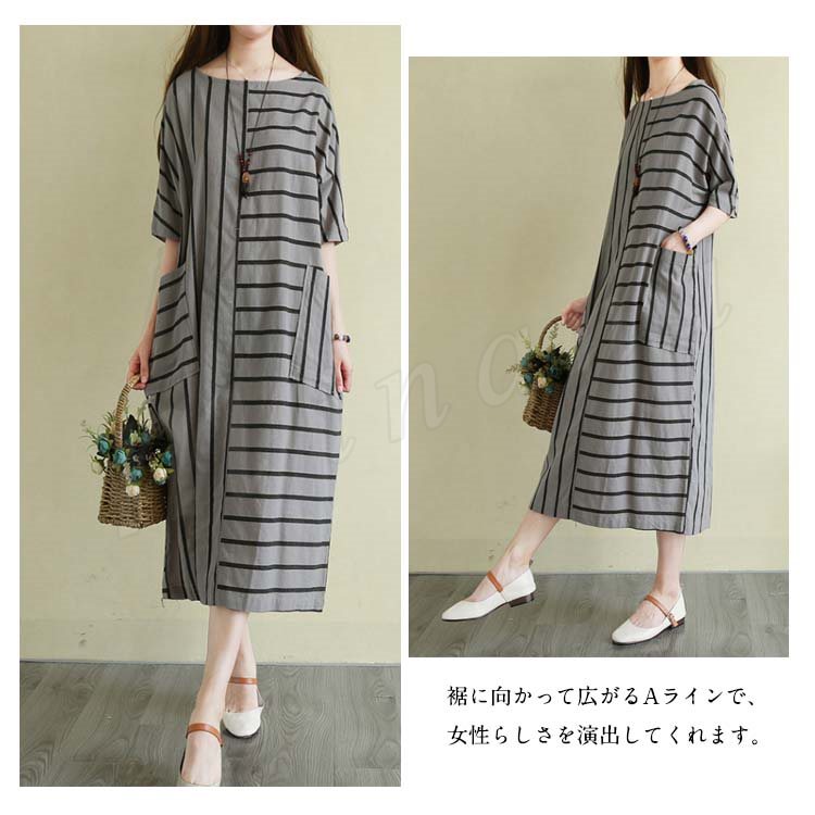 リネンワンピース 綿麻 ロングワンピース マキシワンピース ボーダー柄 綿麻ワンピース ロング丈 ドルマンスリーブ 半袖 ゆったり aライン 春夏 大