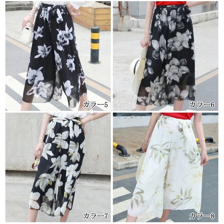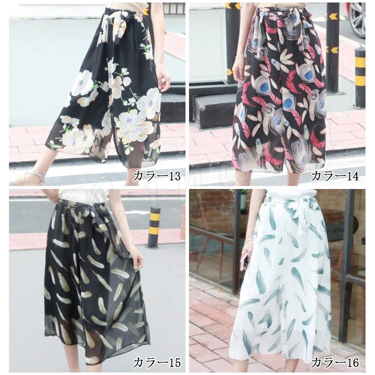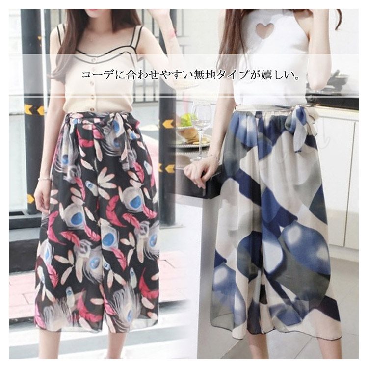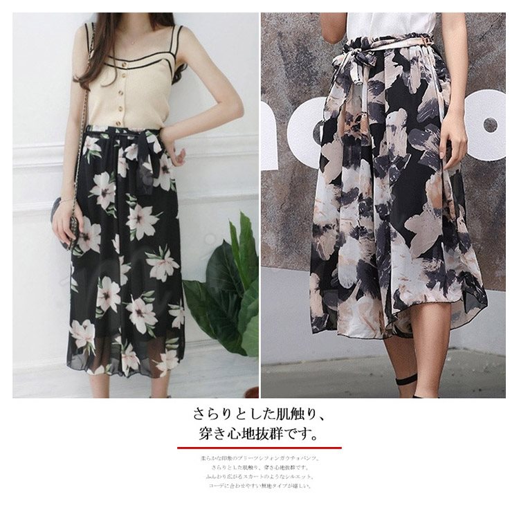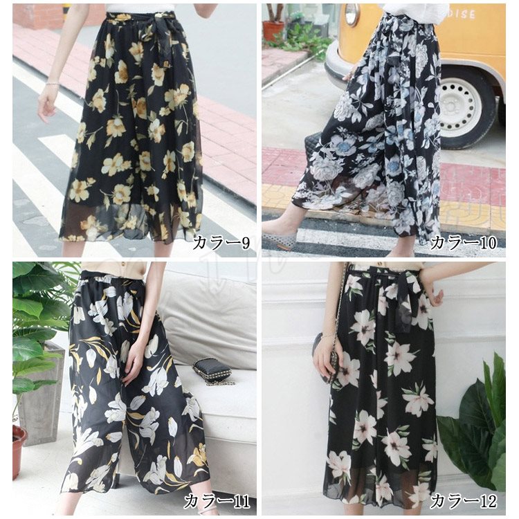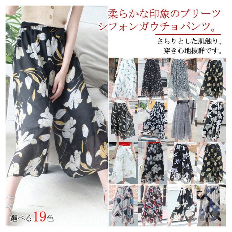 ワイドパンツ ガウチョパンツ レディース シフォンパンツ 花柄 ロングパンツ 9分丈パンツ プリーツ 着痩せ 無地 ゆったり カジュアル お洒