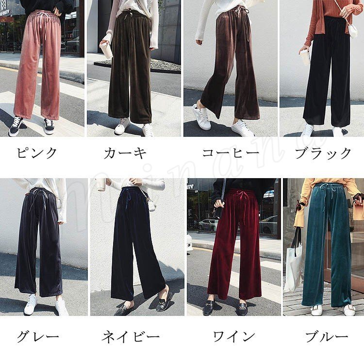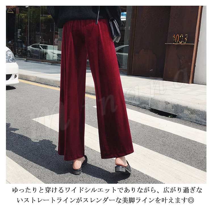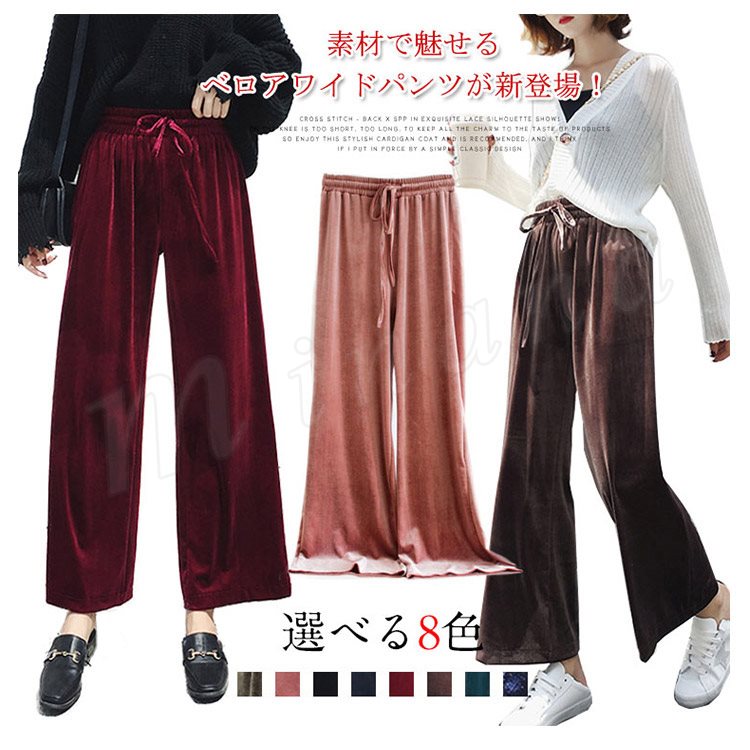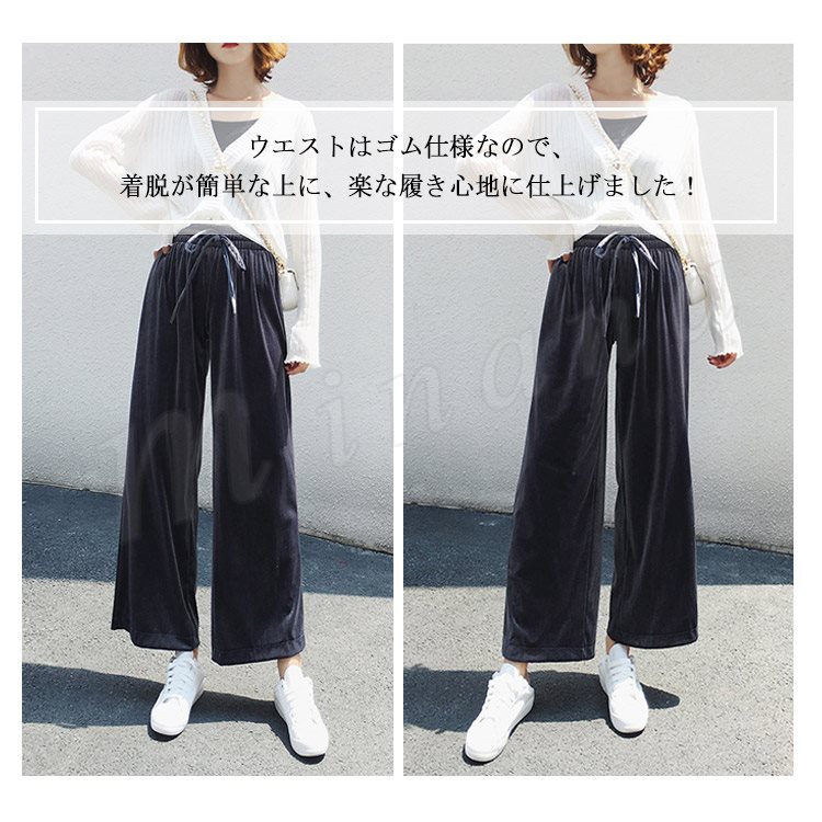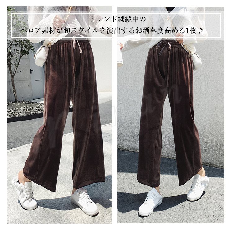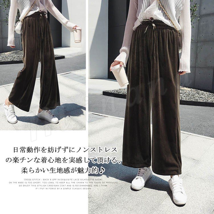 ベロア ロングパンツ ガウチョパンツ ベロア ワイドパンツ レディース ストレート パンツ ストレート ボトムス パンツ 秋 冬 トレンド ウエストゴ