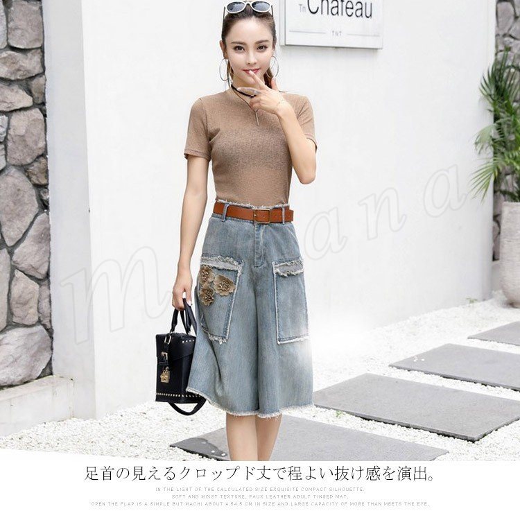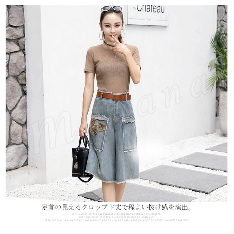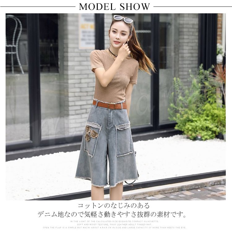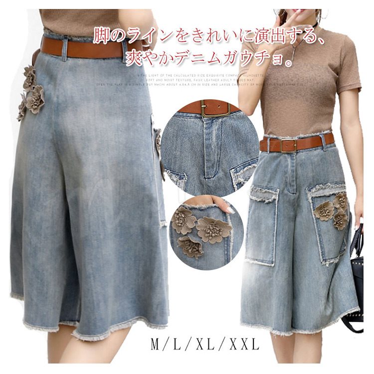 デニムワイドパンツ ガウチョ デニムパンツ レディース ガウチョパンツ 五分丈 コットン パンツ スカーチョ カジュアル 上品