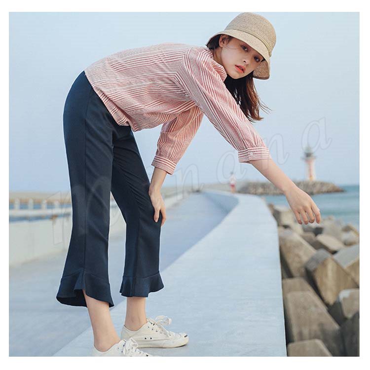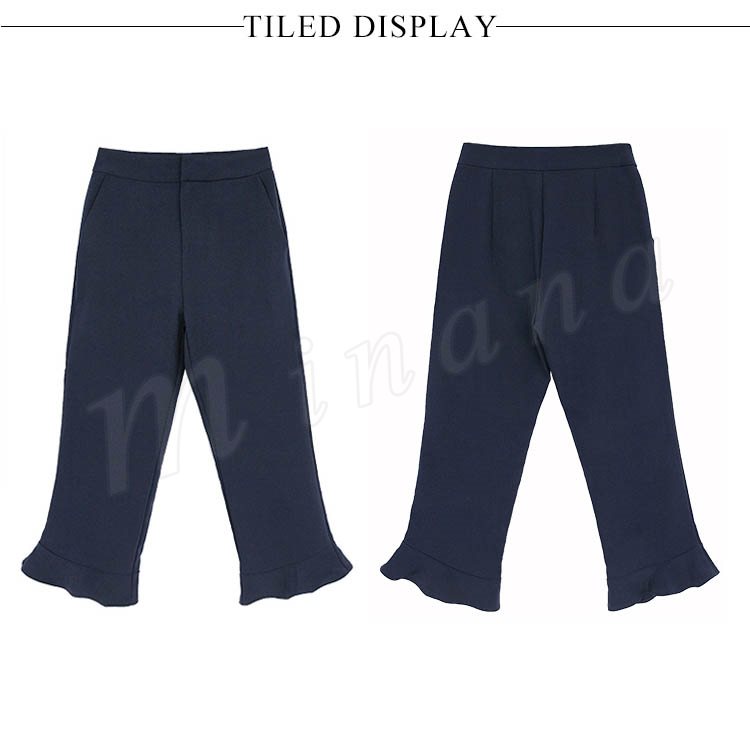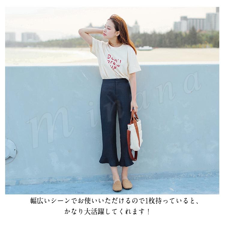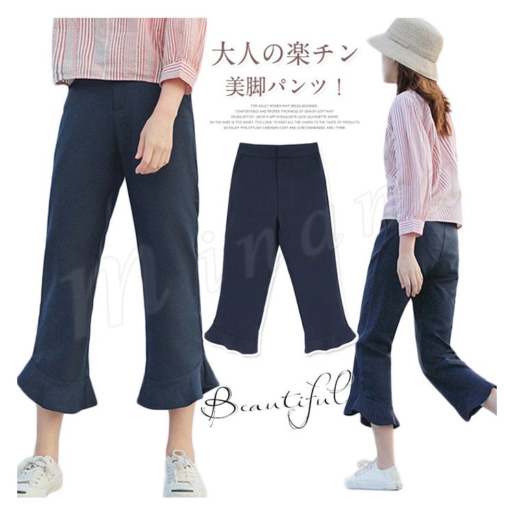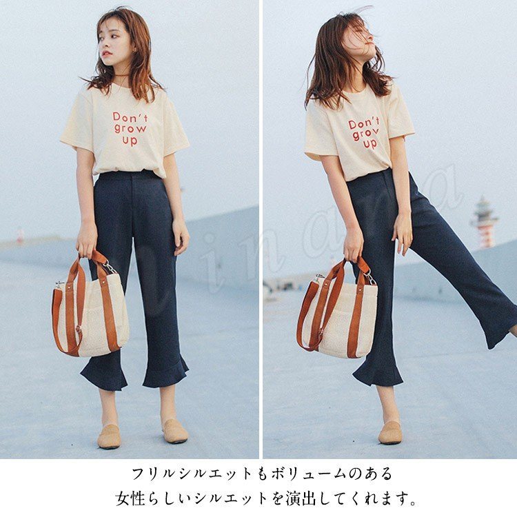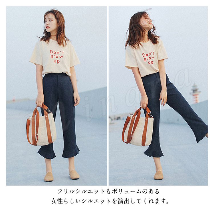 | 大人の楽チン美脚パンツ! フリルシルエットもボリュームのある女性らしいシルエットを演出してくれます。 くるぶしが見えない9分丈で女性らしさの印象もプラス シワになりにくい素材を使用しております。 ヒールでキレイめに、スニーカーでカジュアルに…♪幅広いコーデが楽しめる。 幅広いシーンでお使いいただけるので1枚持っていると、かなり大活躍してくれます! | |
