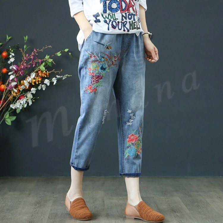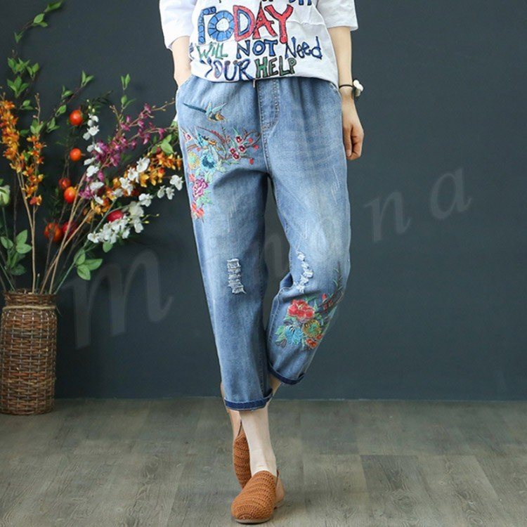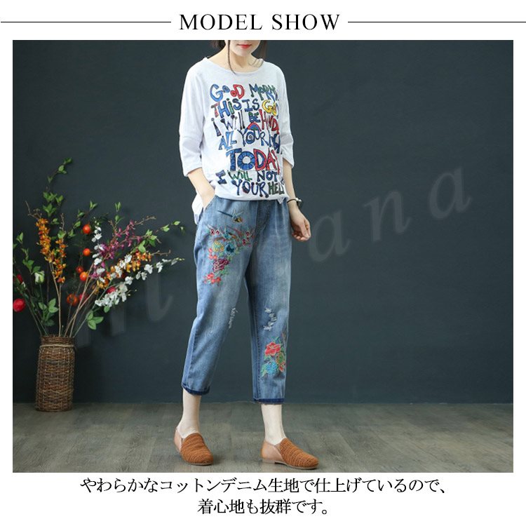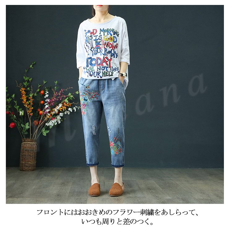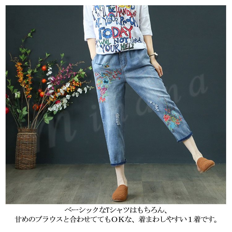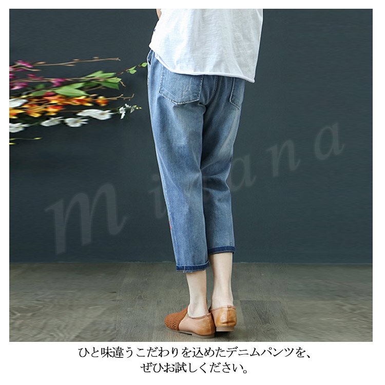 花柄刺繍デニムパンツ レディース クロップド デニムパンツ フラワー 刺繍 七分丈 デニム ボトムス ジーンズ カジュアル ウエストゴム 春 夏