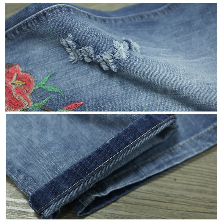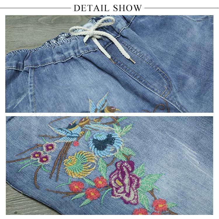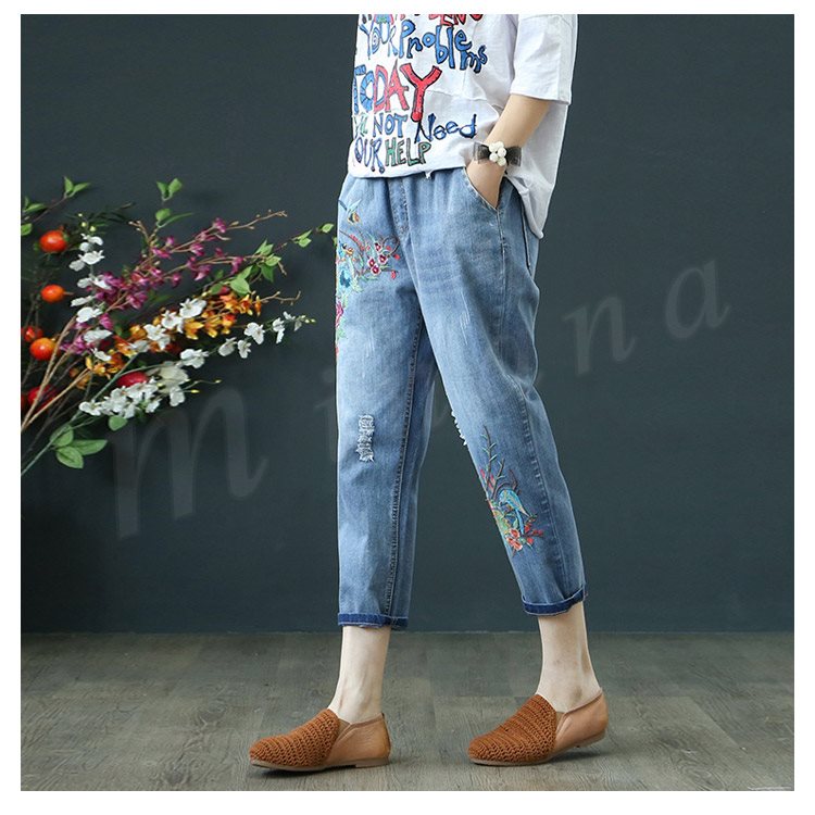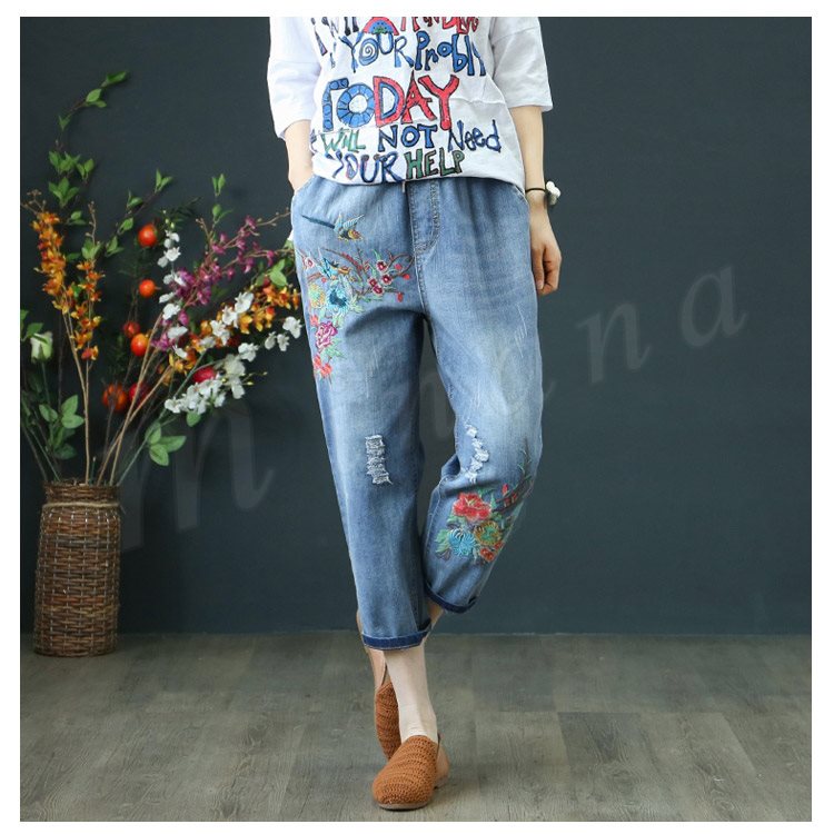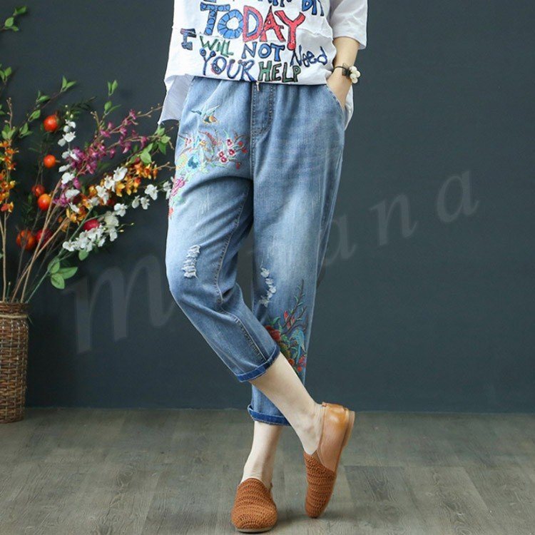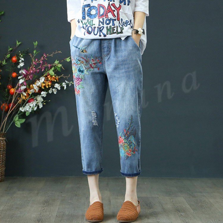 花柄刺繍デニムパンツ レディース クロップド デニムパンツ フラワー 刺繍 七分丈 デニム ボトムス ジーンズ カジュアル ウエストゴム 春 夏