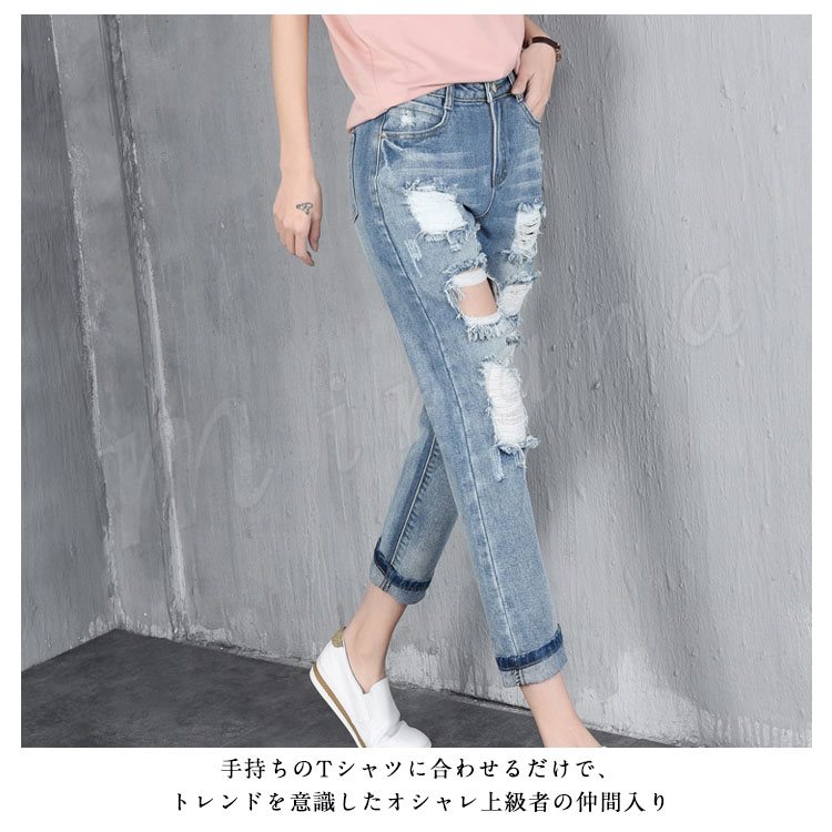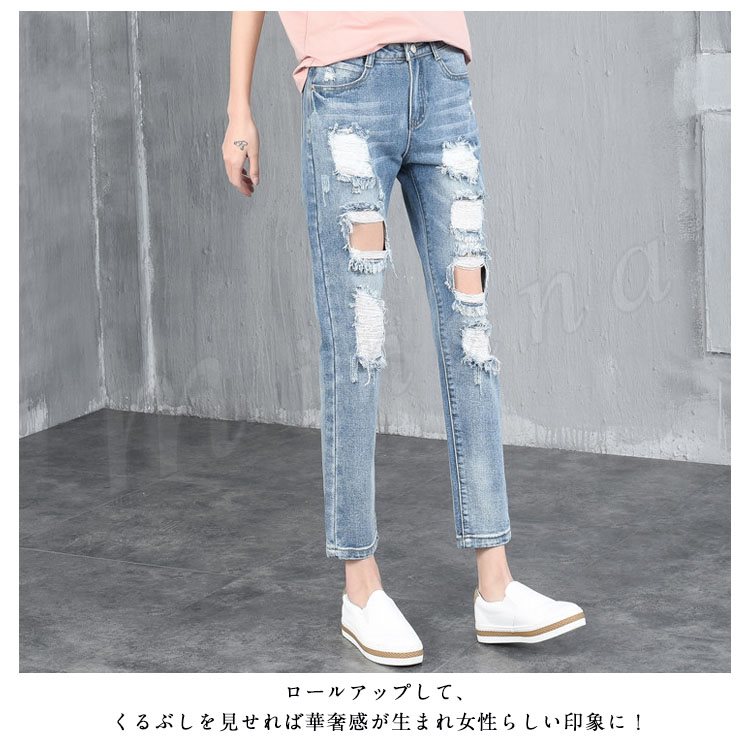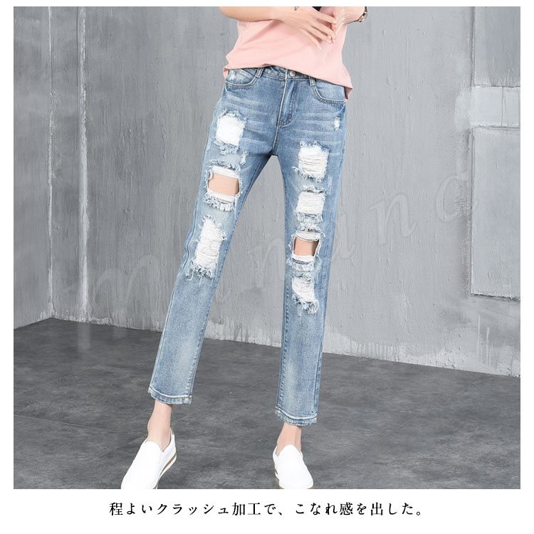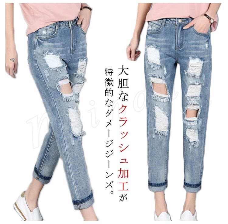 ダメージジーンズ クラッシュデニム レディース ジーンズ デニムパンツ クラッシュ加工 ダメージ加工 アンクル丈 ボトムス ジーパン おしゃれ 春夏