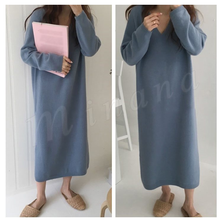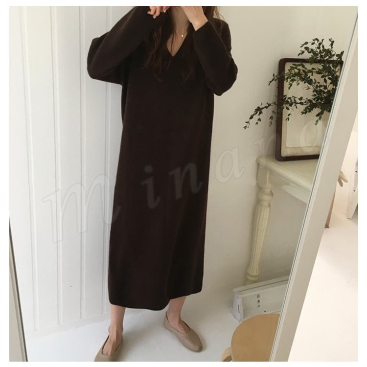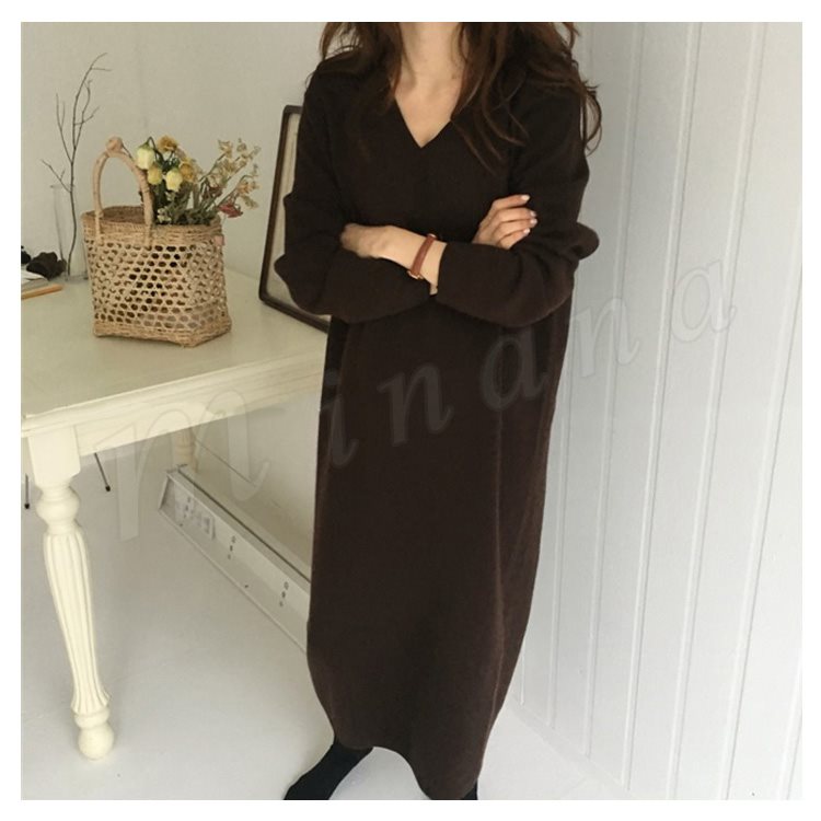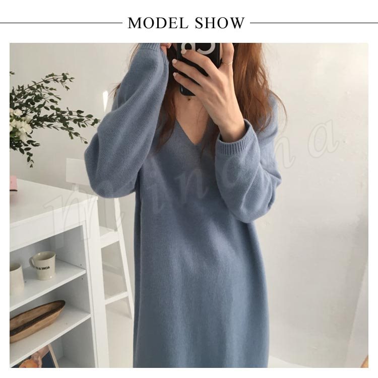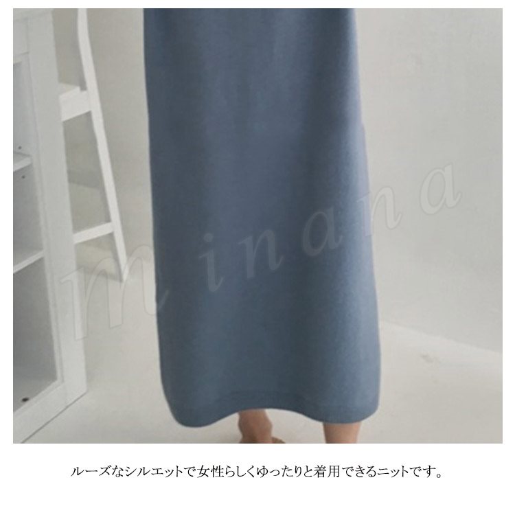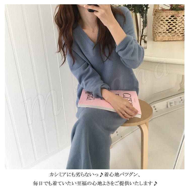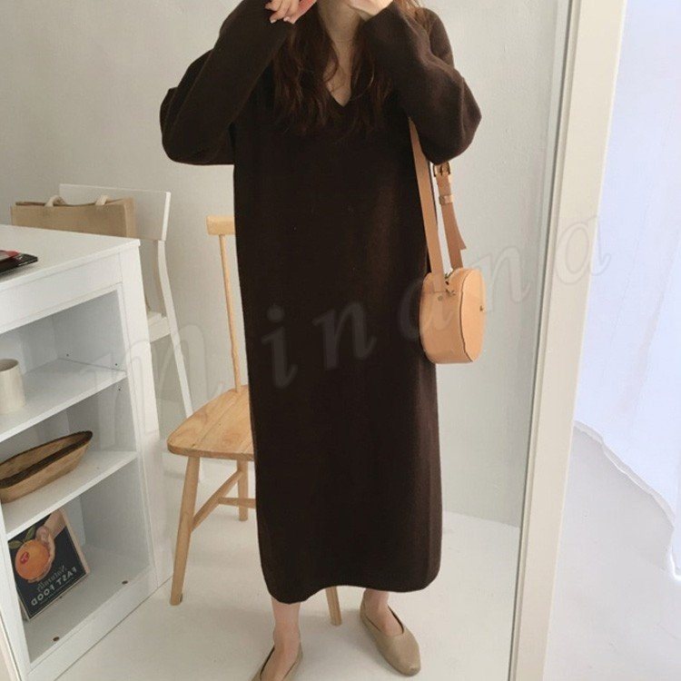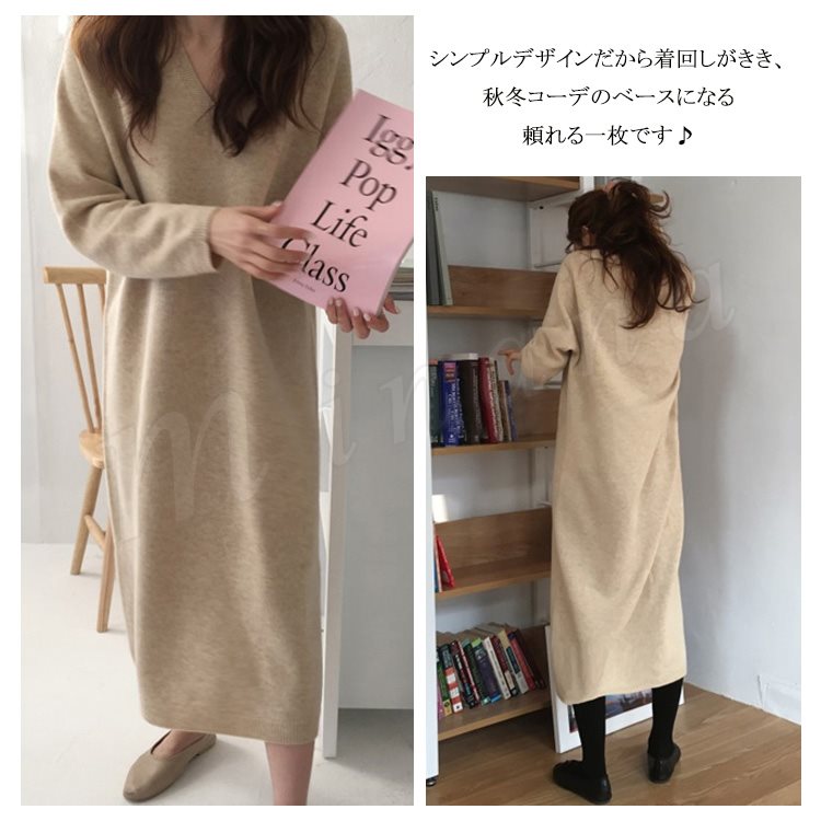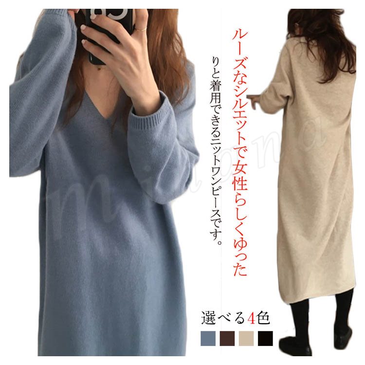 Vネック ニットワンピース ミモレ丈 ロング丈 ニット ワンピース レディース ニットワンピース ニット ベーシック ゆったり