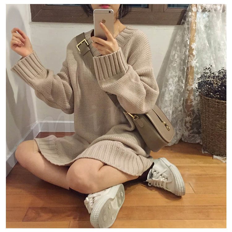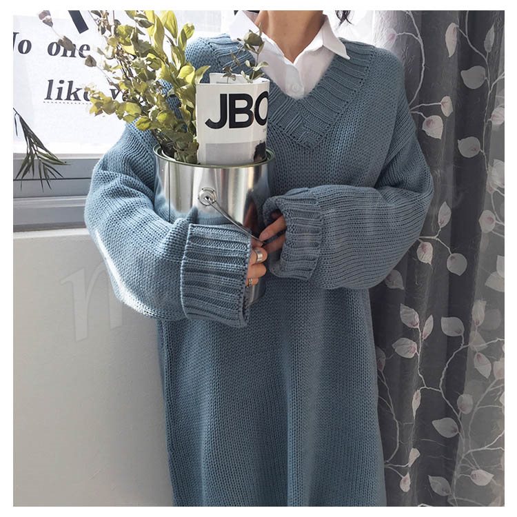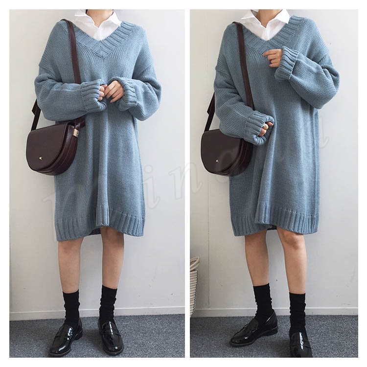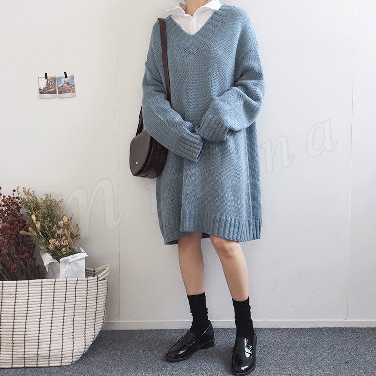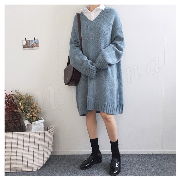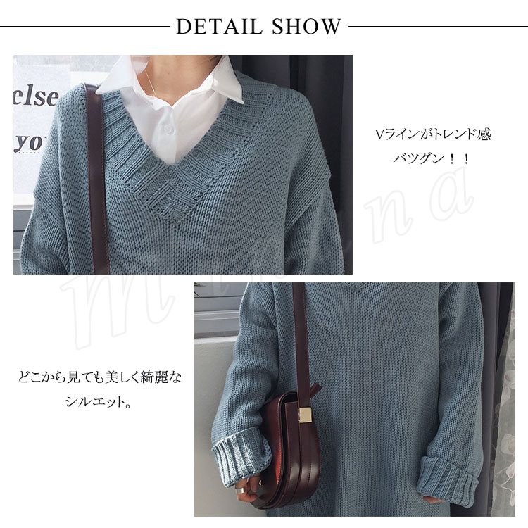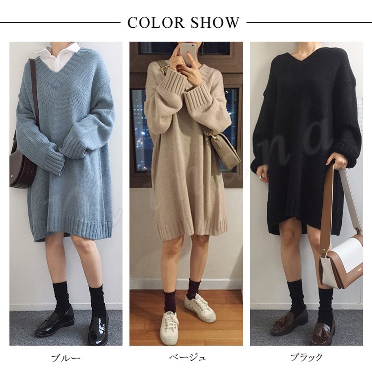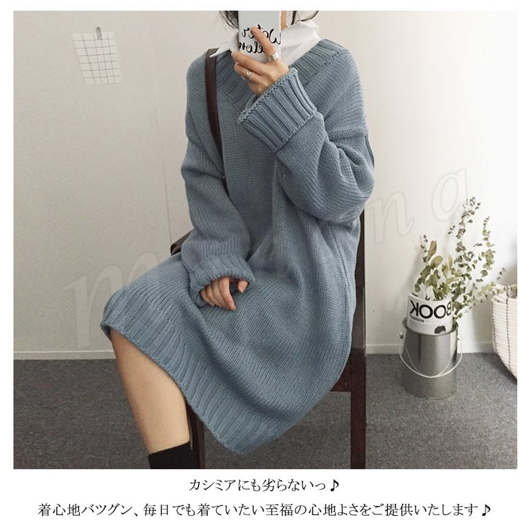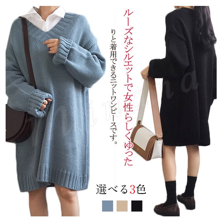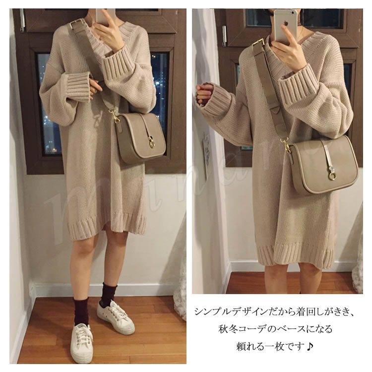 ロング丈 ニット ワンピース レディース Vネック ニットワンピース 膝丈 ニットワンピース ニット ベーシック ゆったり