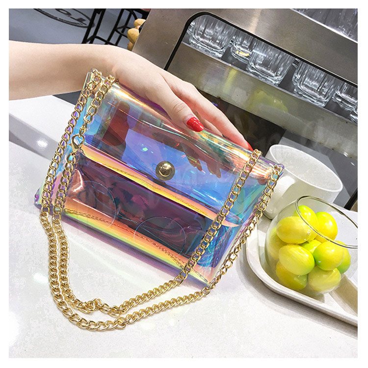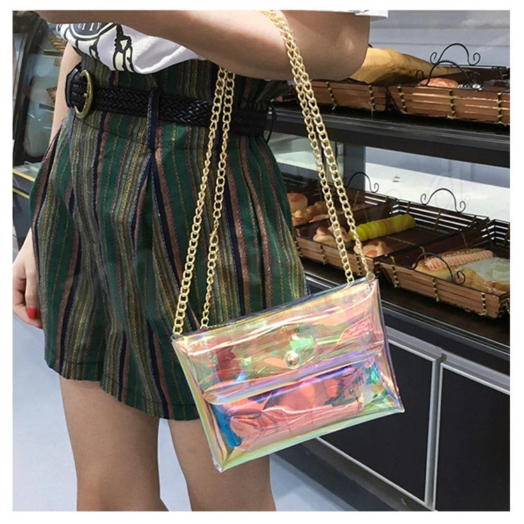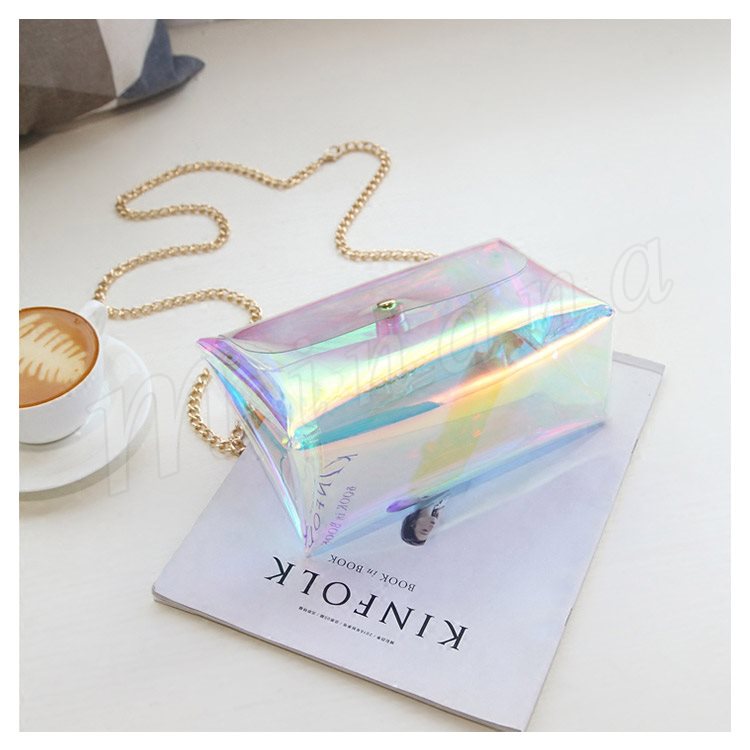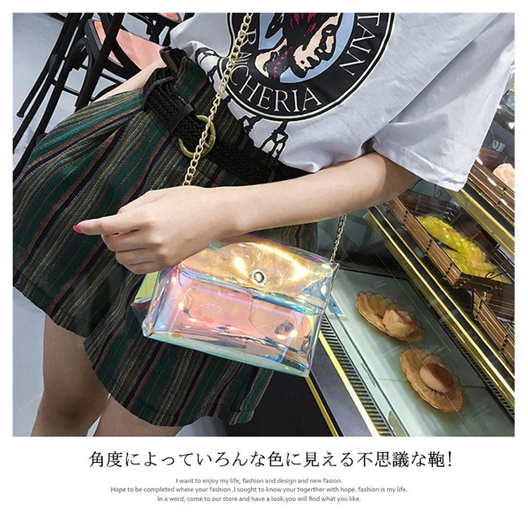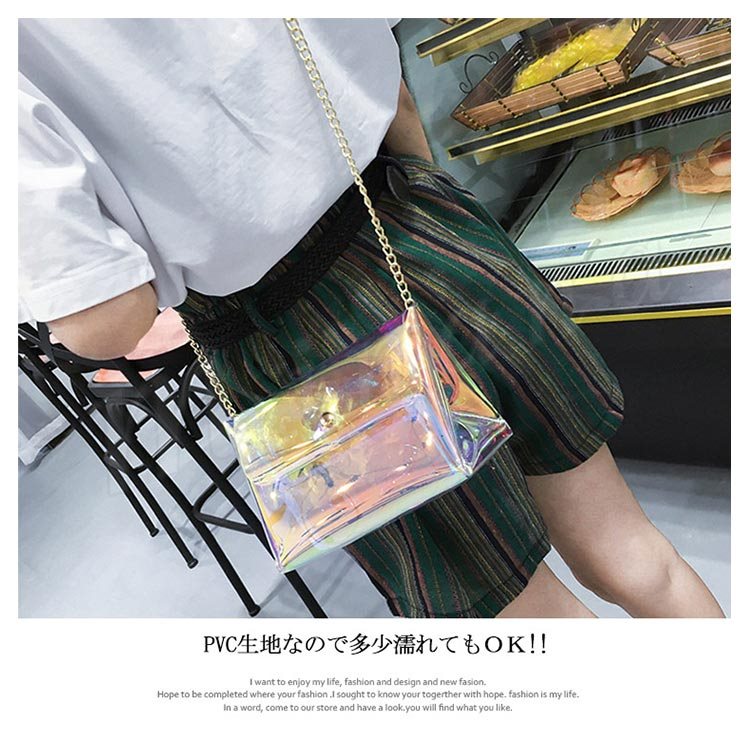 | 斜め掛けバッグとしてもショルダーバッグとしても使える。 角度によっていろんな色に見える不思議な鞄! 海やプールなどレジャーにおすすめ!タウン用にも使えるクリアバッグ。 この夏必須!夏のおでかけにピッタリ♪ PVC生地なので多少濡れてもOK!! とっても涼しげで、お洒落なクリア素材のバッグは海やプールなどのイベントにも大活躍間違いなし!! | |