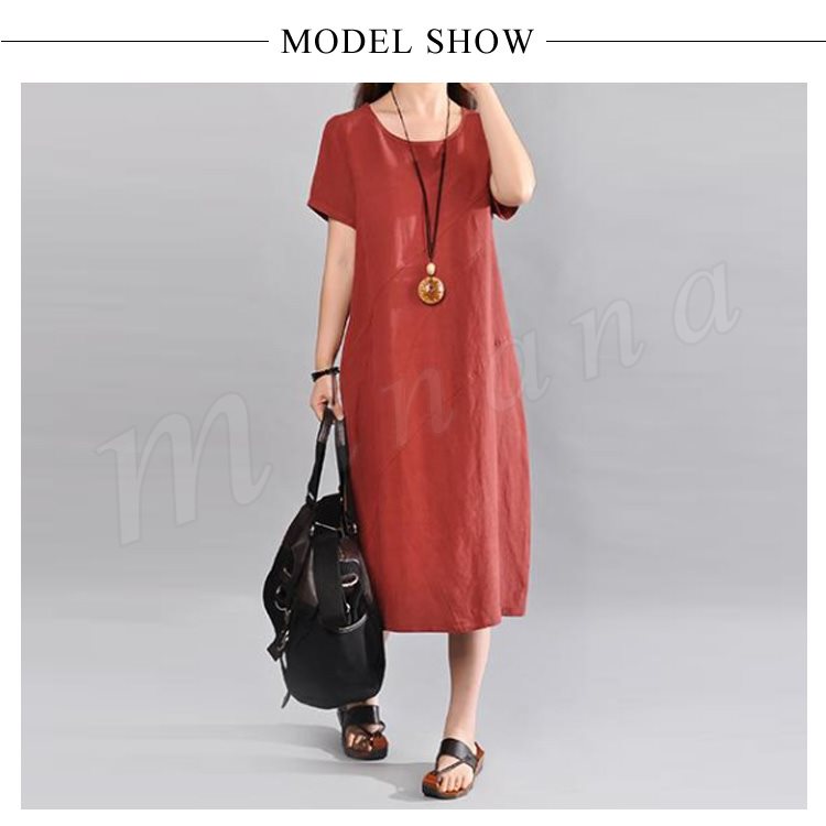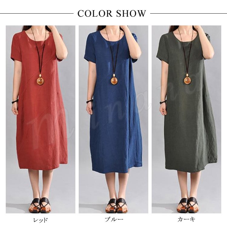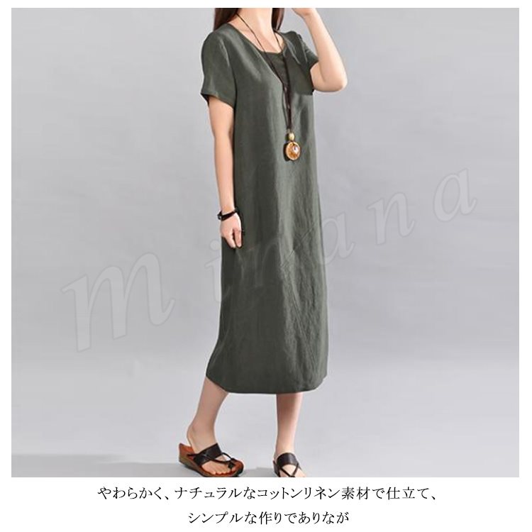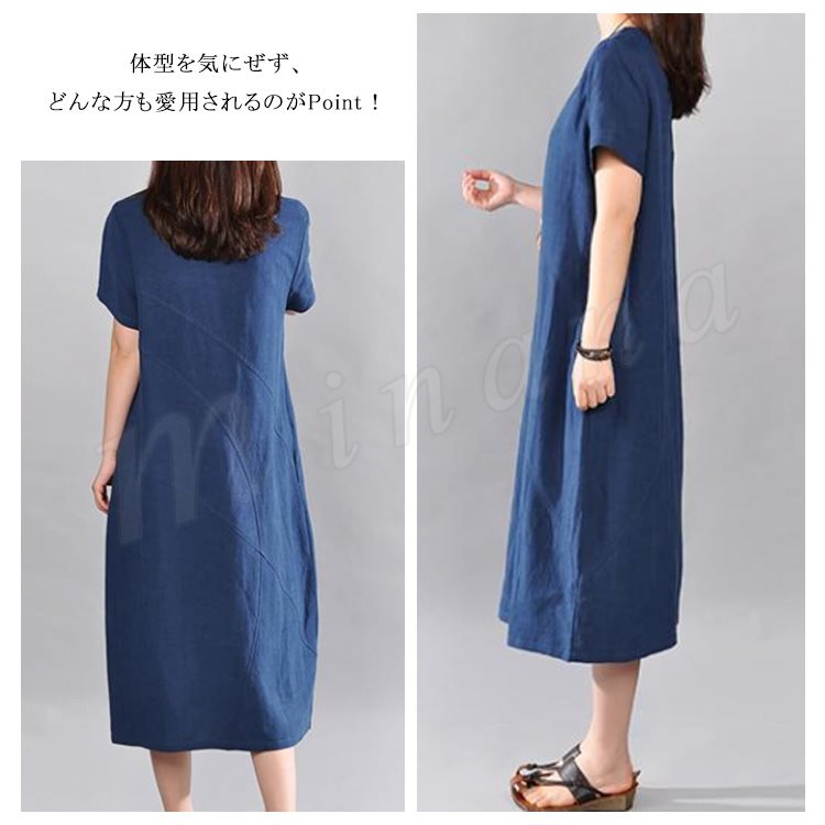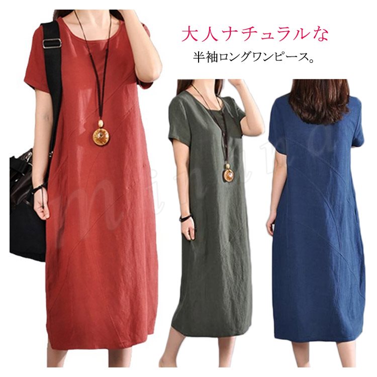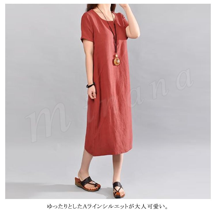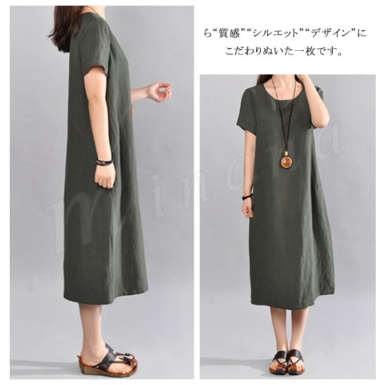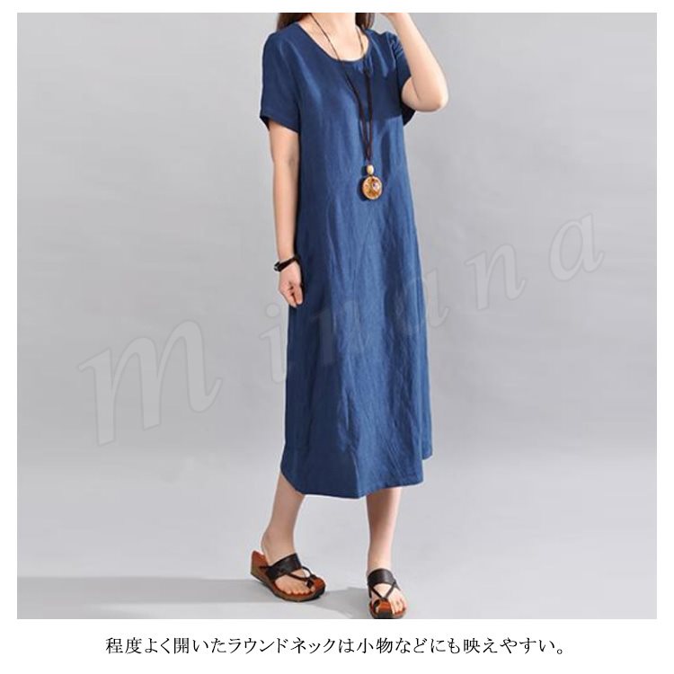 リネンワンピース 綿麻 半袖ワンピース ワンピース 綿麻ワンピース カジュアルワンピース ラウンドネック 膝下丈 ゆったり ナチュラル シンプル 可愛