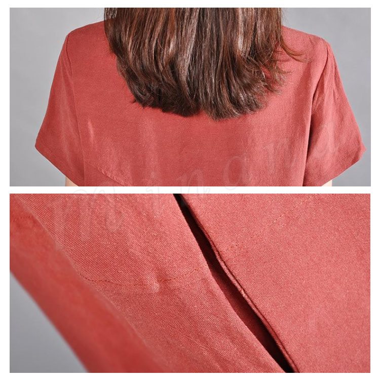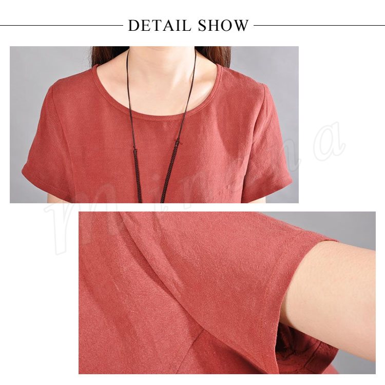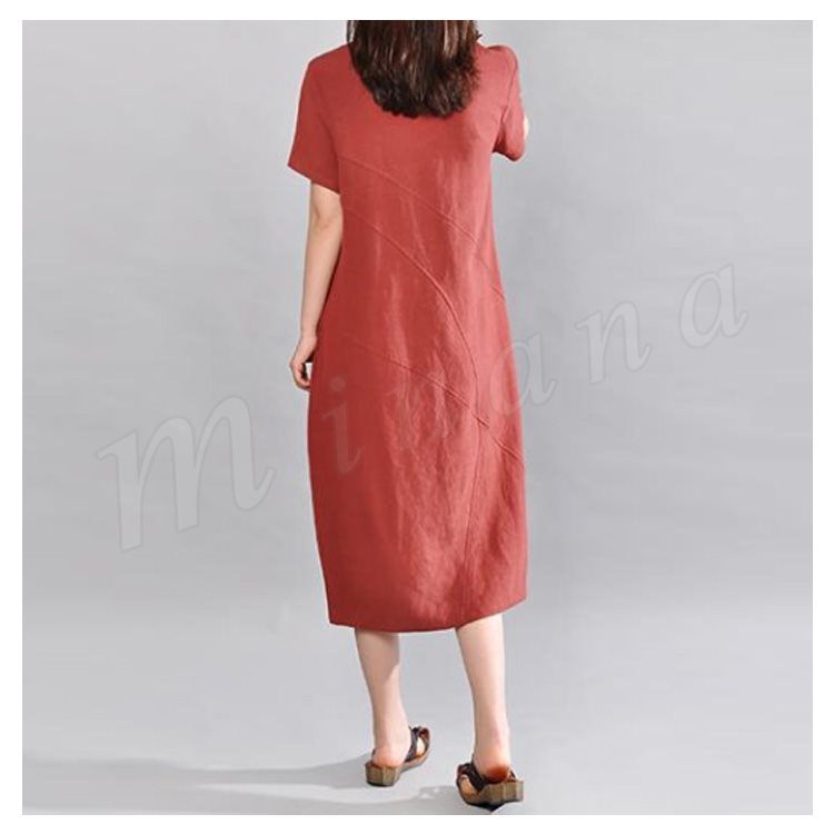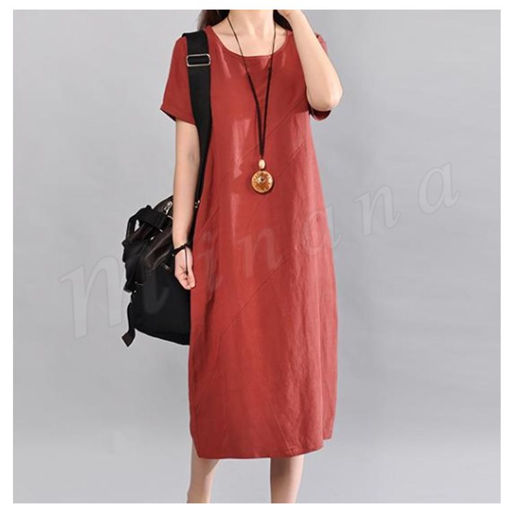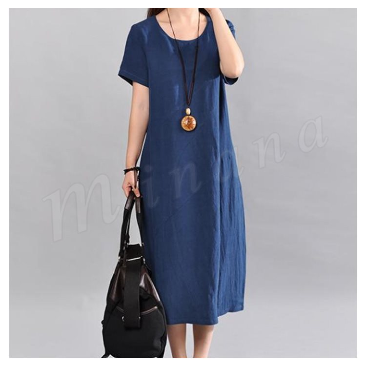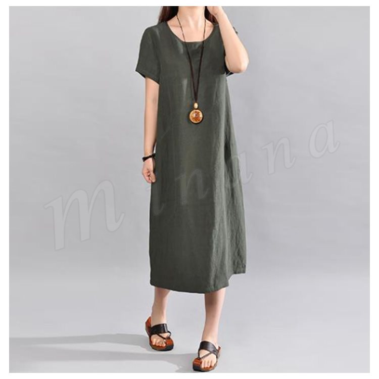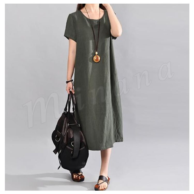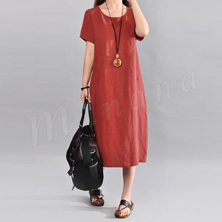 リネンワンピース 綿麻 半袖ワンピース ワンピース 綿麻ワンピース カジュアルワンピース ラウンドネック 膝下丈 ゆったり ナチュラル シンプル 可愛
