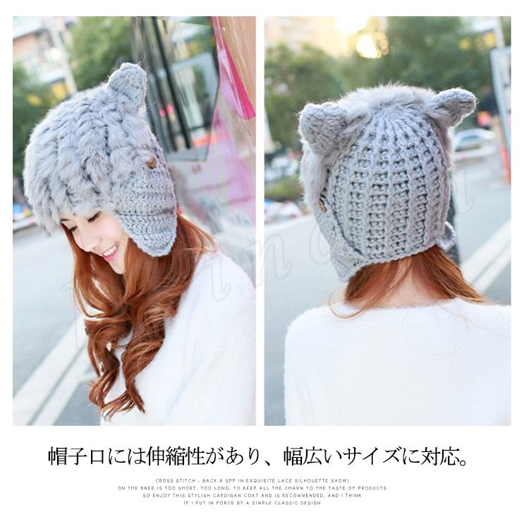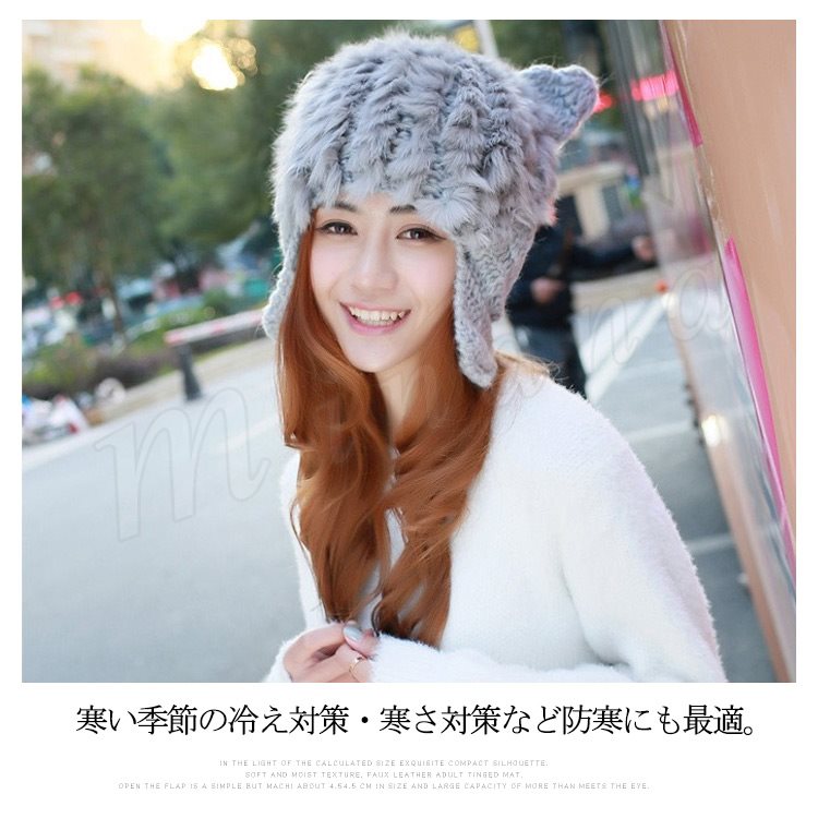 | 顔周りをふんわりフェミニンな印象になるラビット帽子♪ ボリュームのあるラビットファーが可愛いポイント♪ 帽子口には伸縮性があり、幅広いサイズに対応。 寒い季節の冷え対策・寒さ対策など防寒にも最適。 | |