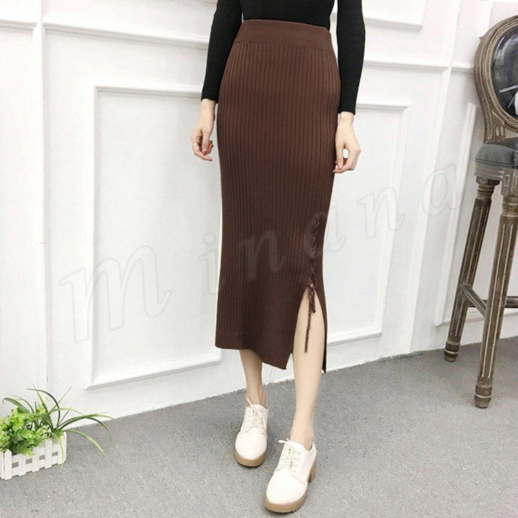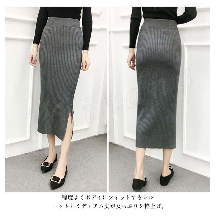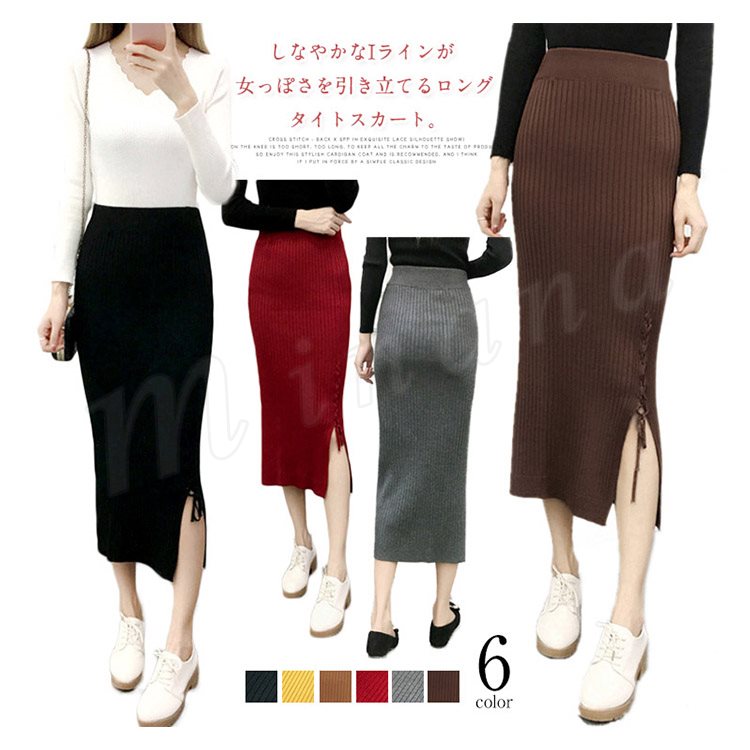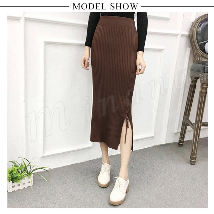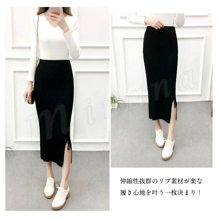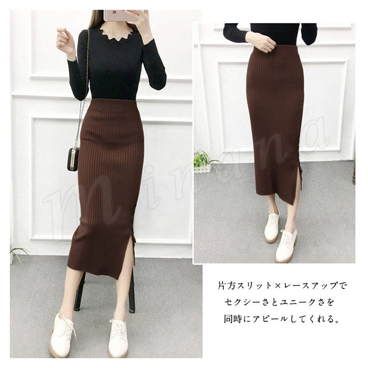 片方スリットに編み上げた!ニットスカート スカート ニット素材 ロング丈 ニット ミモレ丈スカート 編み上げ スリットスカート リブニット 春秋 レデ