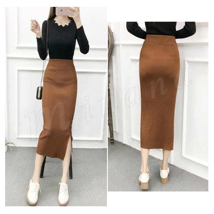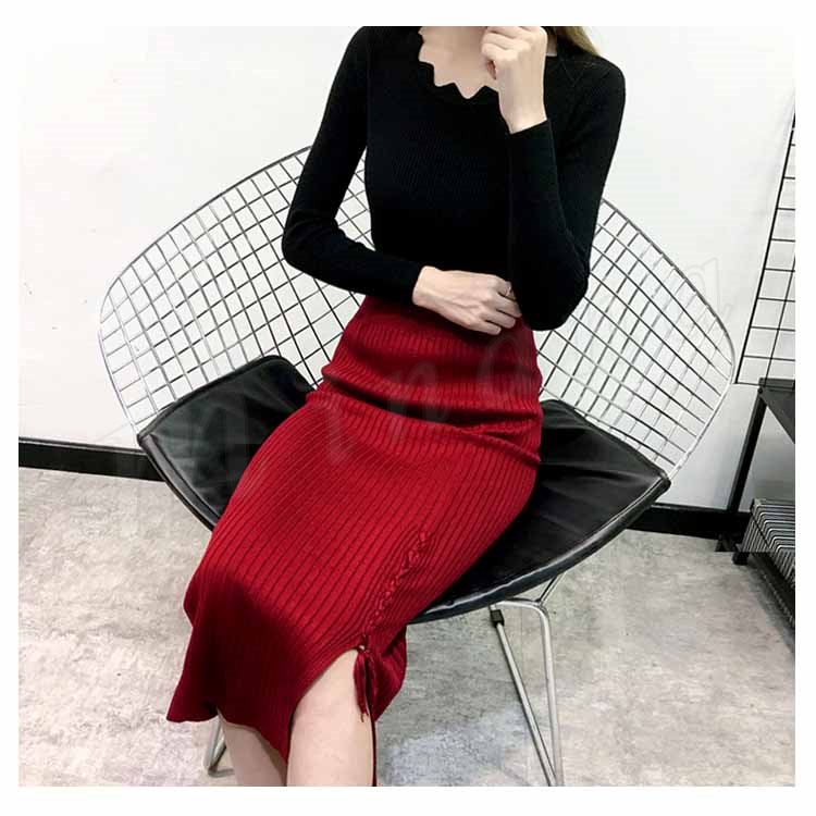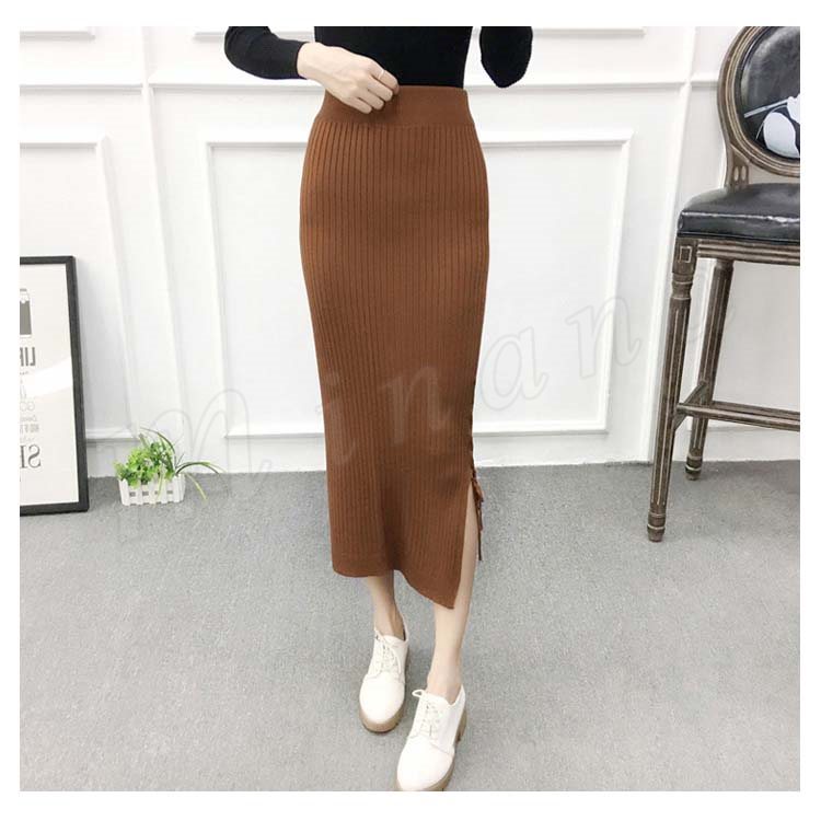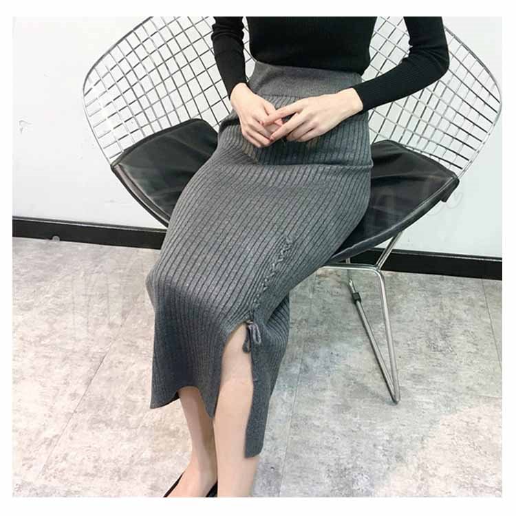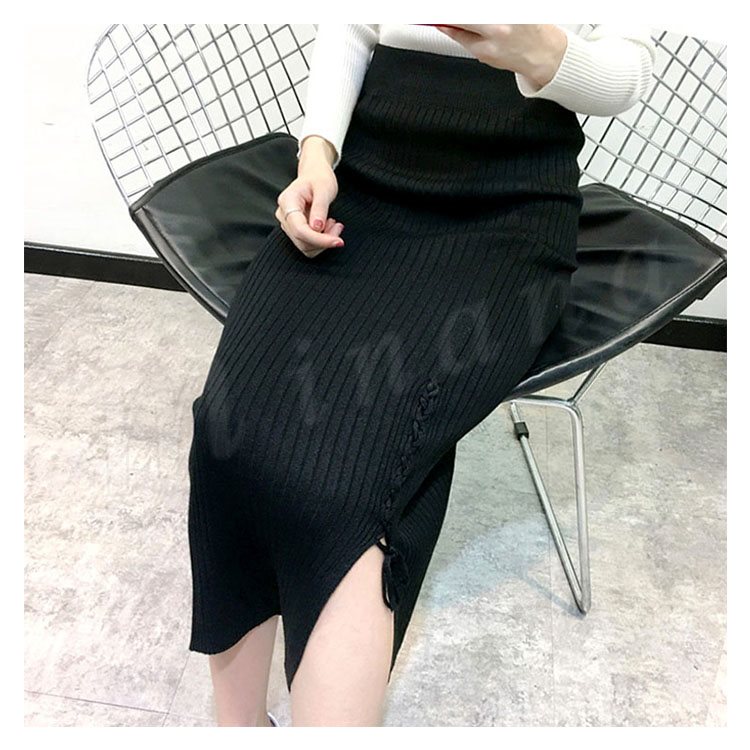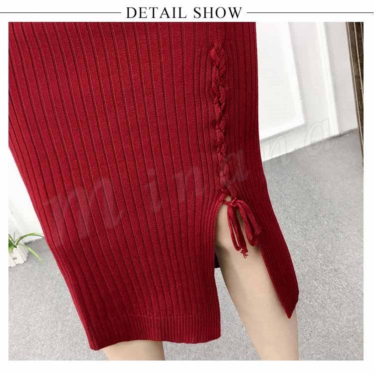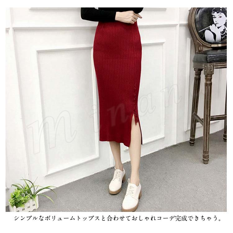 片方スリットに編み上げた!ニットスカート スカート ニット素材 ロング丈 ニット ミモレ丈スカート 編み上げ スリットスカート リブニット 春秋 レデ