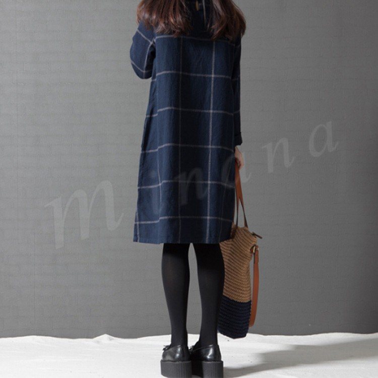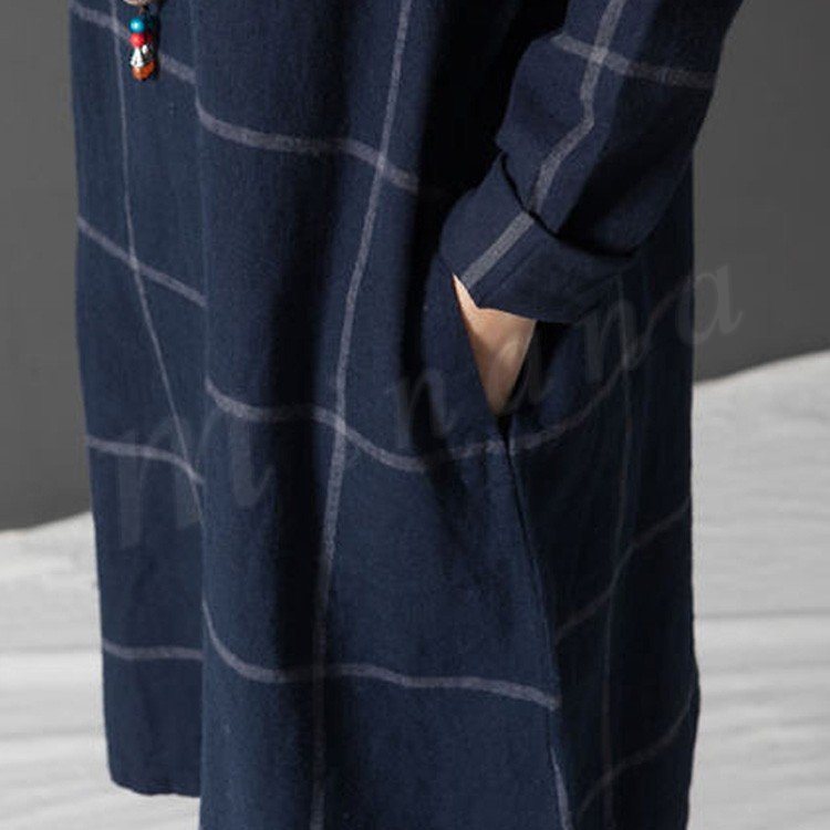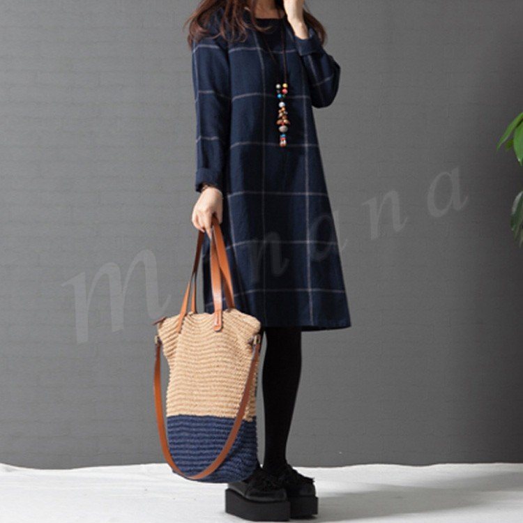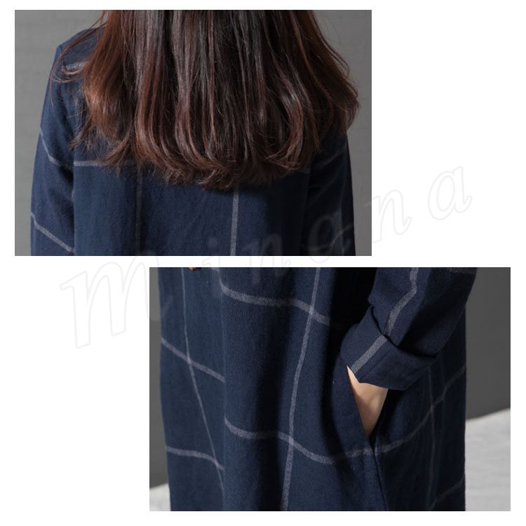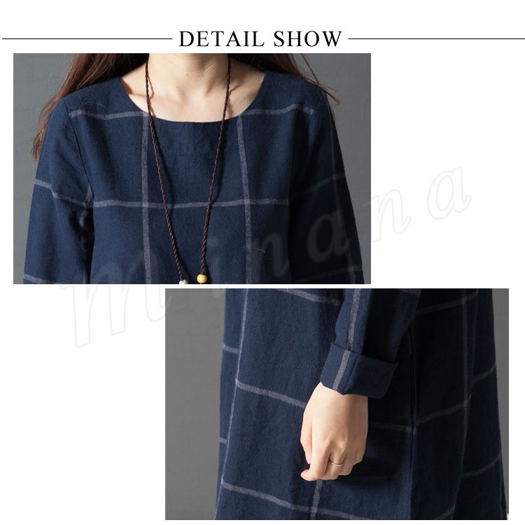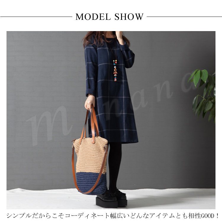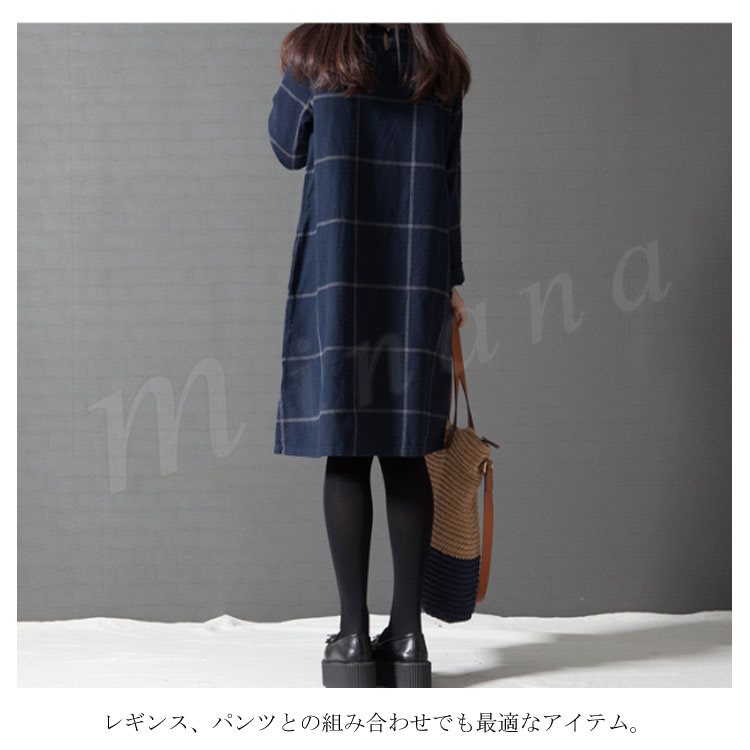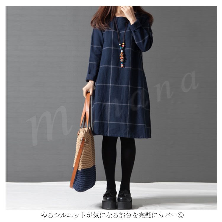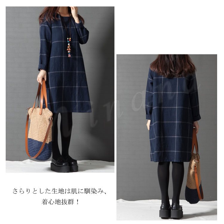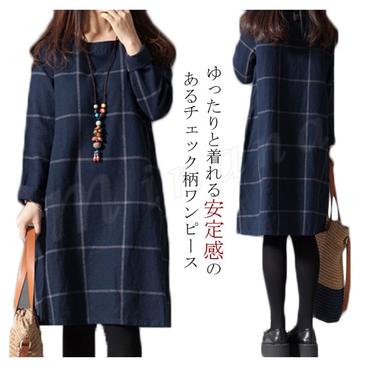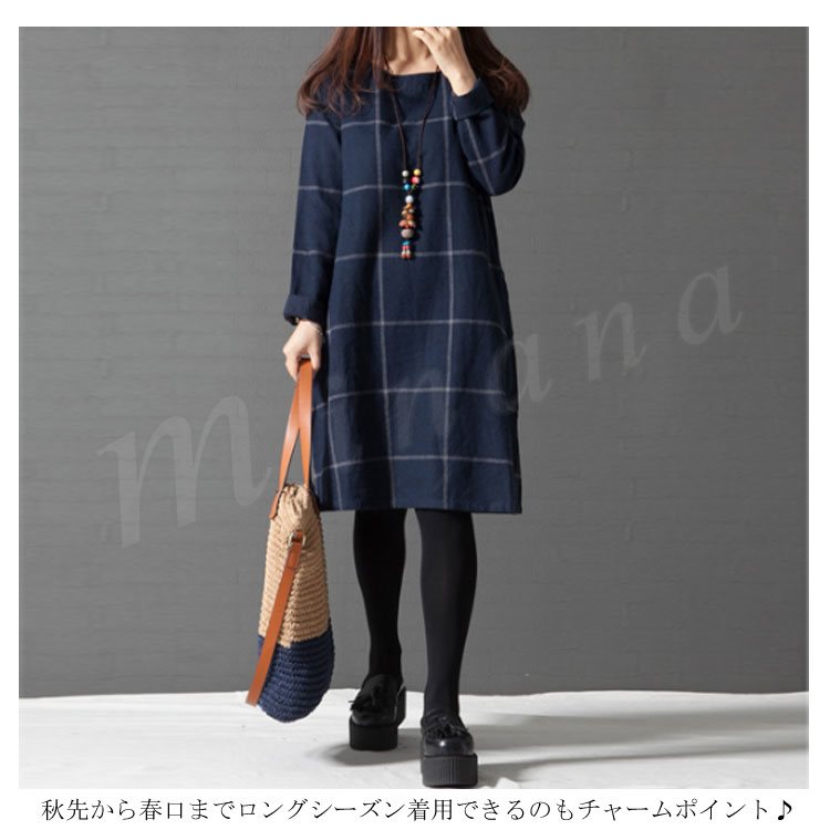 長袖ワンピース チェック柄 ゆったり Aライン ラウンドネック 長袖 膝丈 ワンピース ポケット付き レディース しっかり 体型カバー 秋服 秋冬