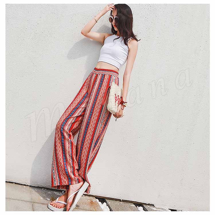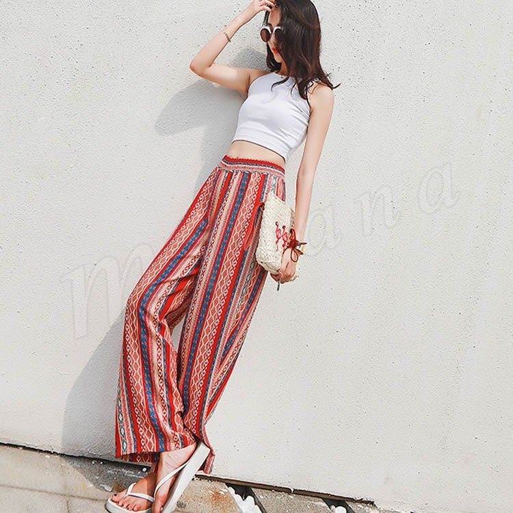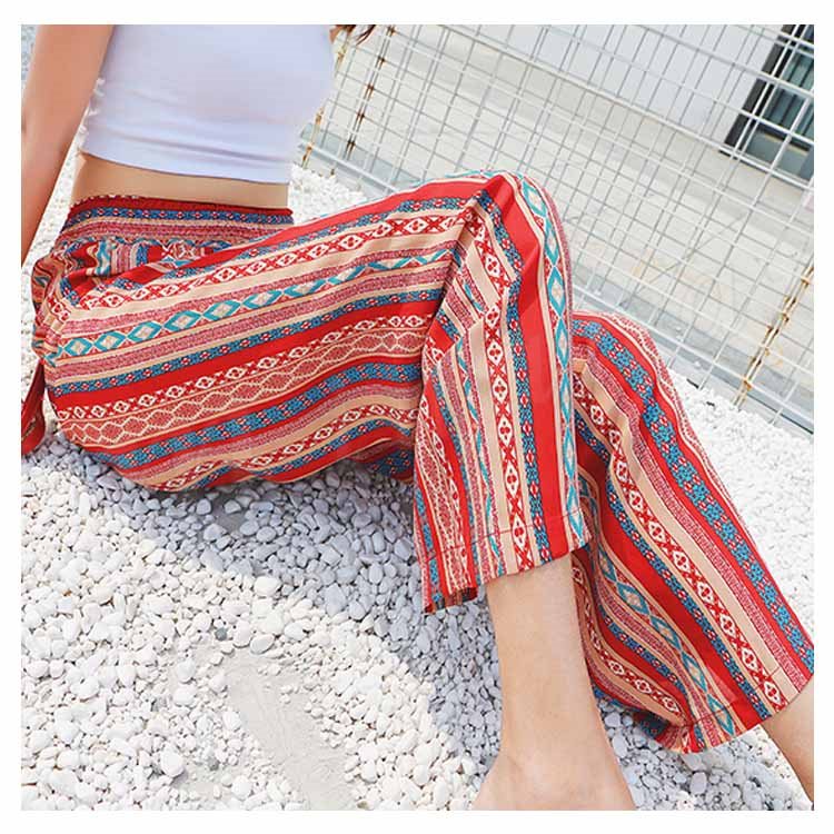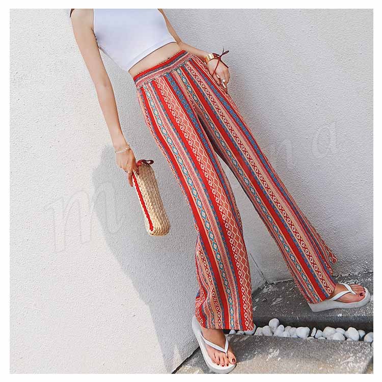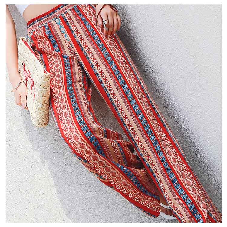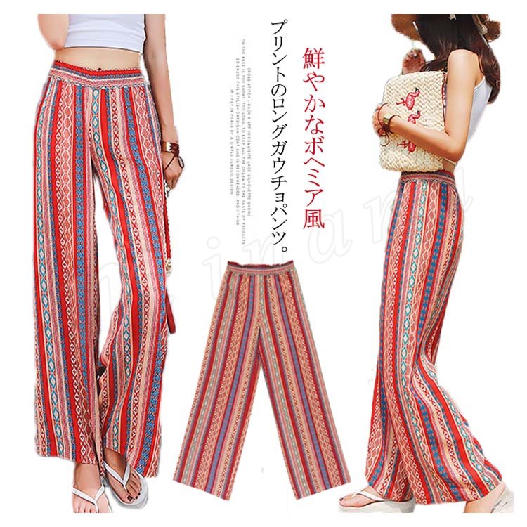 鮮やかなボヘミア風プリントのロングガウチョパンツ。