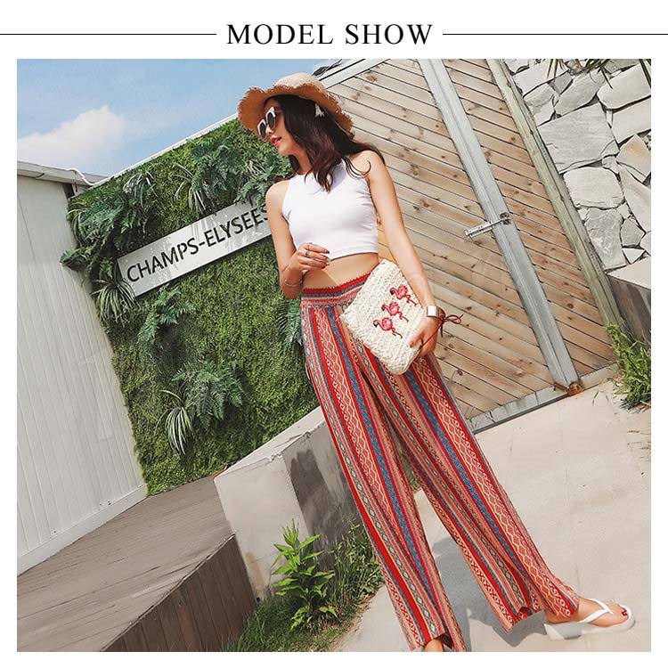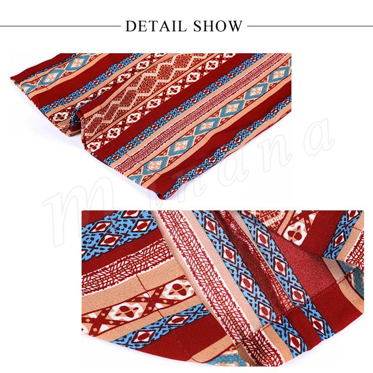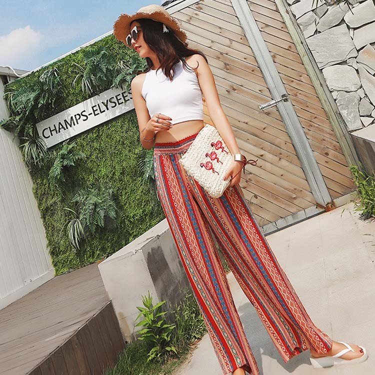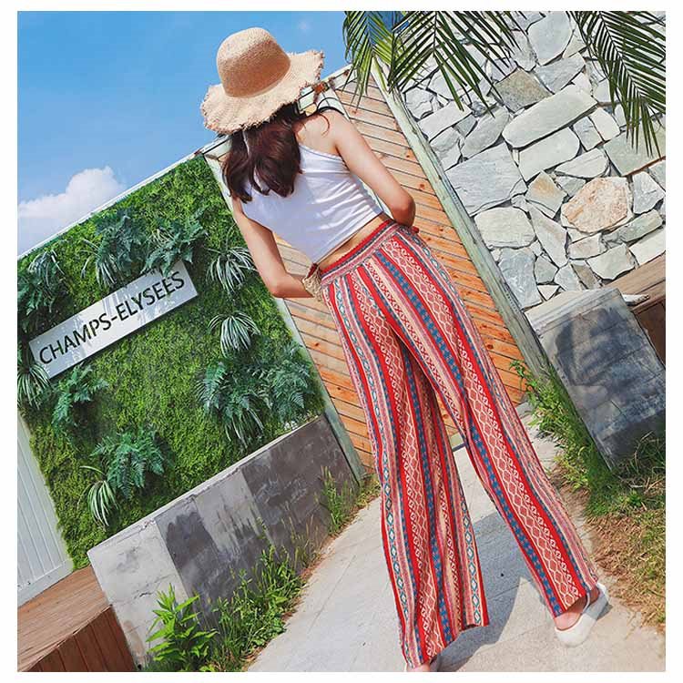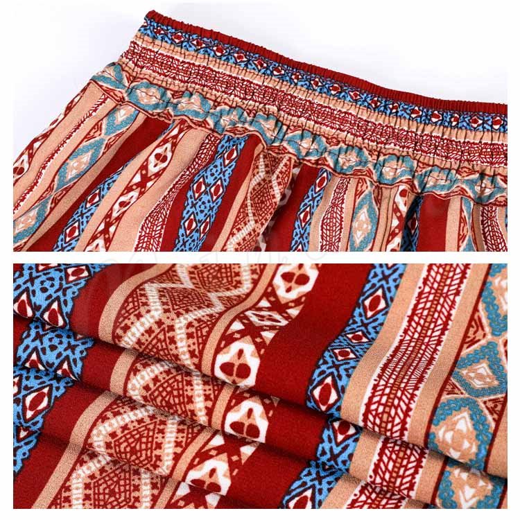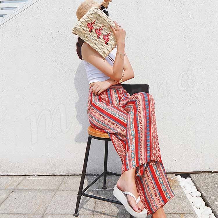 鮮やかなボヘミア風プリントのロングガウチョパンツ。