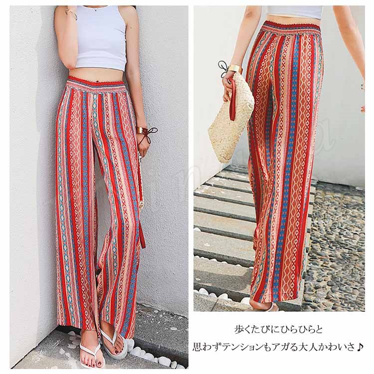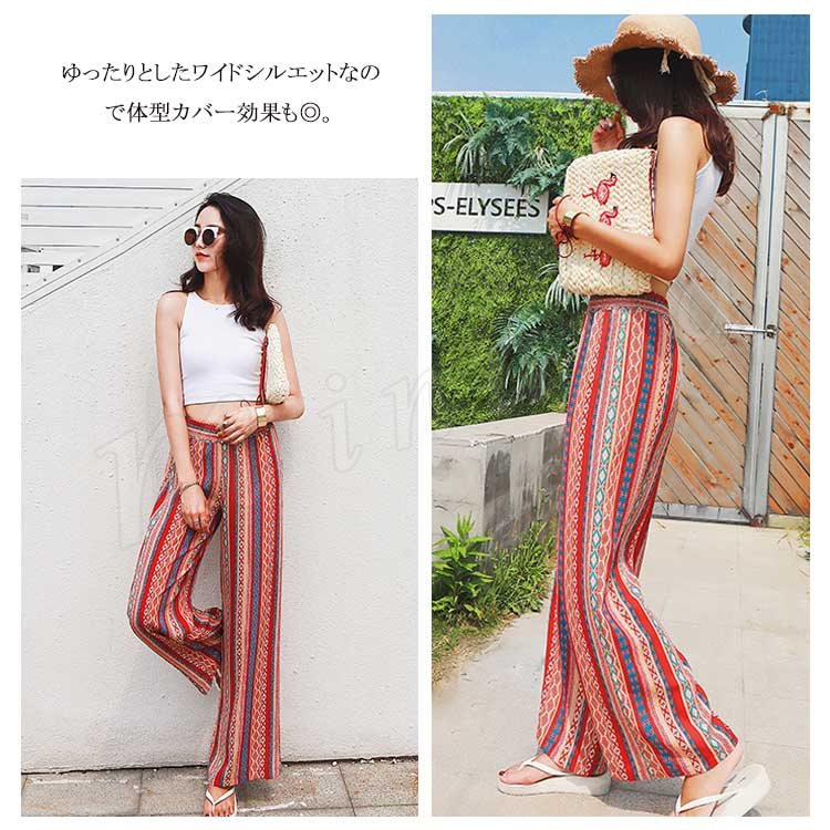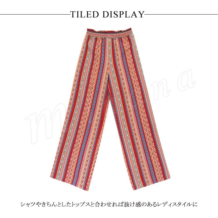 | 鮮やかなボヘミア風プリントのロングガウチョパンツ。 さらっとしたシフォン素材を使用し、着心地最高。 ゆったりとしたワイドシルエットなので体型カバー効果も◎。 ハイウエストがゴムタイプも着脱ぎ楽チン。 歩くたびにひらひらと思わずテンションもアガる大人かわいさ♪ ロゴTシャツと合わせればちょっぴりリゾート気分になれそうなラフスタイルを大演出! シャツやきちんとしたトップスと合わせれば抜け感のあるレディスタイルに | |
