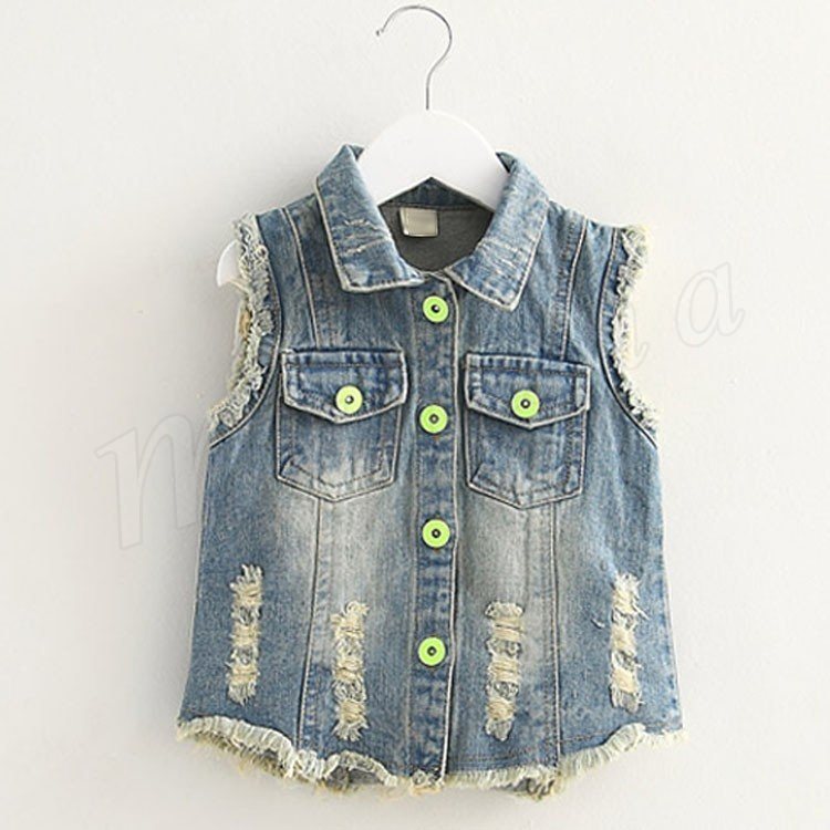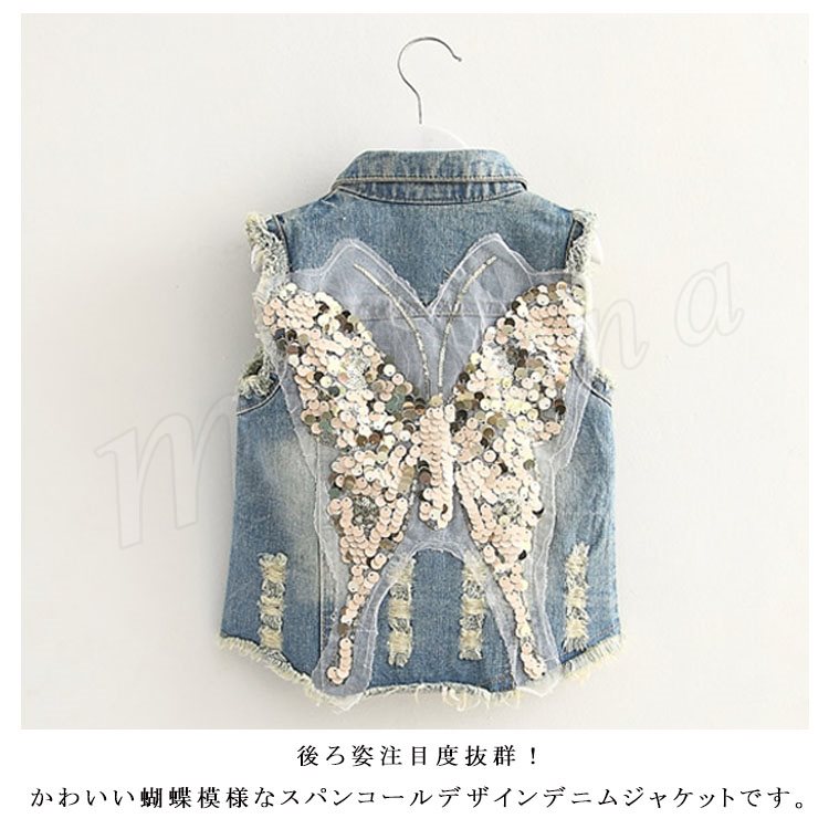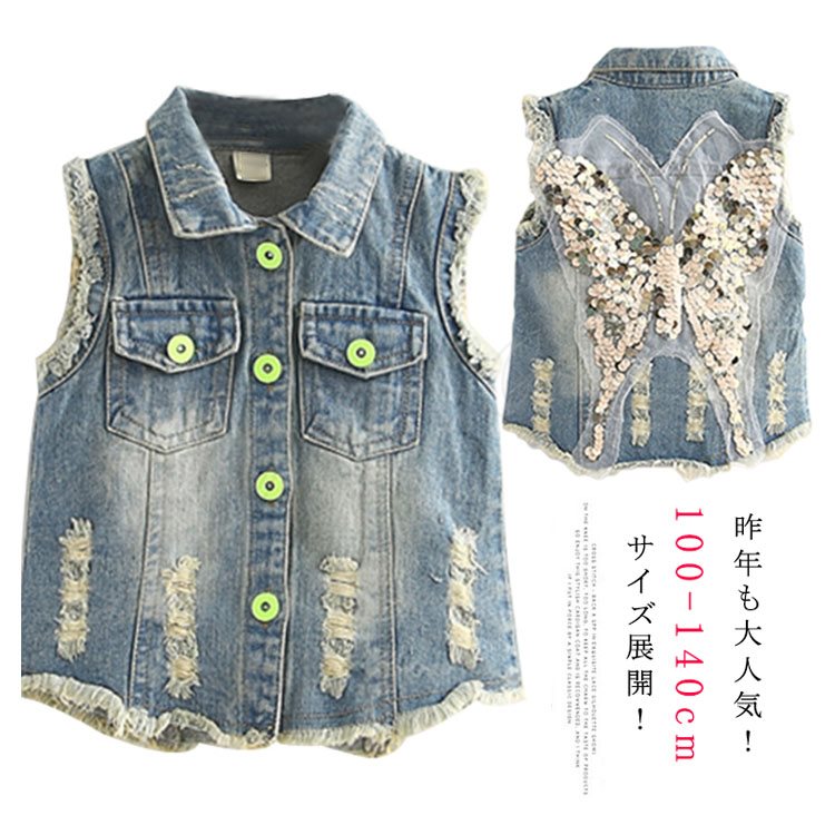 100-140cmサイズ!スパンコールベスト クラッシュ加工 女の子 デニムベスト 子供服 Gジャン デニム ベスト ダメージ加工 Gベスト