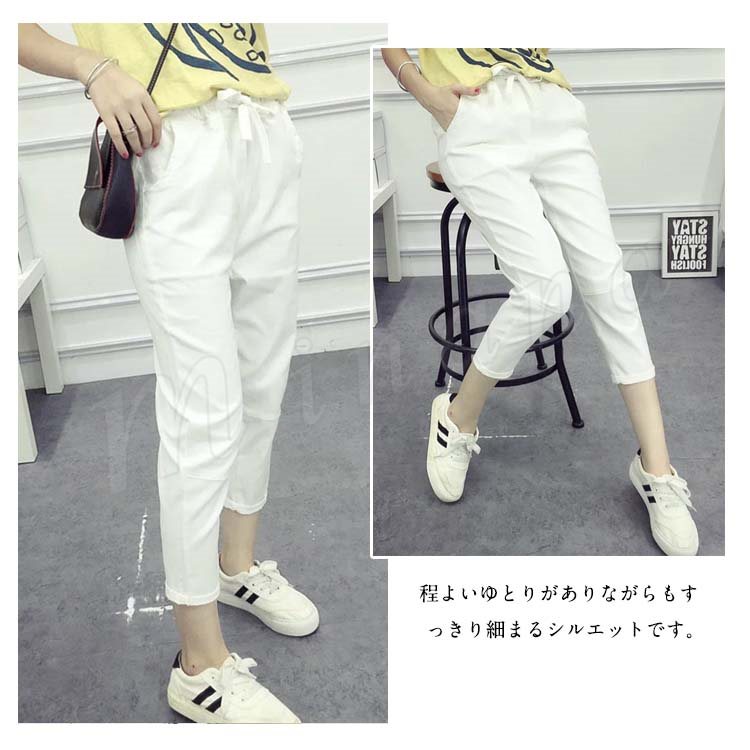 | 着回し力抜群な涼しげなテーパードパンツ。 柔らかくて薄手コットン素材を採用。 程よいゆとりがありながらもすっきり細まるシルエットです。 体形を気にせず気軽に履くだけで、オシャレ上級者コーデになるのもポイントです!! ウェストゴムが楽ちん!!紐でサイズの調節も可能となるのも嬉しい。 トップスを選ばず今季デイリーに活躍する1本です! | |