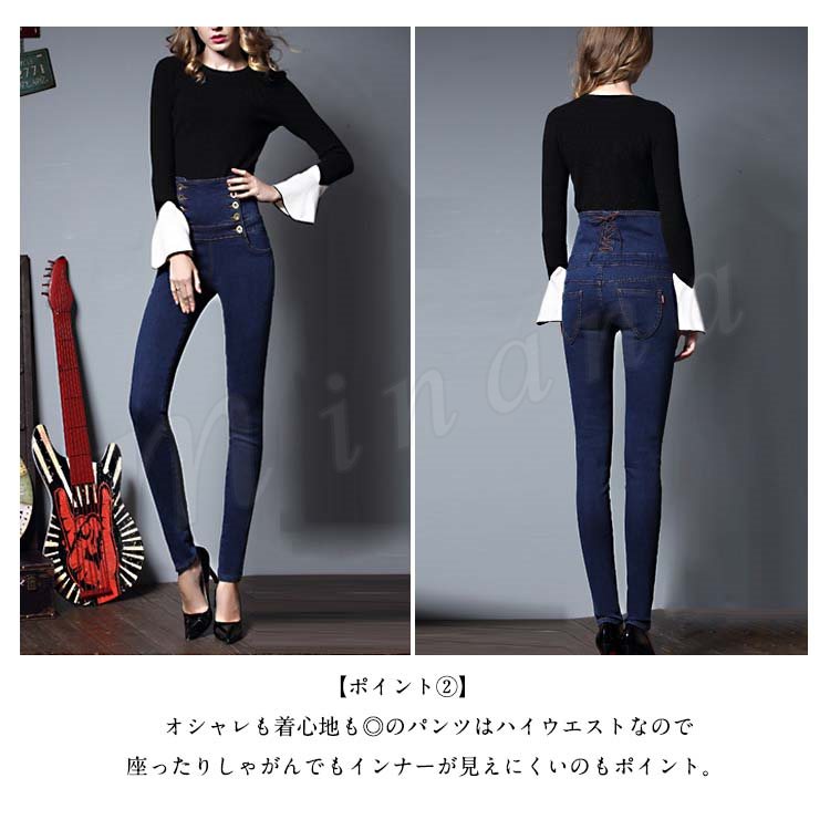 | 吸い付く様なフィット感のあるデニムパンツ♪ ハイウエストでウエスト位置を高く見せます。 キュッと締めてスタイルUP効果を驚くほど発揮☆ スタイリングのおしゃれPOINTになること間違いなし★ | |