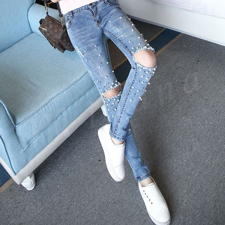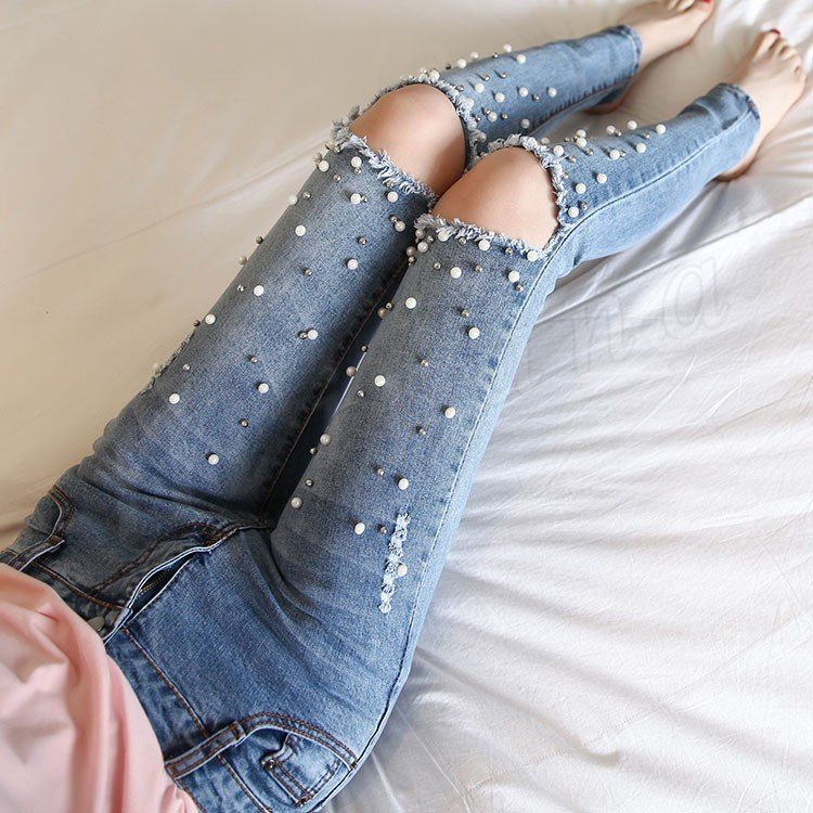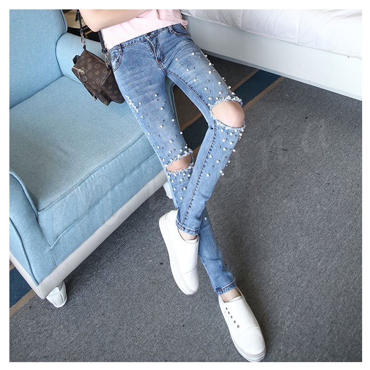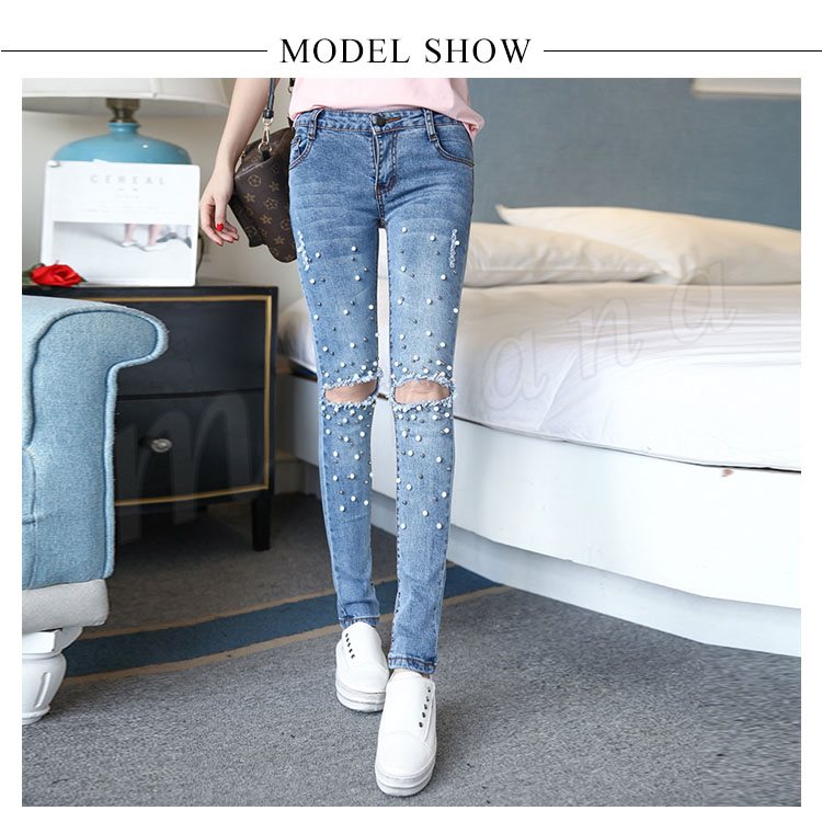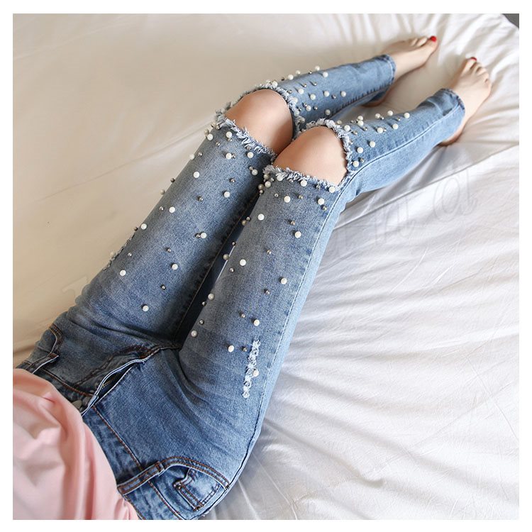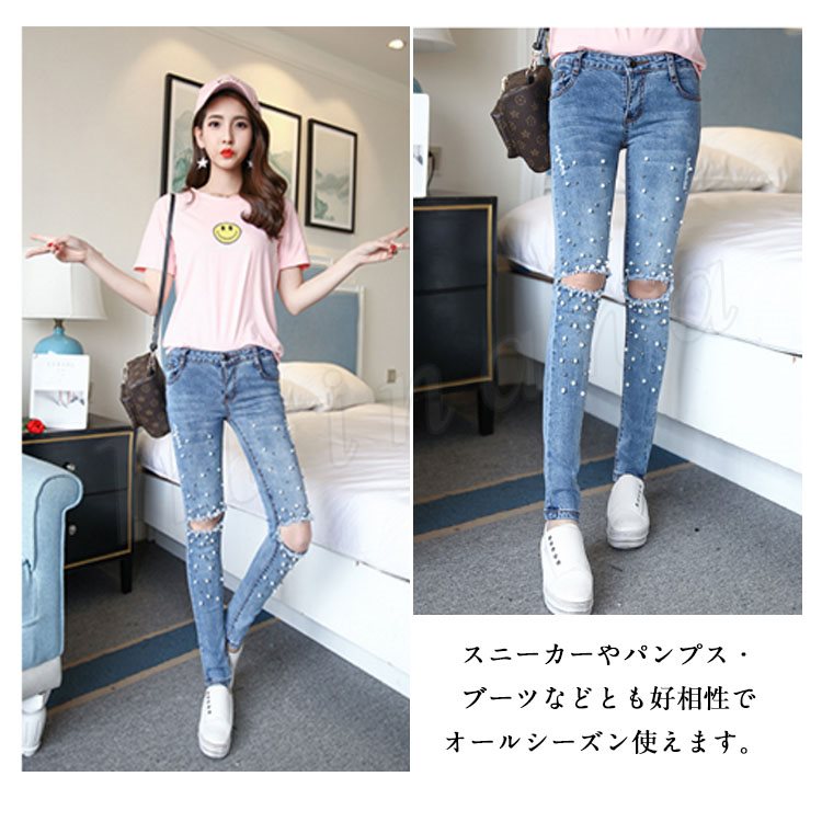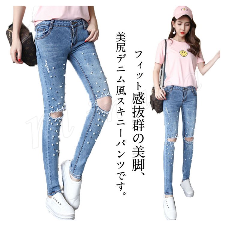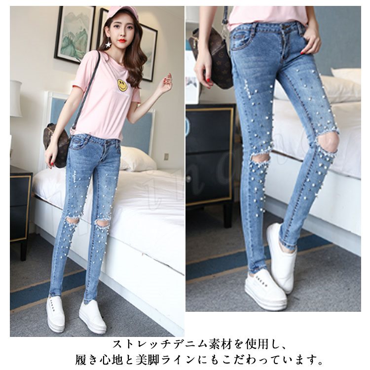 デニムパンツ スキニーパンツ レディース ダメージズボン ビジュー付き ジーンズ ジーパン パール付き 個性 独特 セクシー 春夏 伸縮性 お