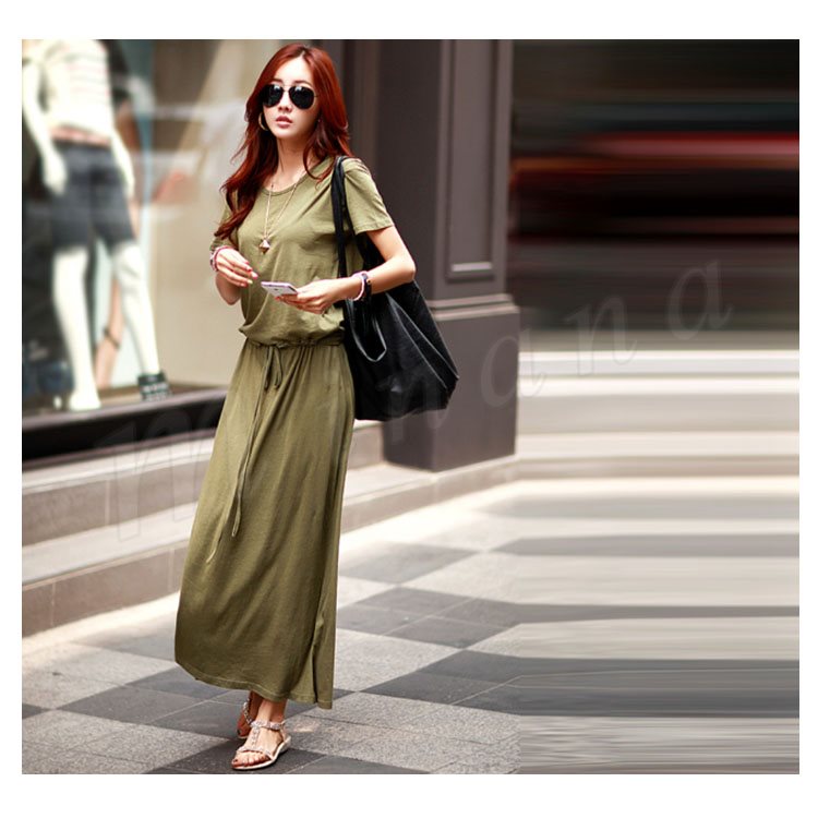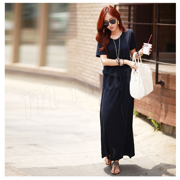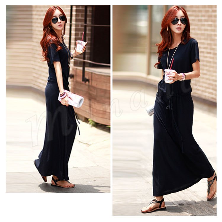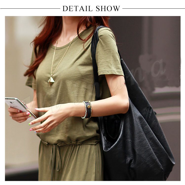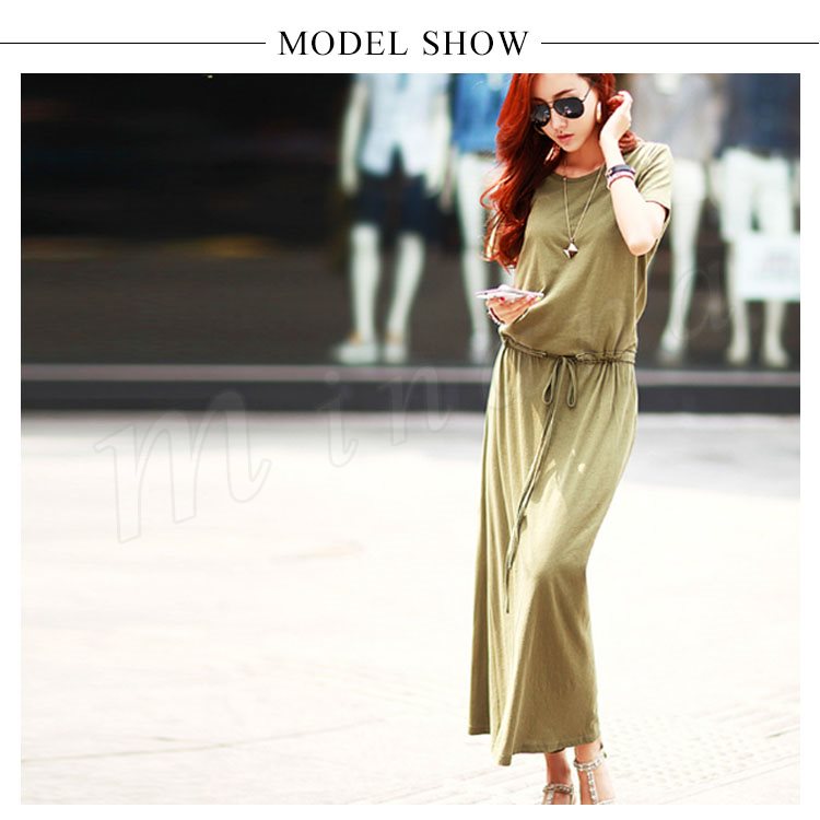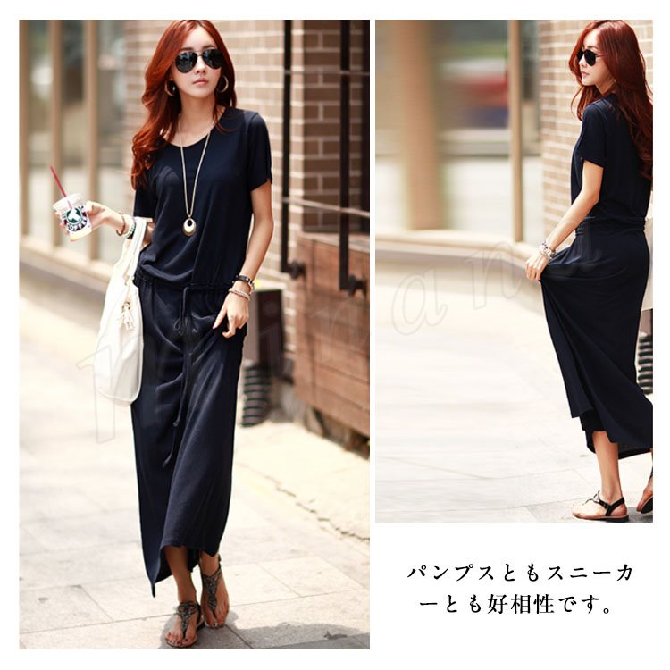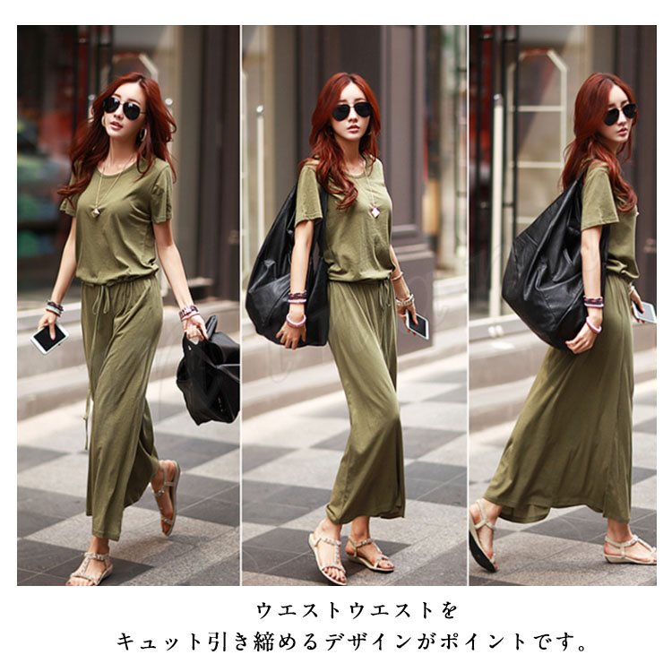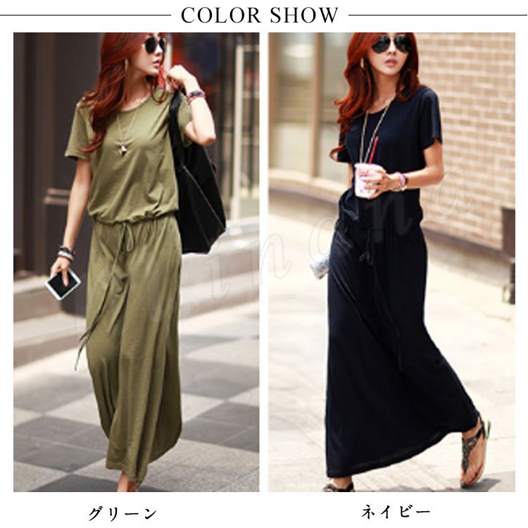 ワンピース ロングワンピース マキシ丈 レディース 半袖 クルーネック 無地 ふんわり ウエストゴム お洒落 カジュアル リゾート ゆったり