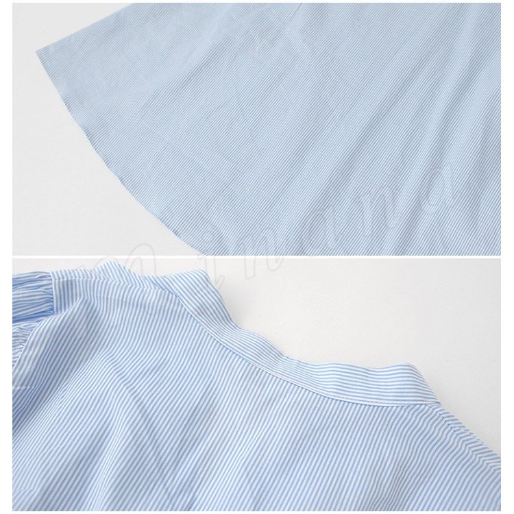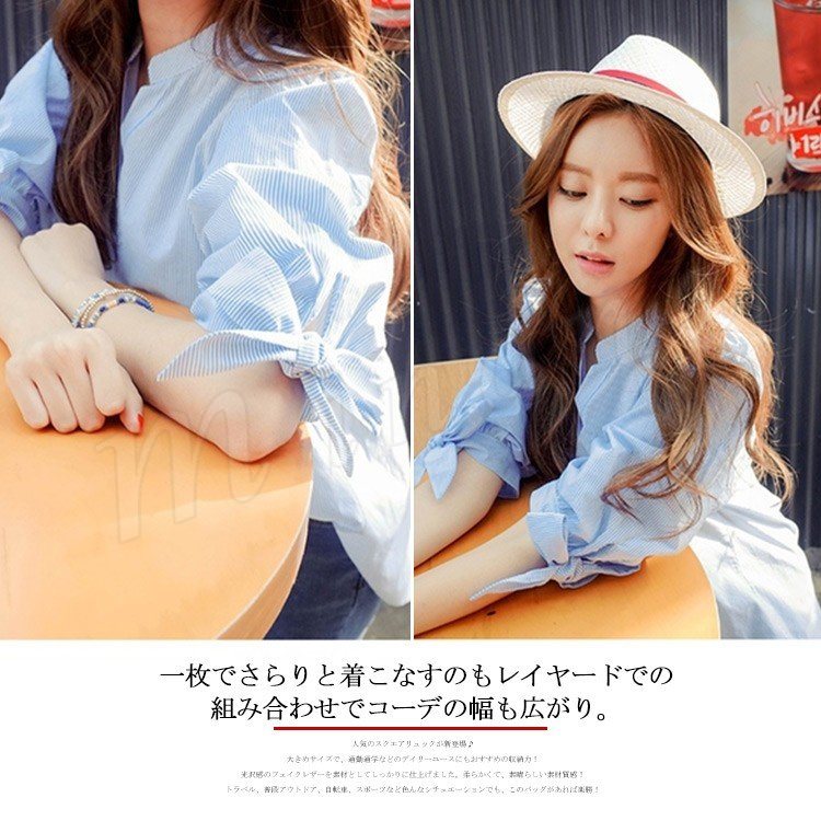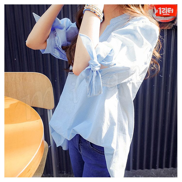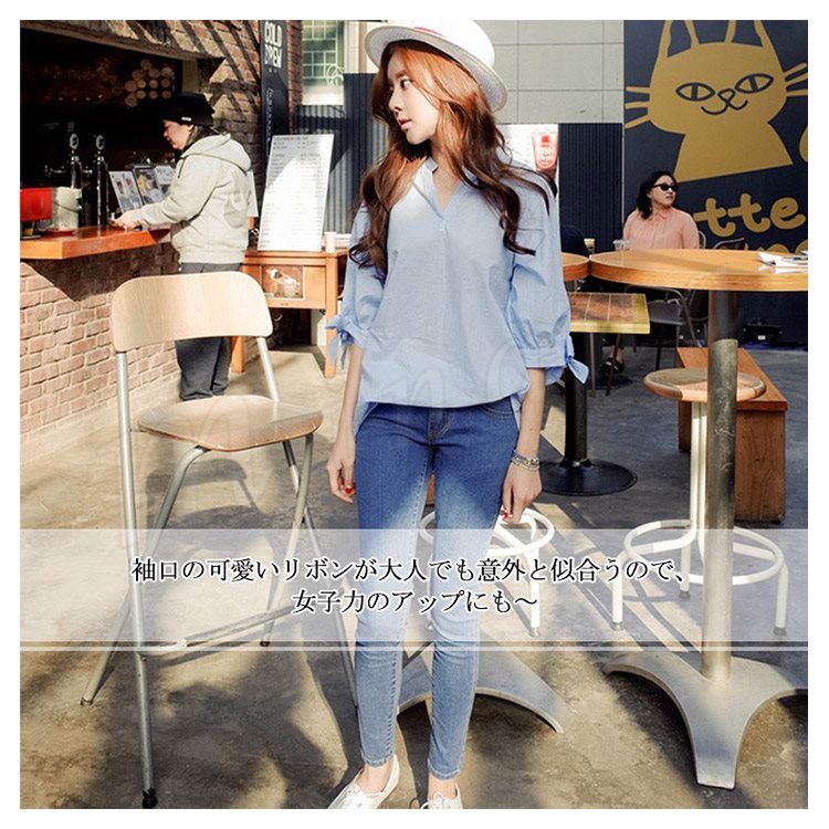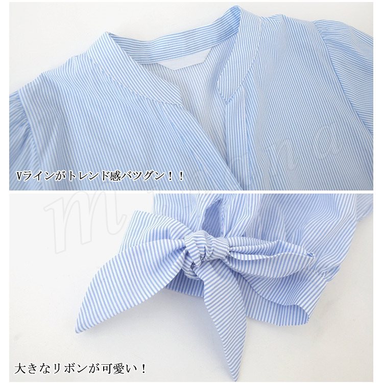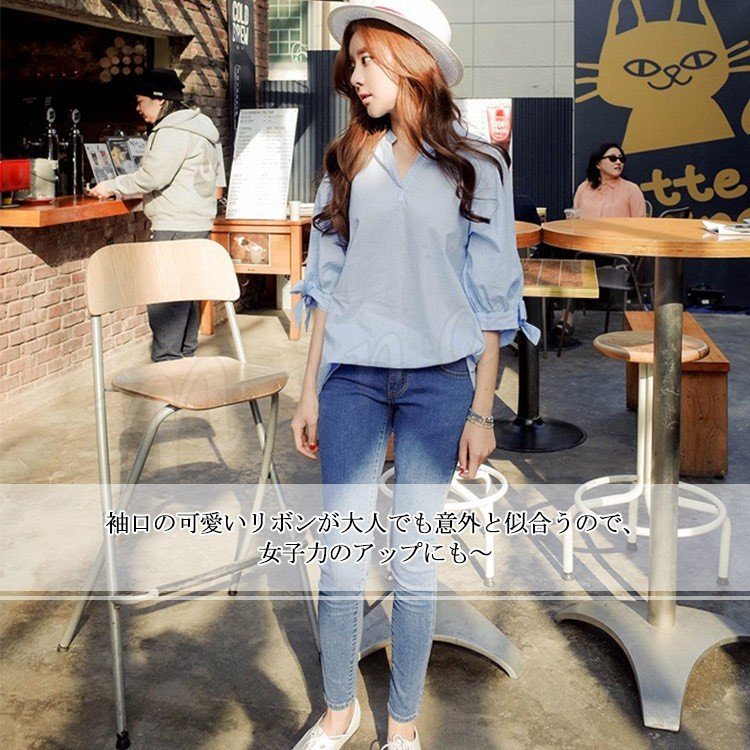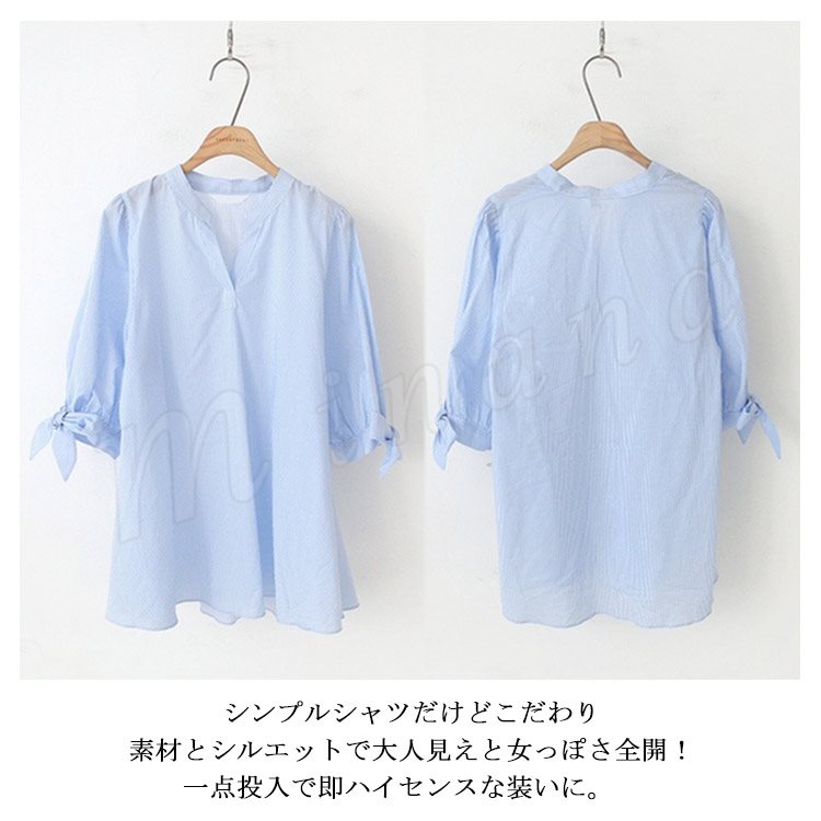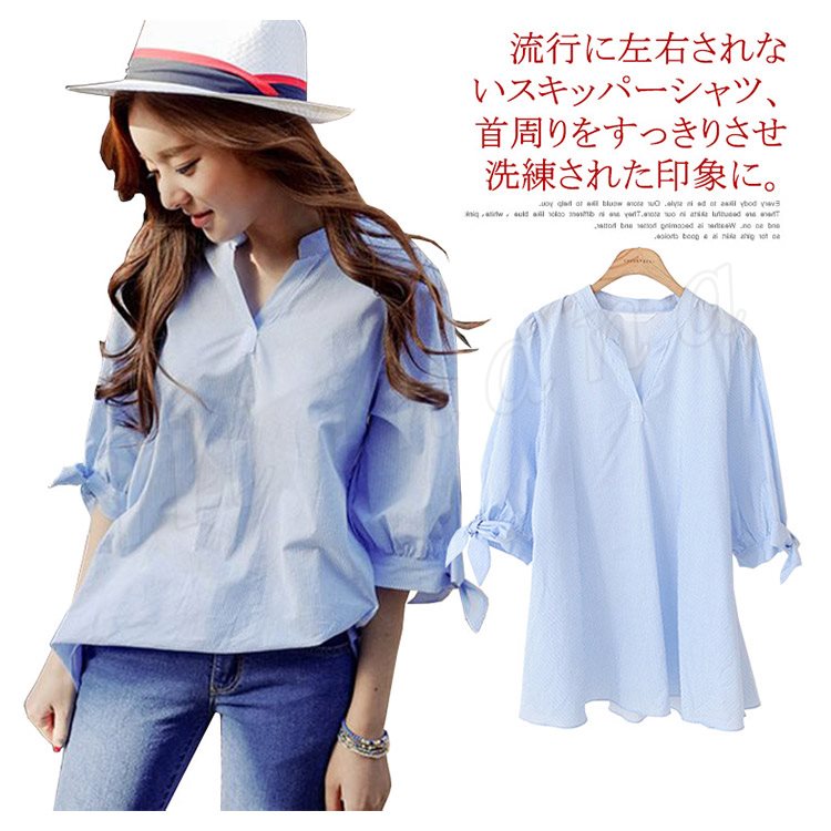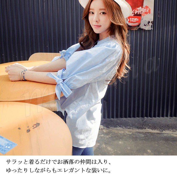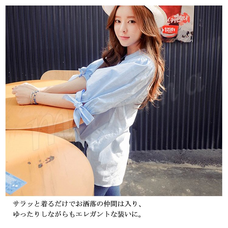 7分袖 シャツ ストライブ柄 スキッパーシャツ レディース 袖リボン シャツ ブラウス スキッパー シャツ チュニック 長袖 通勤 フェミニ