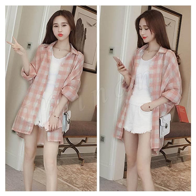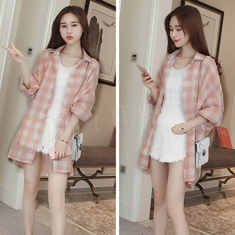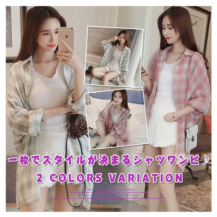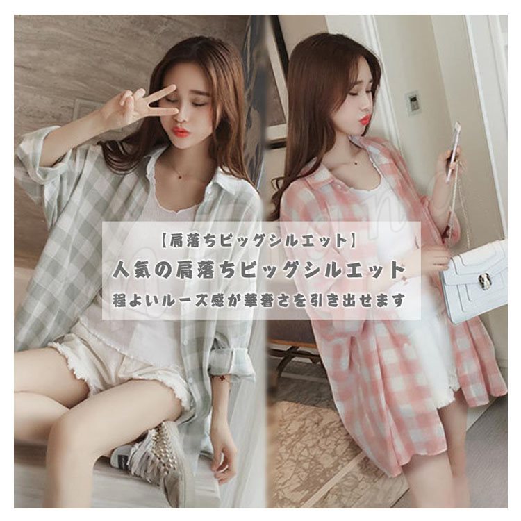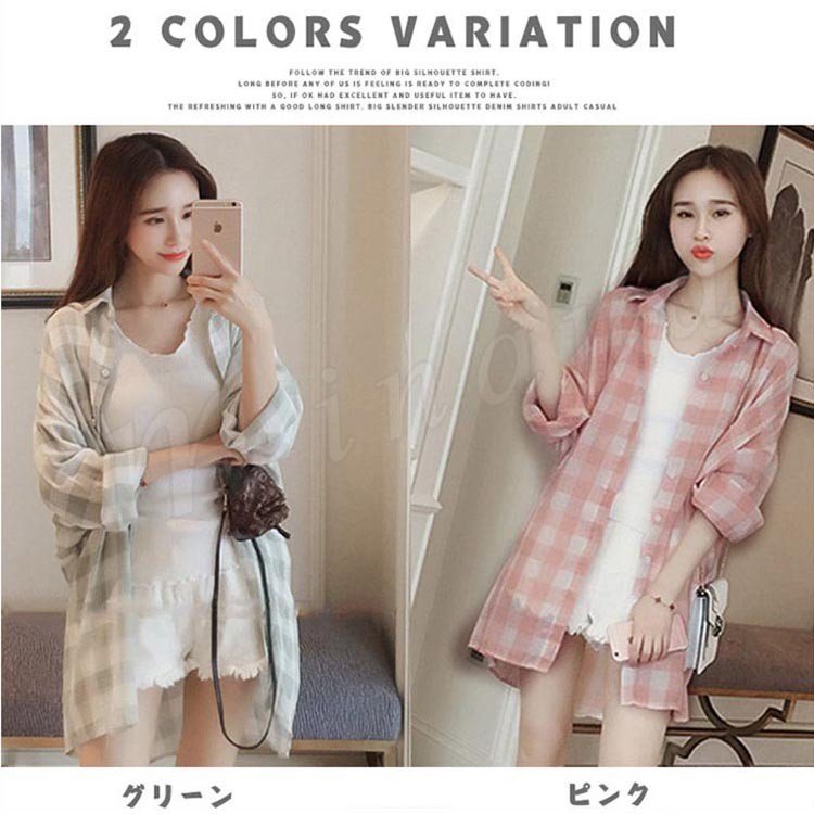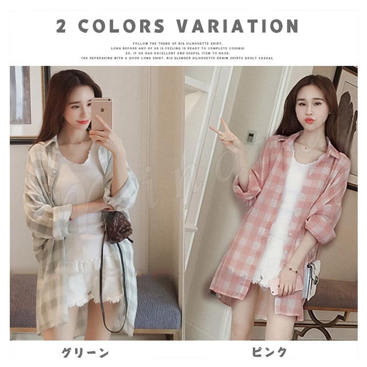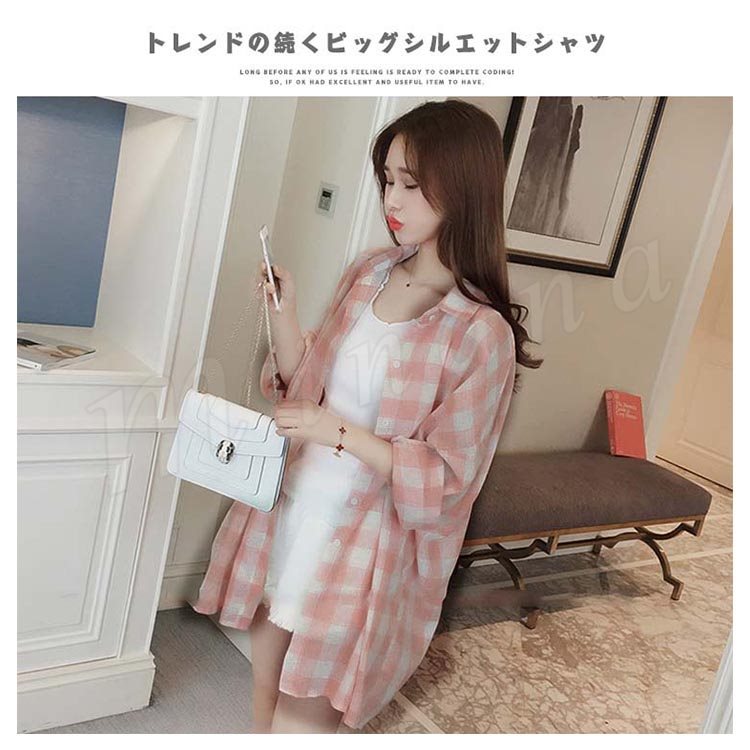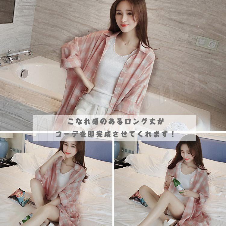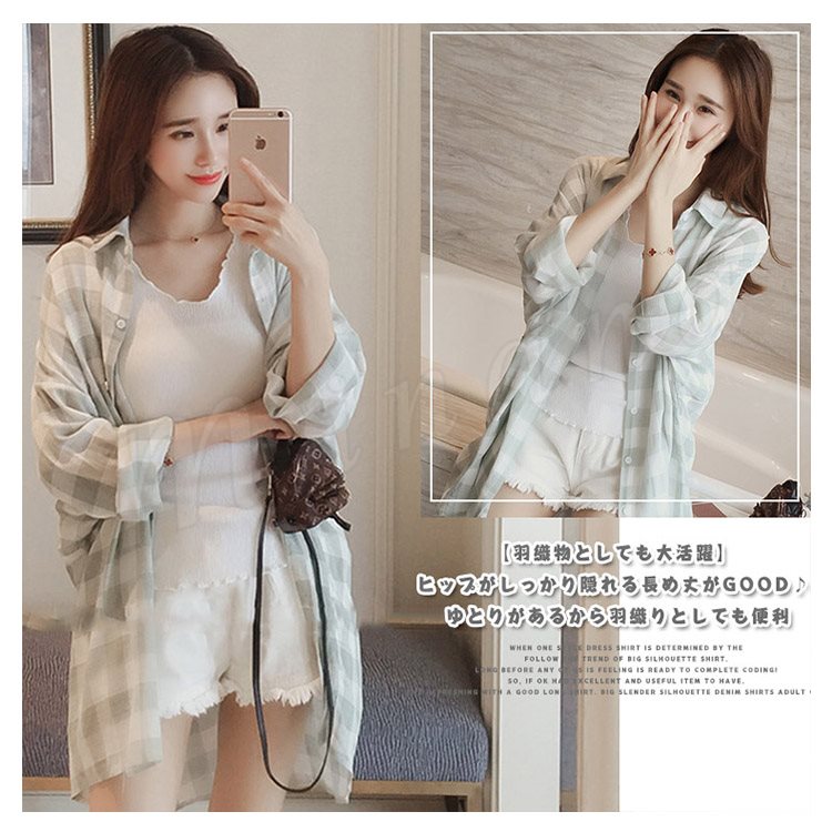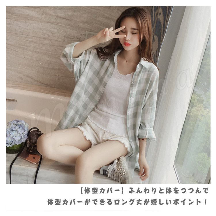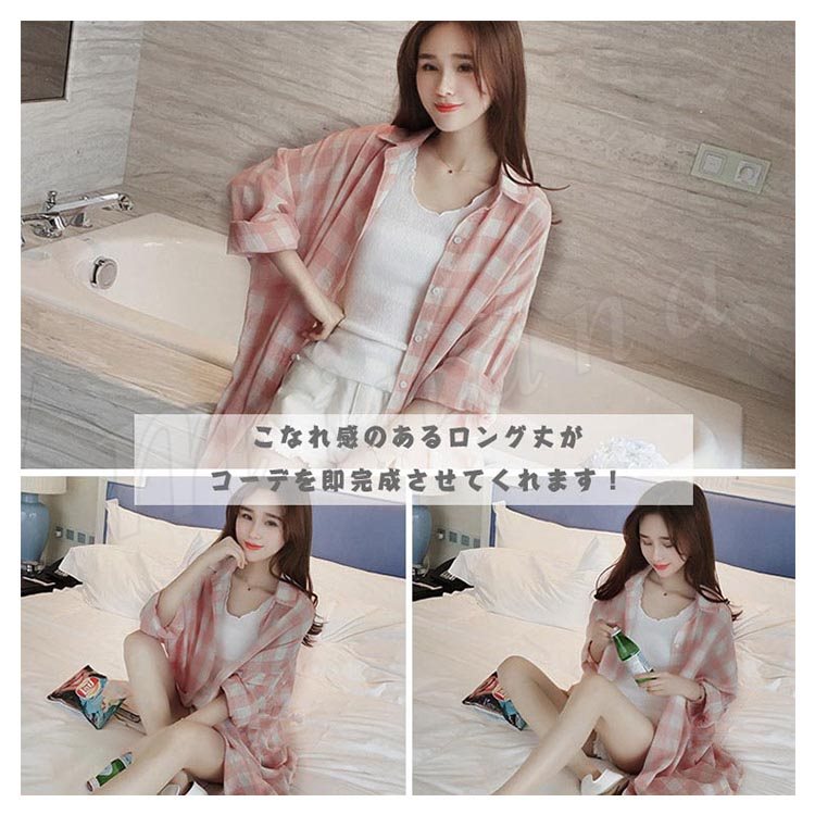 [2色]シャツ レディースビッグシルエットシャツ ロング丈 9分袖ロングシャツ シャツ春夏格子柄 シンプル チュニック 羽織り 羽織物 コット