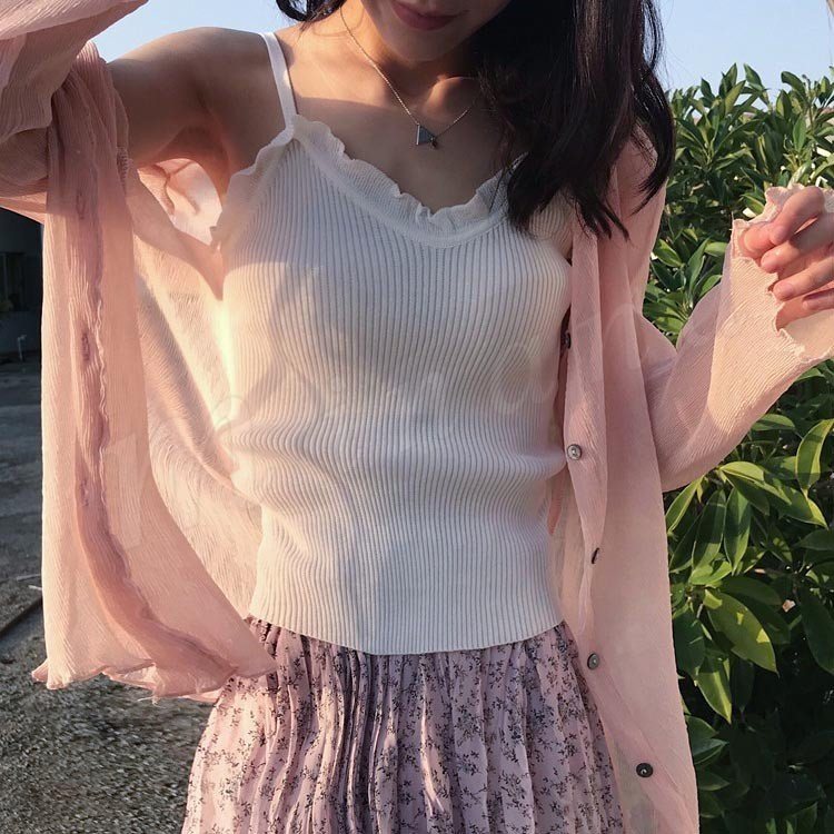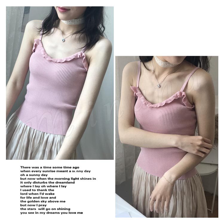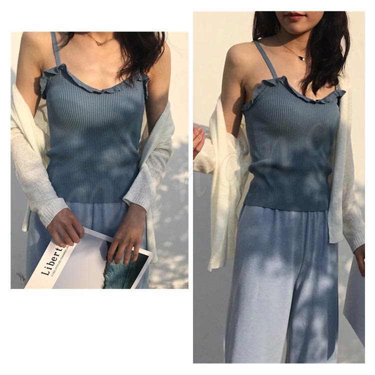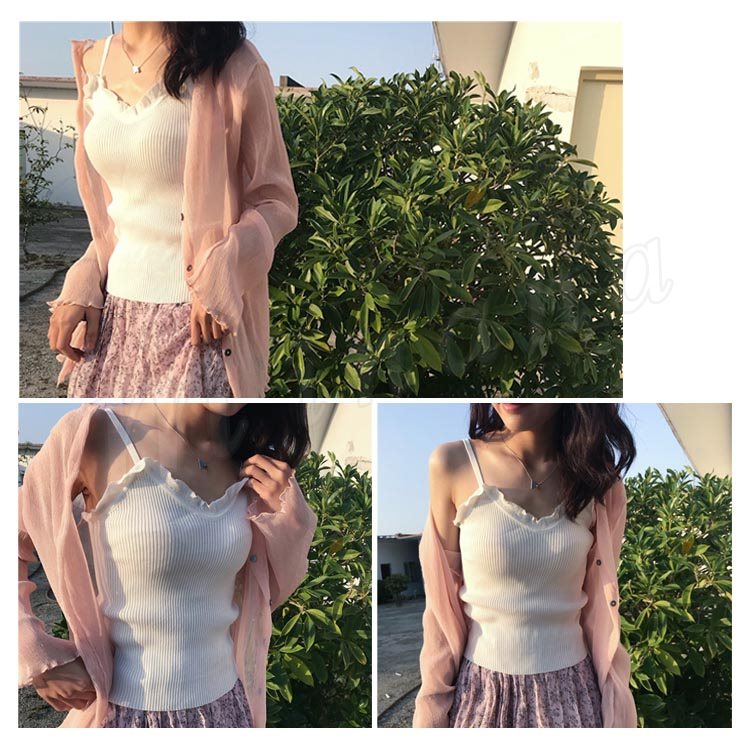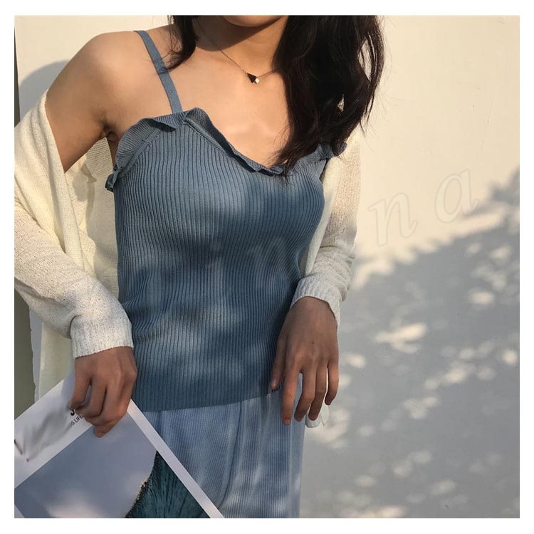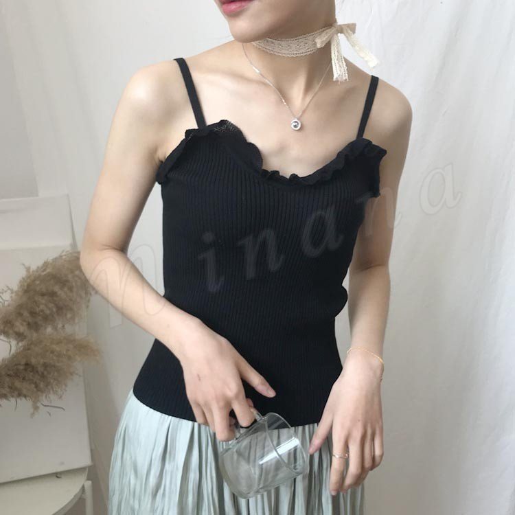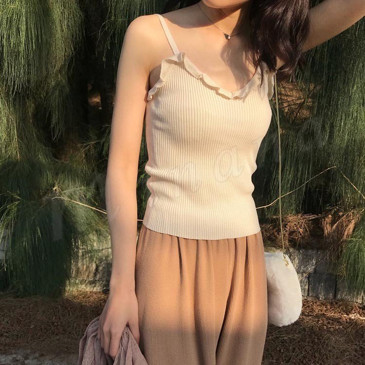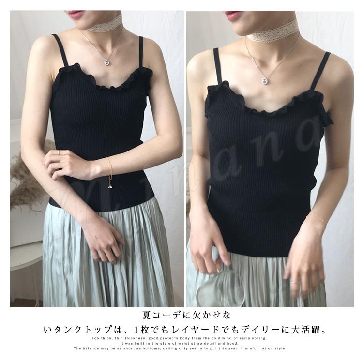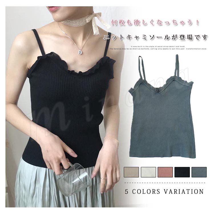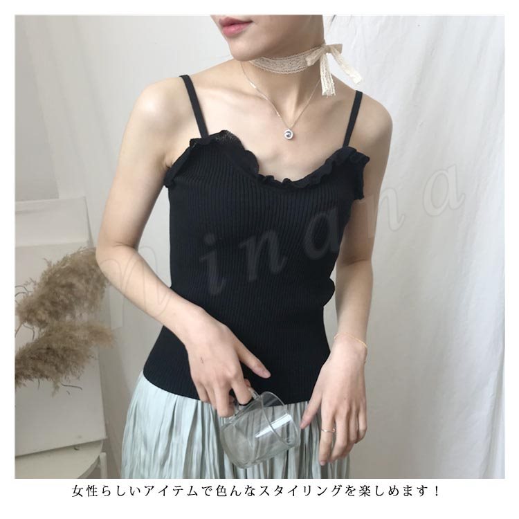 フリル キャミソール リブ編み インナー レディース Vネック ニット キャミソール タンクトップ サマーニット 無地 セクシー カットソー