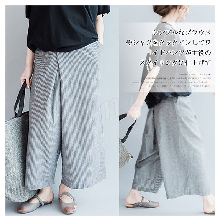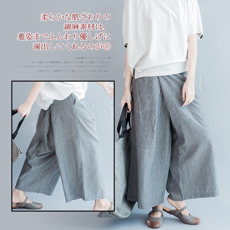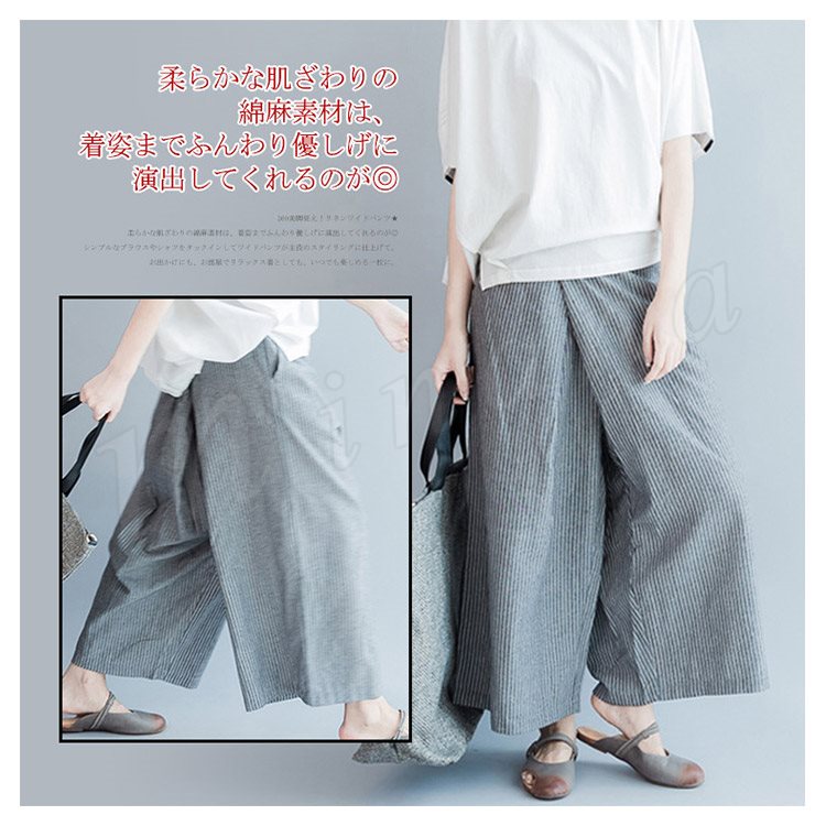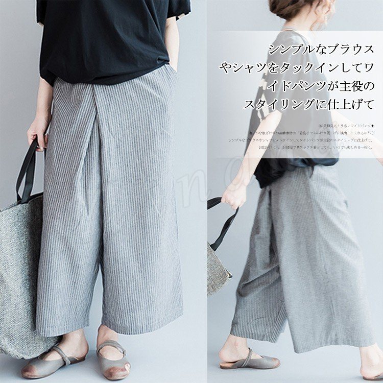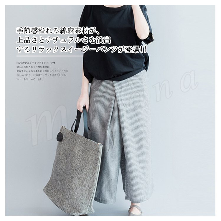 | 360美脚見え!リネンワイドパンツ★ 柔らかな肌ざわりの綿麻素材は、着姿までふんわり優しげに演出してくれるのが◎ シンプルなブラウスやシャツをタックインしてワイドパンツが主役のスタイリングに仕上げて。 お出かけにも、お部屋でリラックス着としても、いつでも楽しめる一枚に。 | |