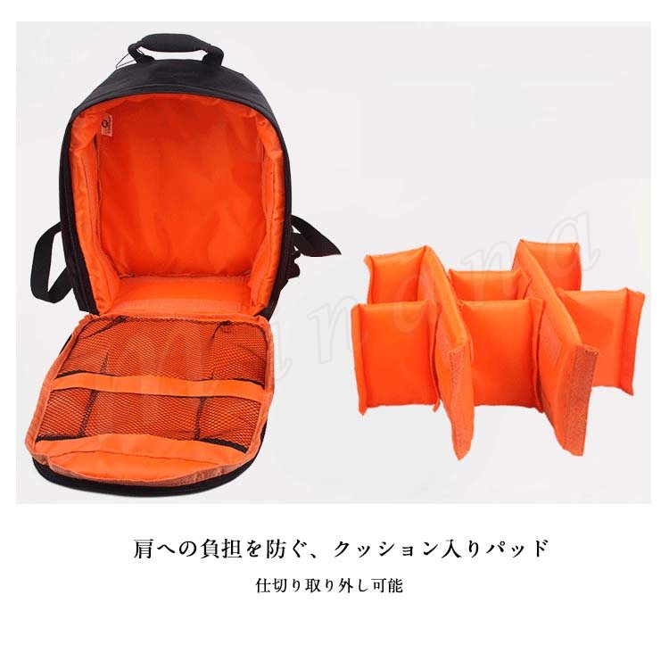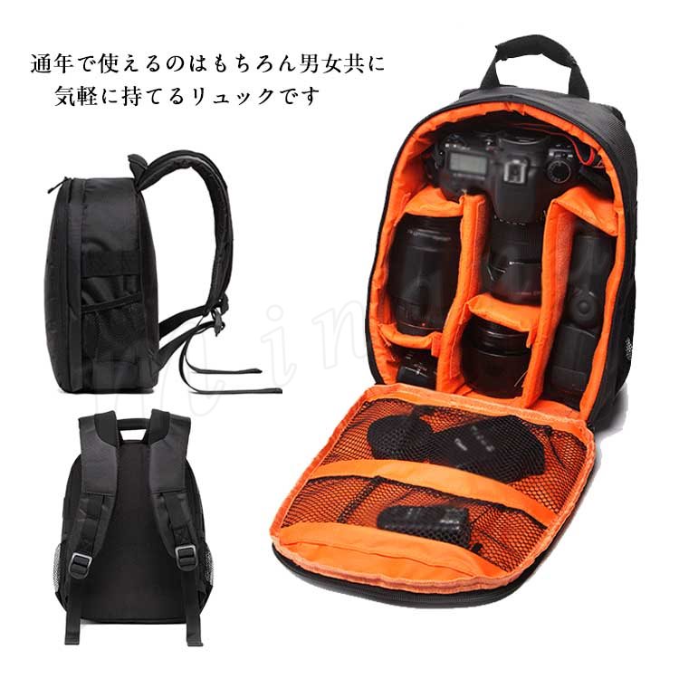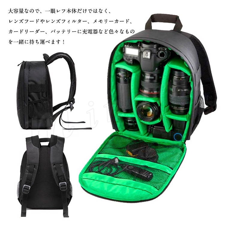 | 一眼カメラやレンズなどのアクセサリー収納も可能な、リュックタイプのカメラバッグ。 大容量なので、一眼レフ本体だけではなく、レンズフードやレンズフィルター、メモリーカード、カードリーダー、バッテリーに充電器など色々なものを一緒に持ち運べます! 通年で使えるのはもちろん男女共に気軽に持てるリュックです。 | |