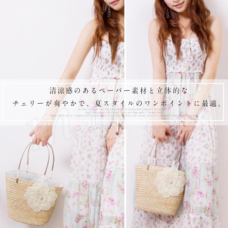 | 遊び心のあるフラワーデザイン。持つだけでハッピーな気分! シンプルコーデにプラスしたいサマーかごバッグです。 清涼感のあるペーパー素材と立体的なチェリーが爽やかで、夏スタイルのワンポイントに最適。 夏の日のおでかけが楽しみになるアイテムです♪ | |