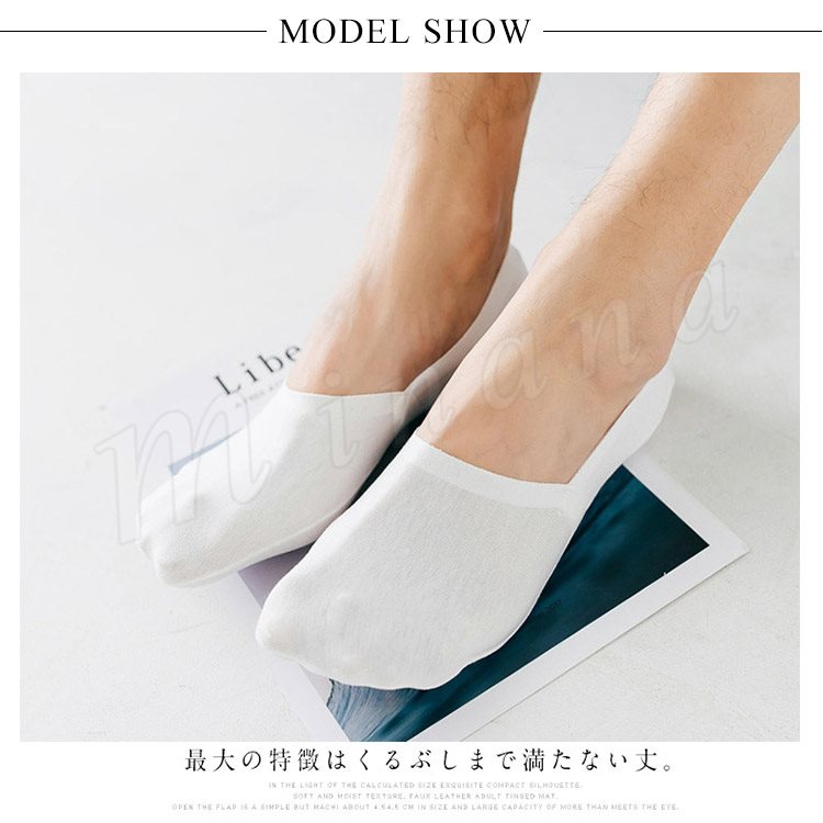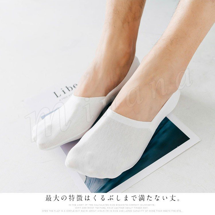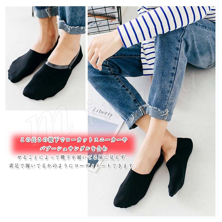 | スニーカーやドライビングシューズ等、ローカットの靴を履いたときに見える靴下のラインが一切出ない新しいタイプの靴下。 最大の特徴はくるぶしまで満たない丈。 この長さの靴下でローカットスニーカーやバブーシュサンダルを合わせることによって靴下を履いてる風に見えず、素足で履いてるかのようにコーディネートできます。 | |