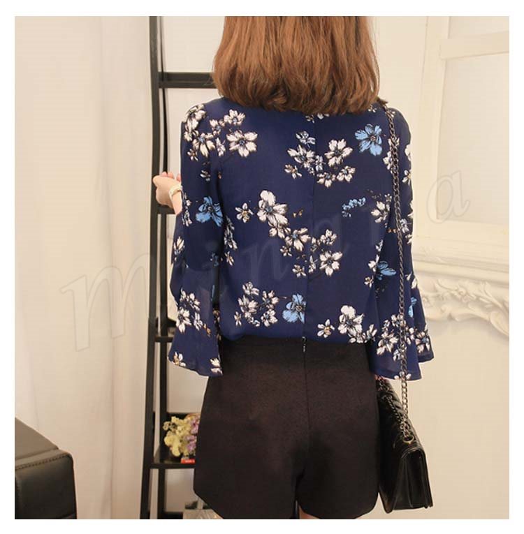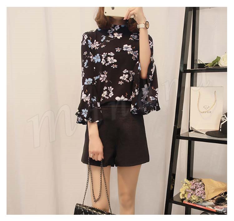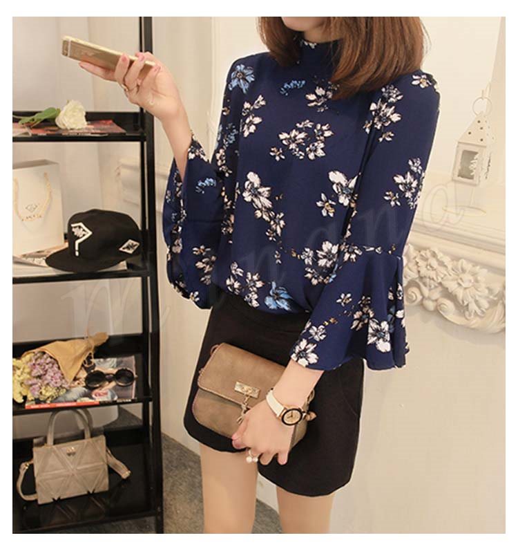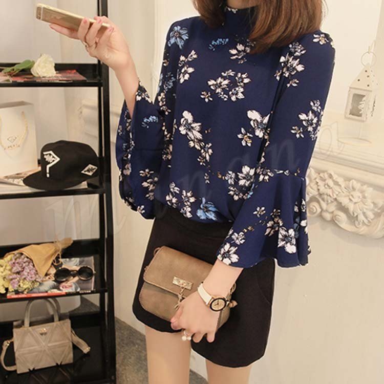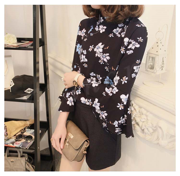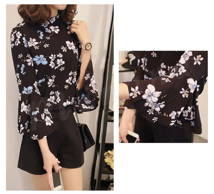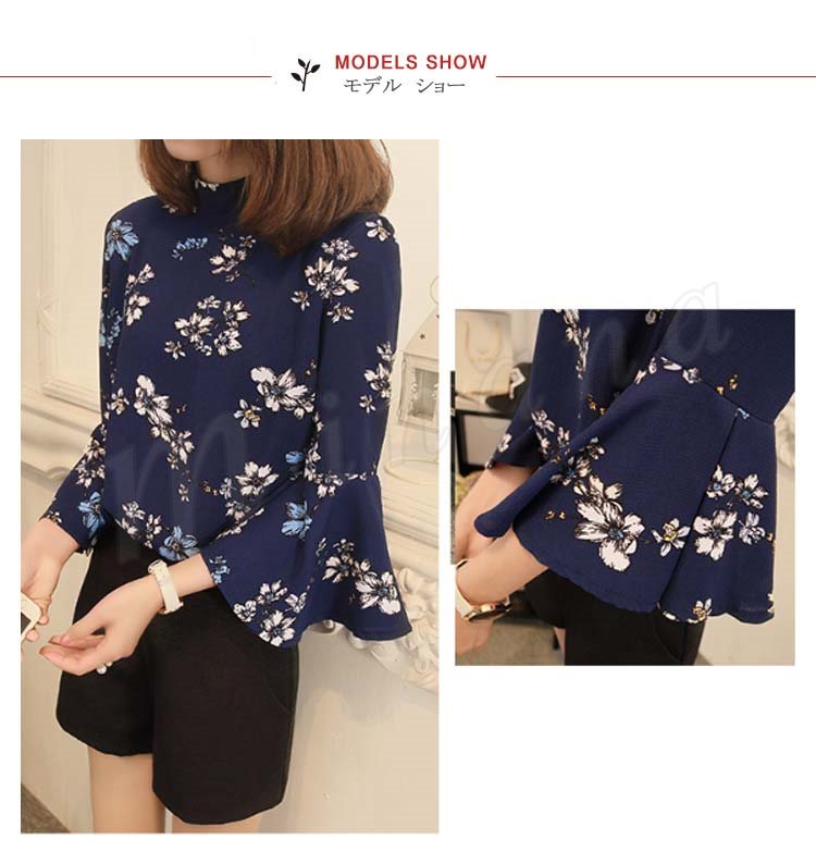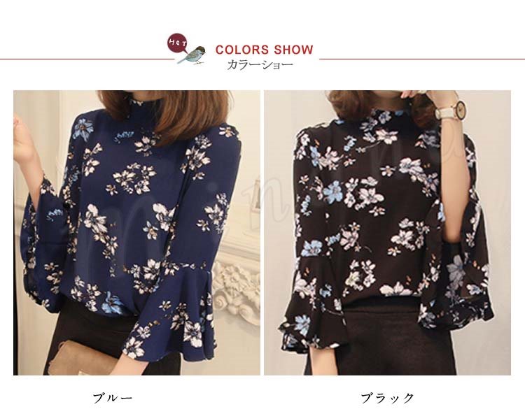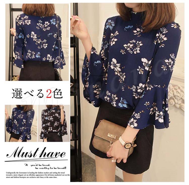 フレア袖 花柄シフォン ハイネックブラウス レディース コーデ アクセント フラワー 花柄ブラウス フレアスリーブ