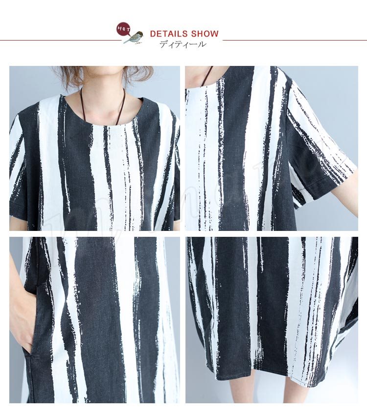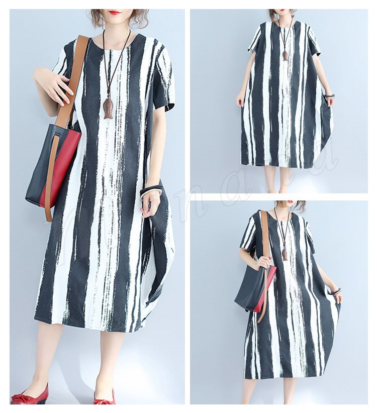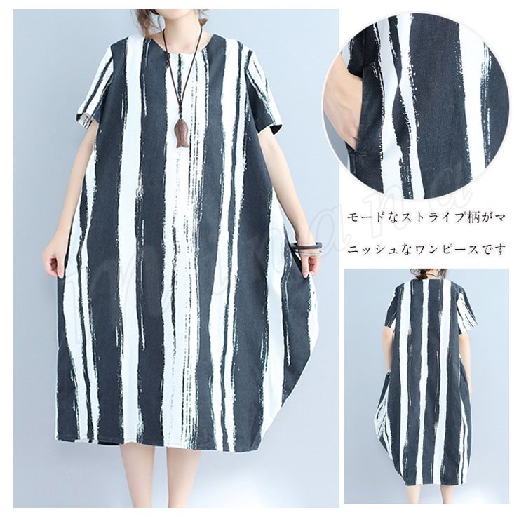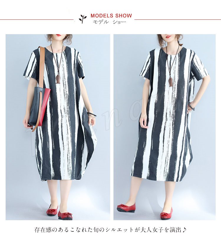 ゆったり コクーン ストライプ柄 ミモレ丈ワンピース 体型カバー