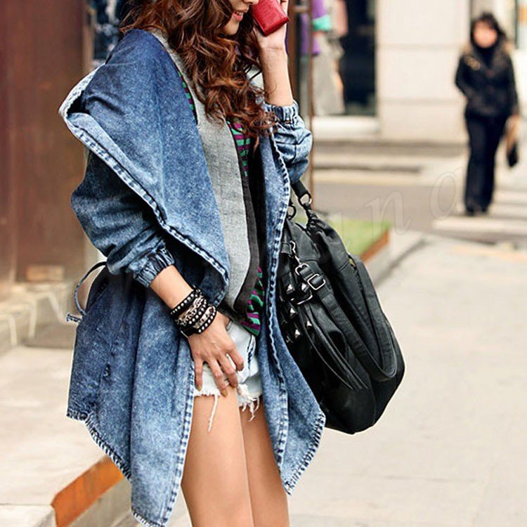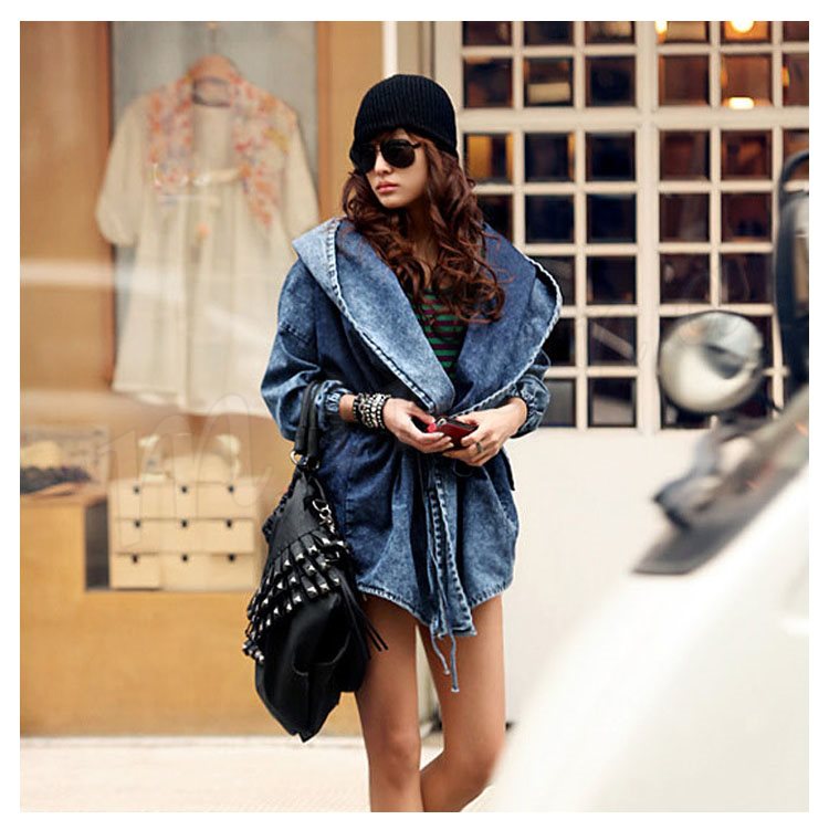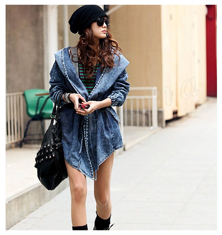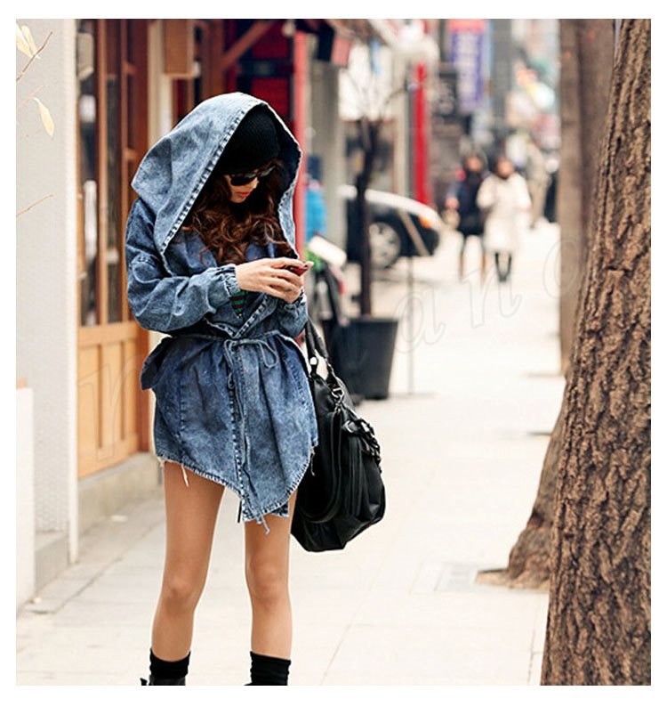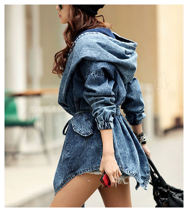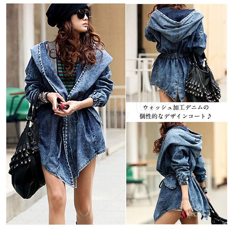 長袖 フード付きデニムコート デニムジャケット ドローストリング