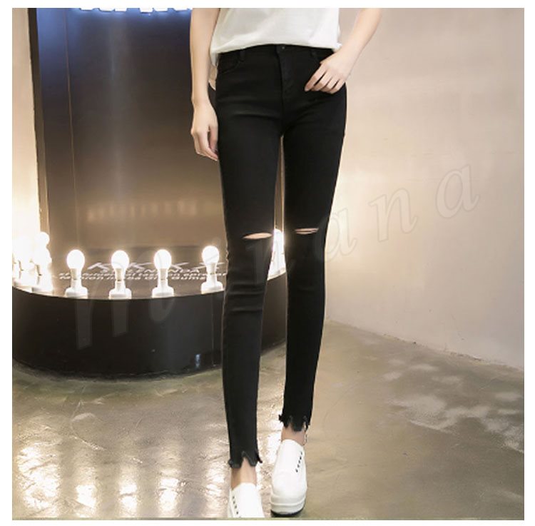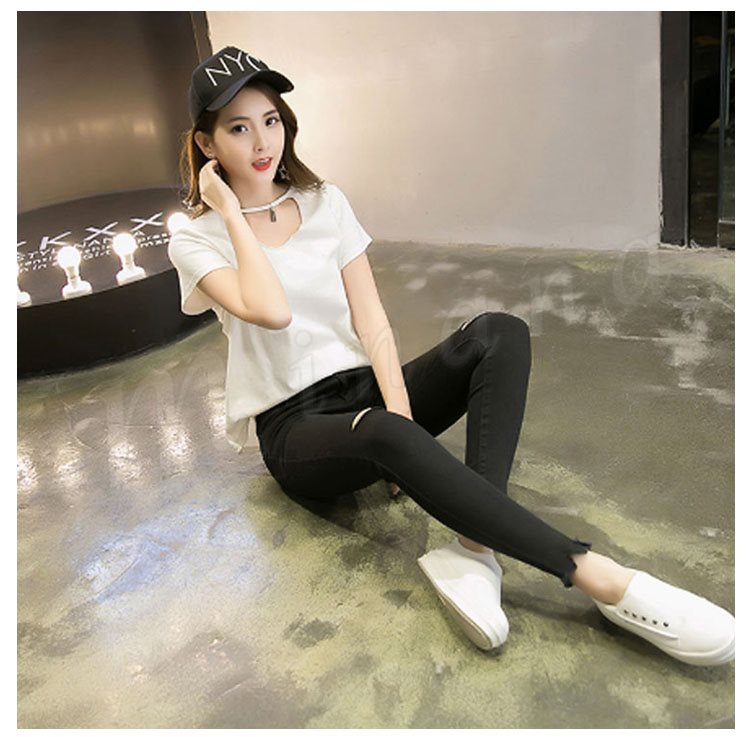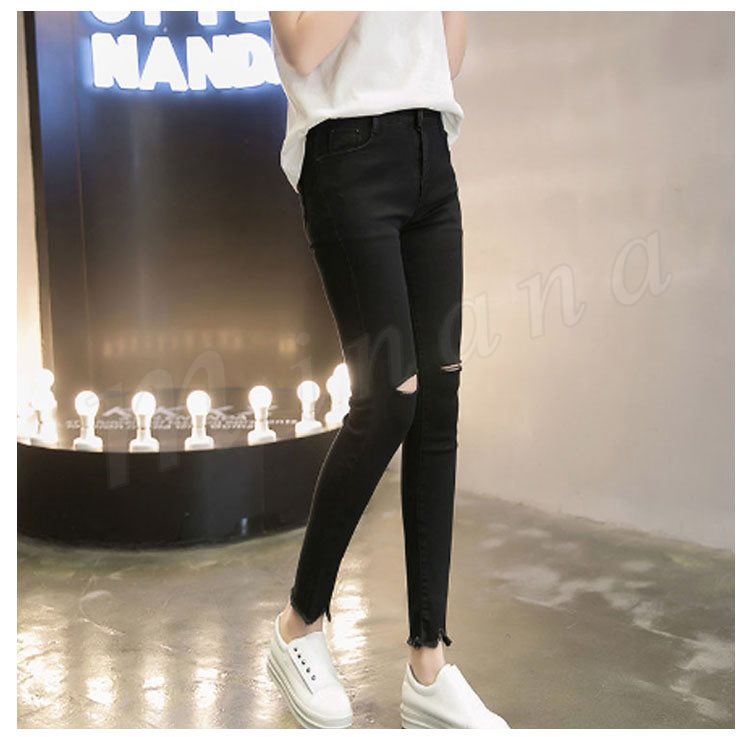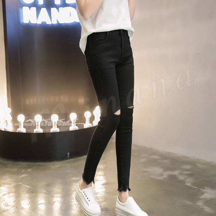 ボトムス パンツ デニム スキニー ダメージ クラッシュ ハイウエスト 膝あき 美脚 白 黒