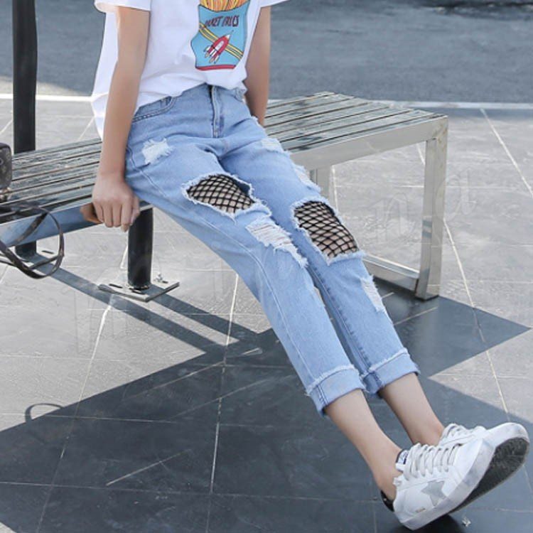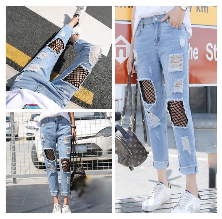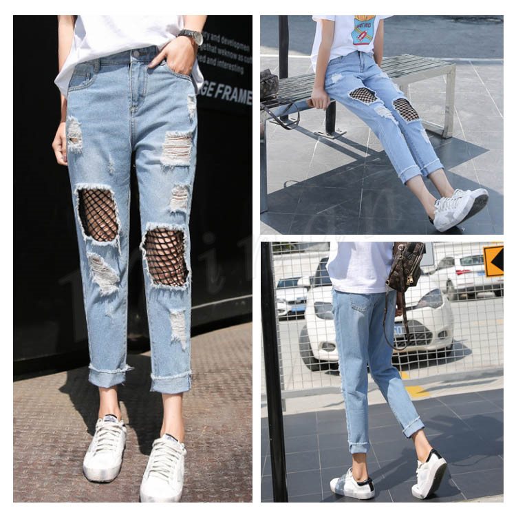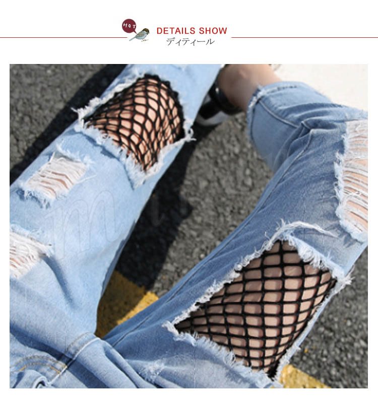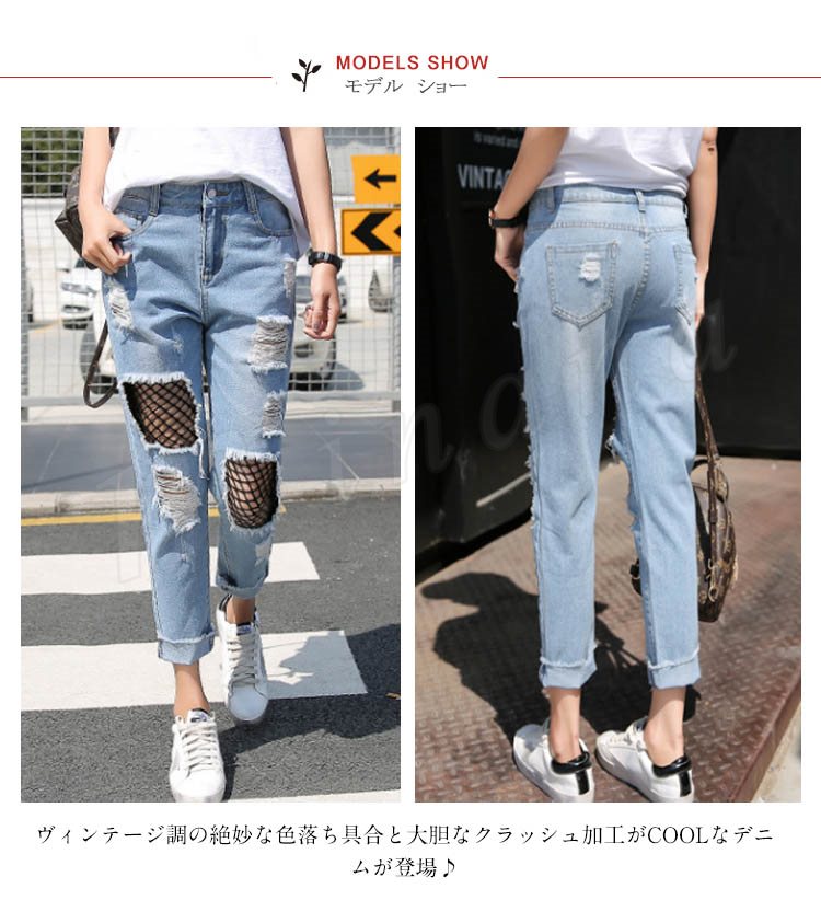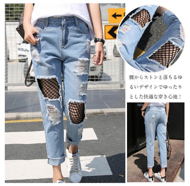 レディース ヴィンテージ デニム メッシュレイヤード 網付きジーンズ ウォッシュ クラッシュ ダメージ加工 ジーパン7サイズ