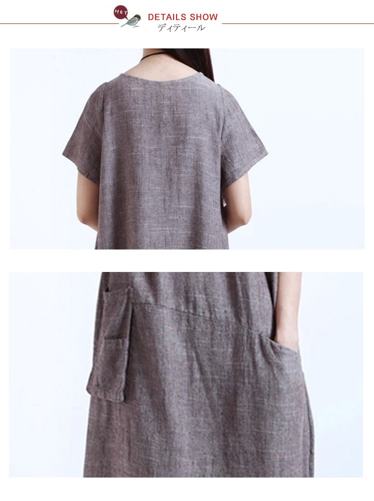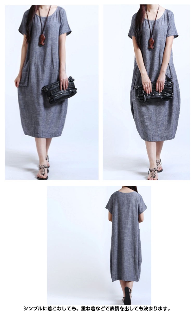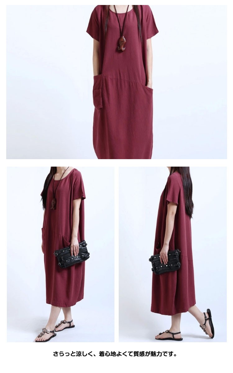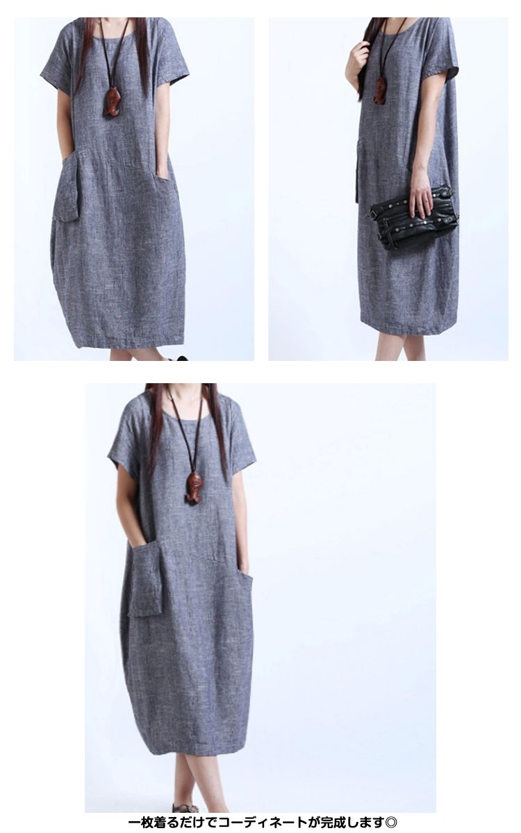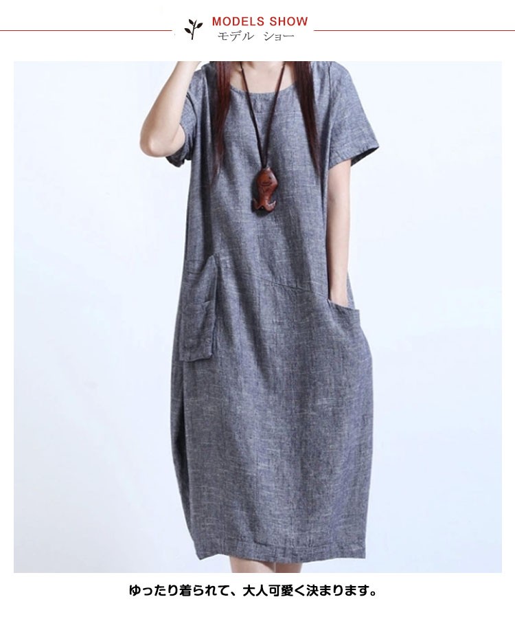 ワンピースロング丈夏半袖リネンレディースワンピースAライン無地ゆったりワンピース森ガール