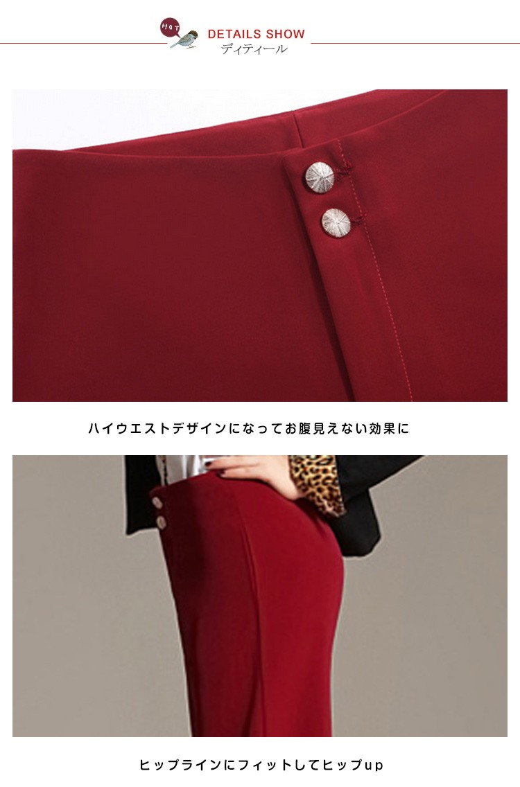 ハイウエストデザインで腰位置を高く見せて、脚の直線を強調して脚をより長く見せる効果があります。