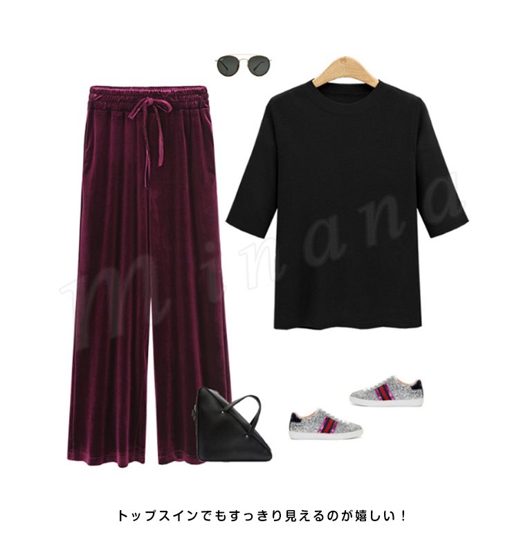 | 素材で魅せるベロアワイドパンツが新登場! 光沢感のあるベロア生地は秋冬の必需品なので1本は持っていたいアイテムです。 日常動作を妨げずにノンストレスの楽チンな着心地を実感して頂ける、柔らかい生地感が魅力的♪ トップスインでもすっきり見えるのが嬉しい! | |