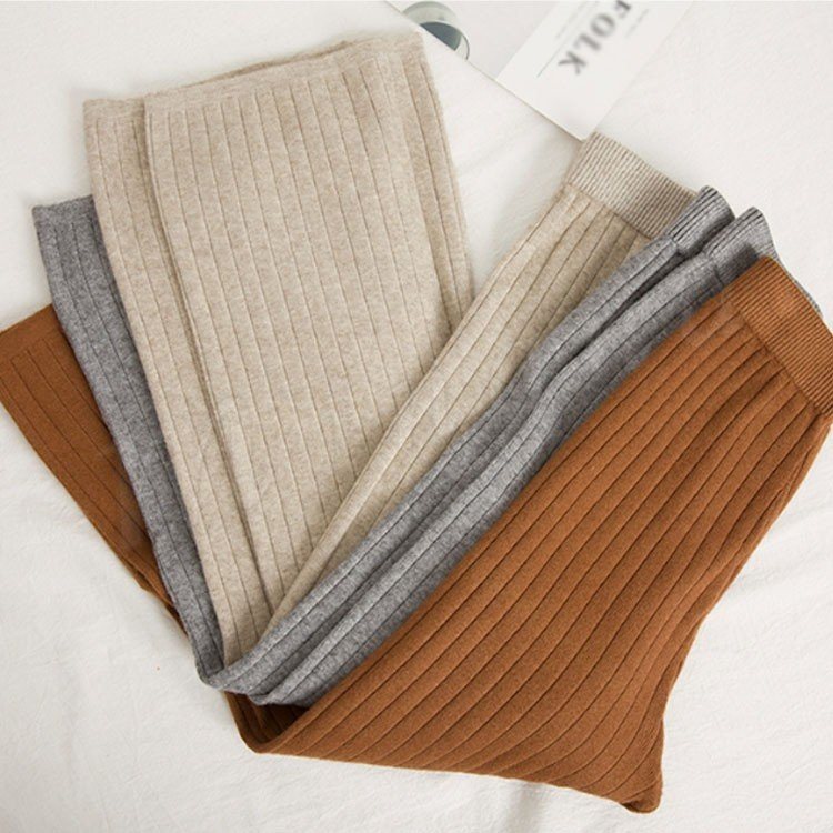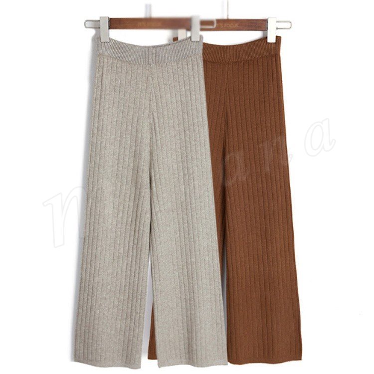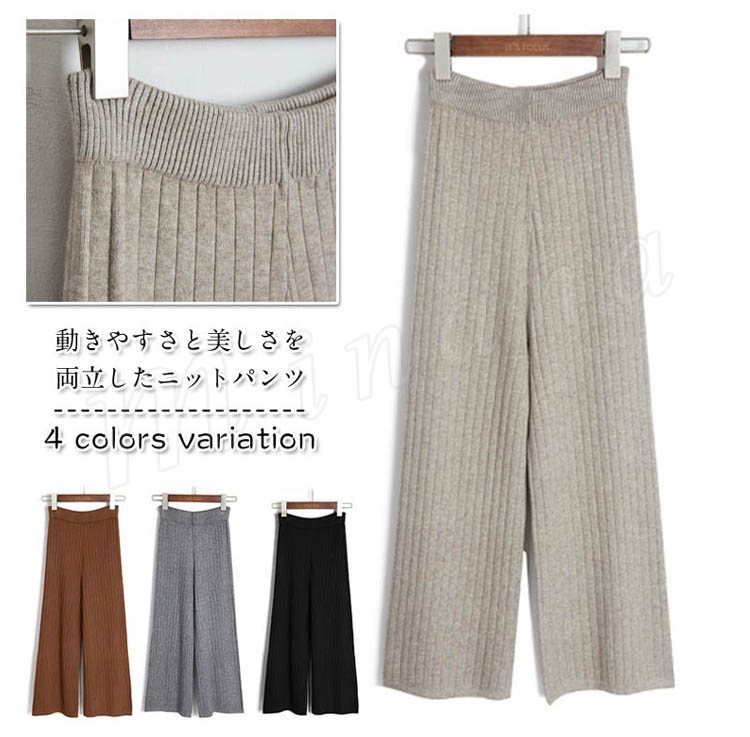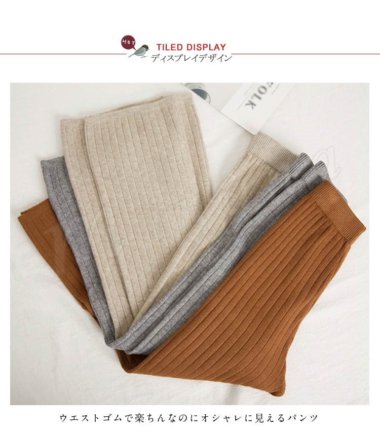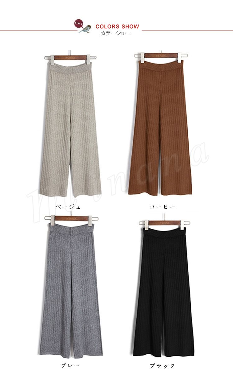 ニットパンツ/レディース/ワイドパンツ/ガウチョパンツ/九分丈パンツ/無地パンツ/ズボン/ボトムス/ウェストゴム/ハイウェスト/純色/体型カバ