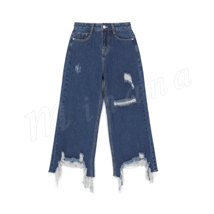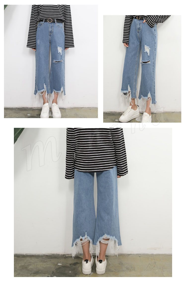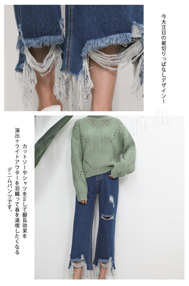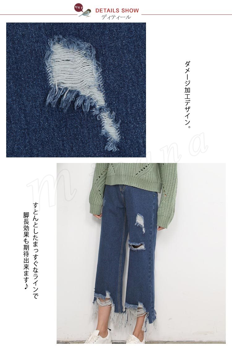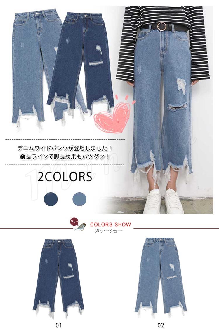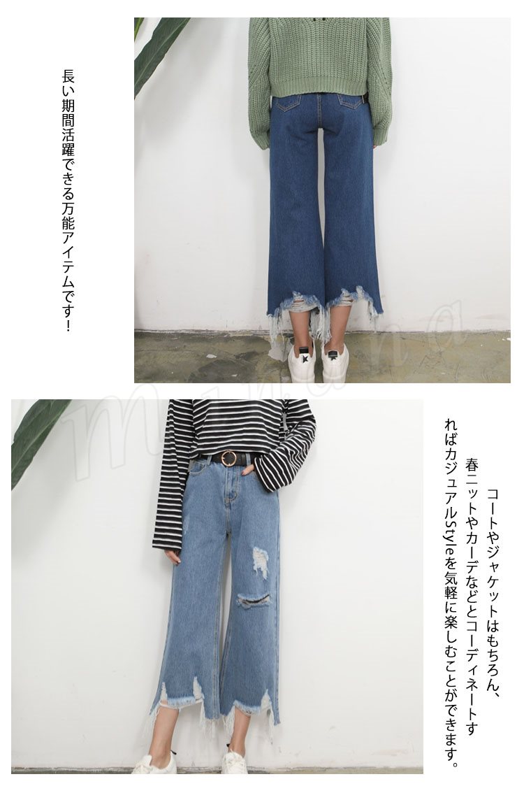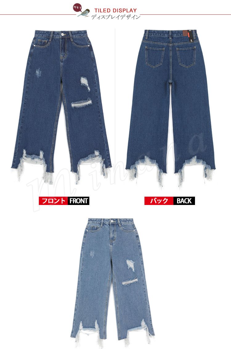 ダメージ加工 デニム ワイドパンツ 裾切りっぱなし 裾フリンジ 7分丈 デニム パンツ ガウチョパンツ デニムパンツ ストレートパンツ ウォッ